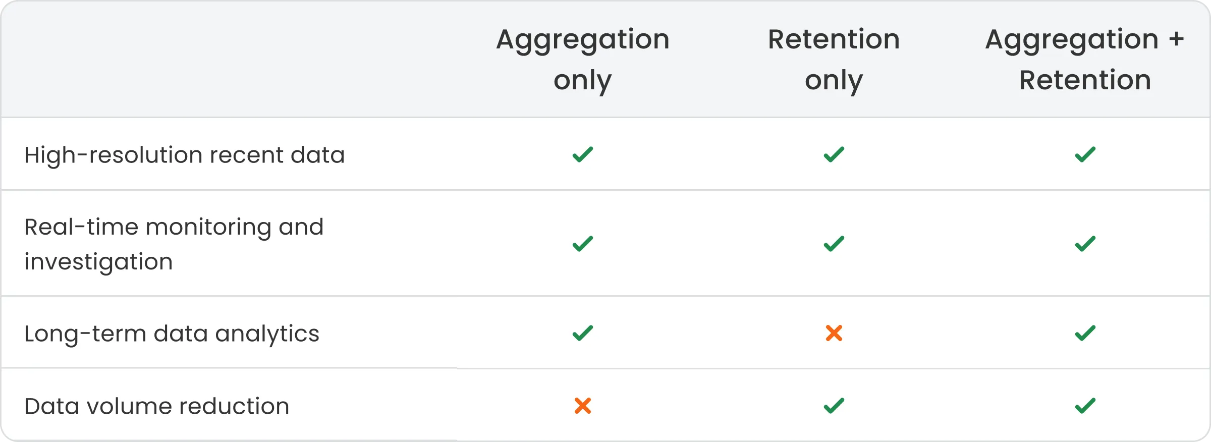 Combining aggregation with explicit data retention rules defines a complete telemetry data lifecycle. Aggregation and retention address different aspects of telemetry storage and are most effective when used together.