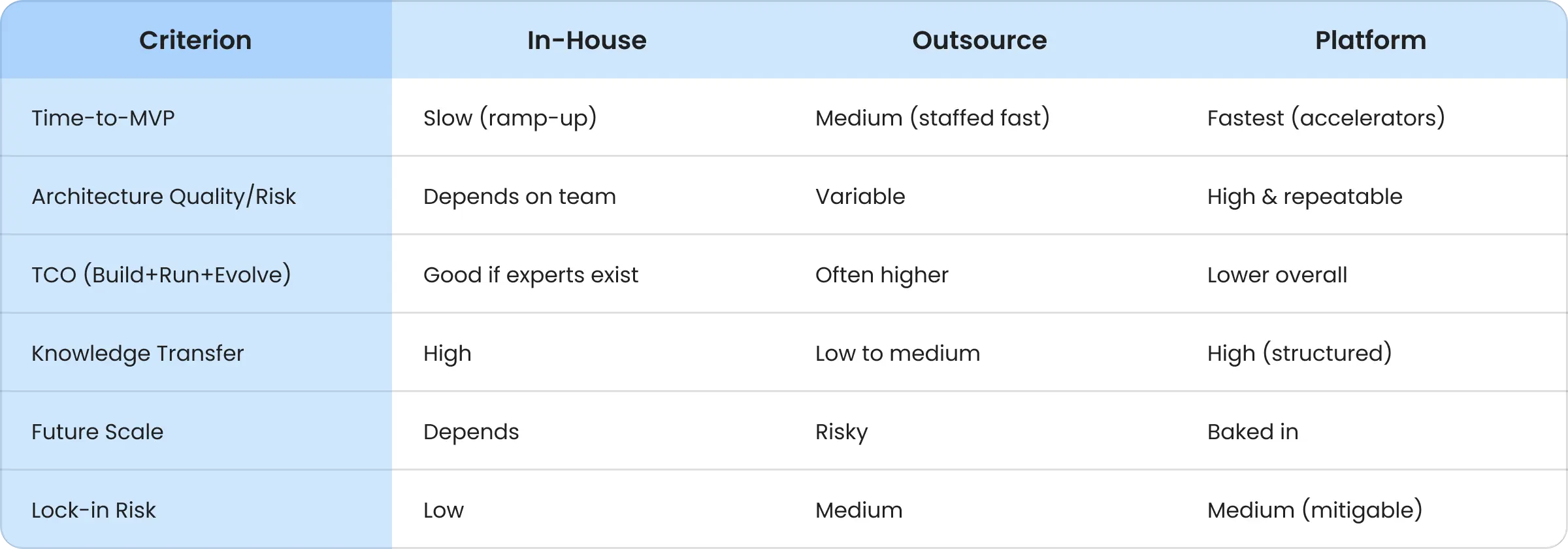 If your project’s success depends on time-to-value, built-in security, and future scalability, the scorecard will almost always favor the Platform Team. It’s the path that delivers production-grade results quickly while protecting your long-term architectural integrity.