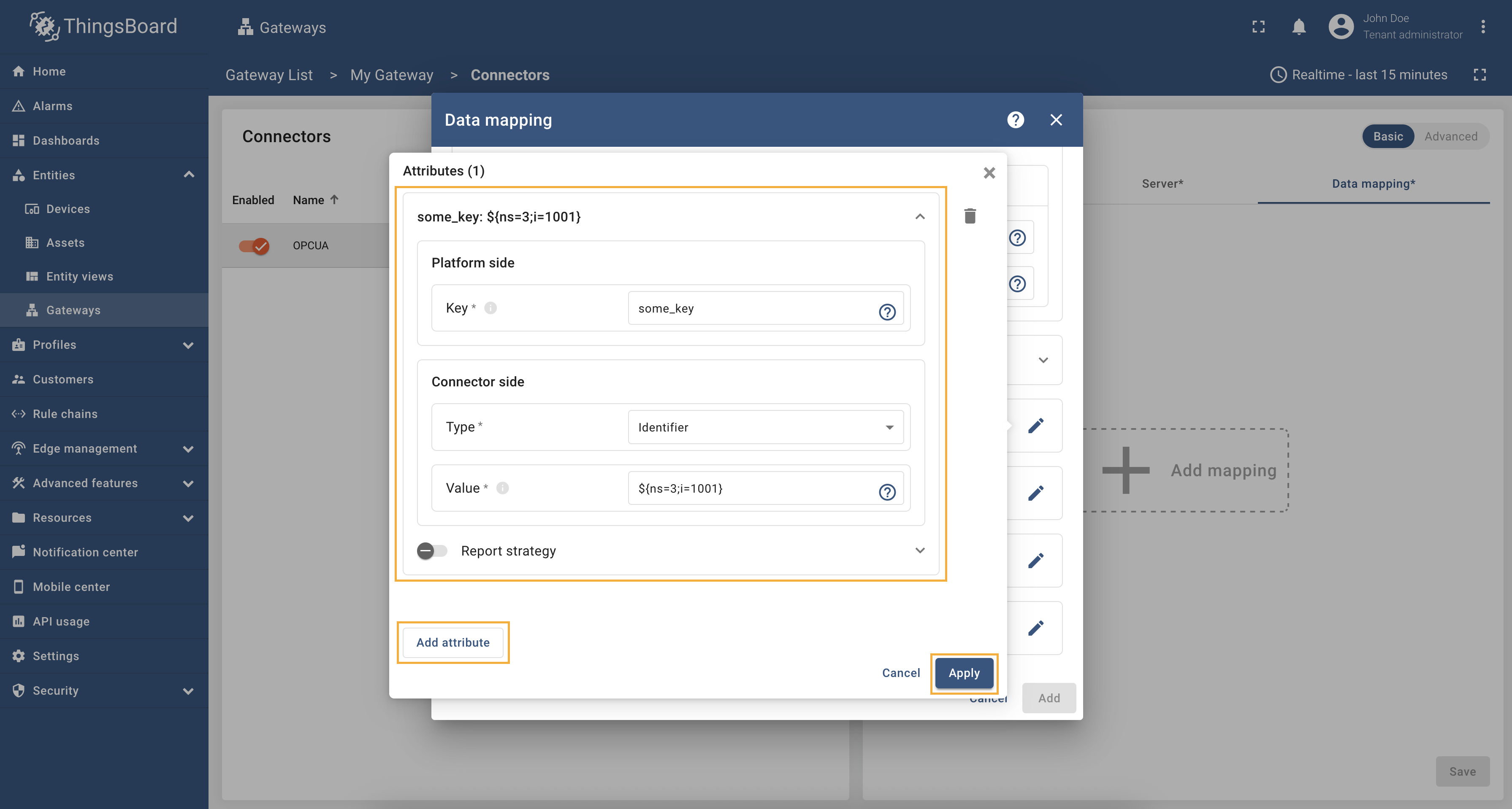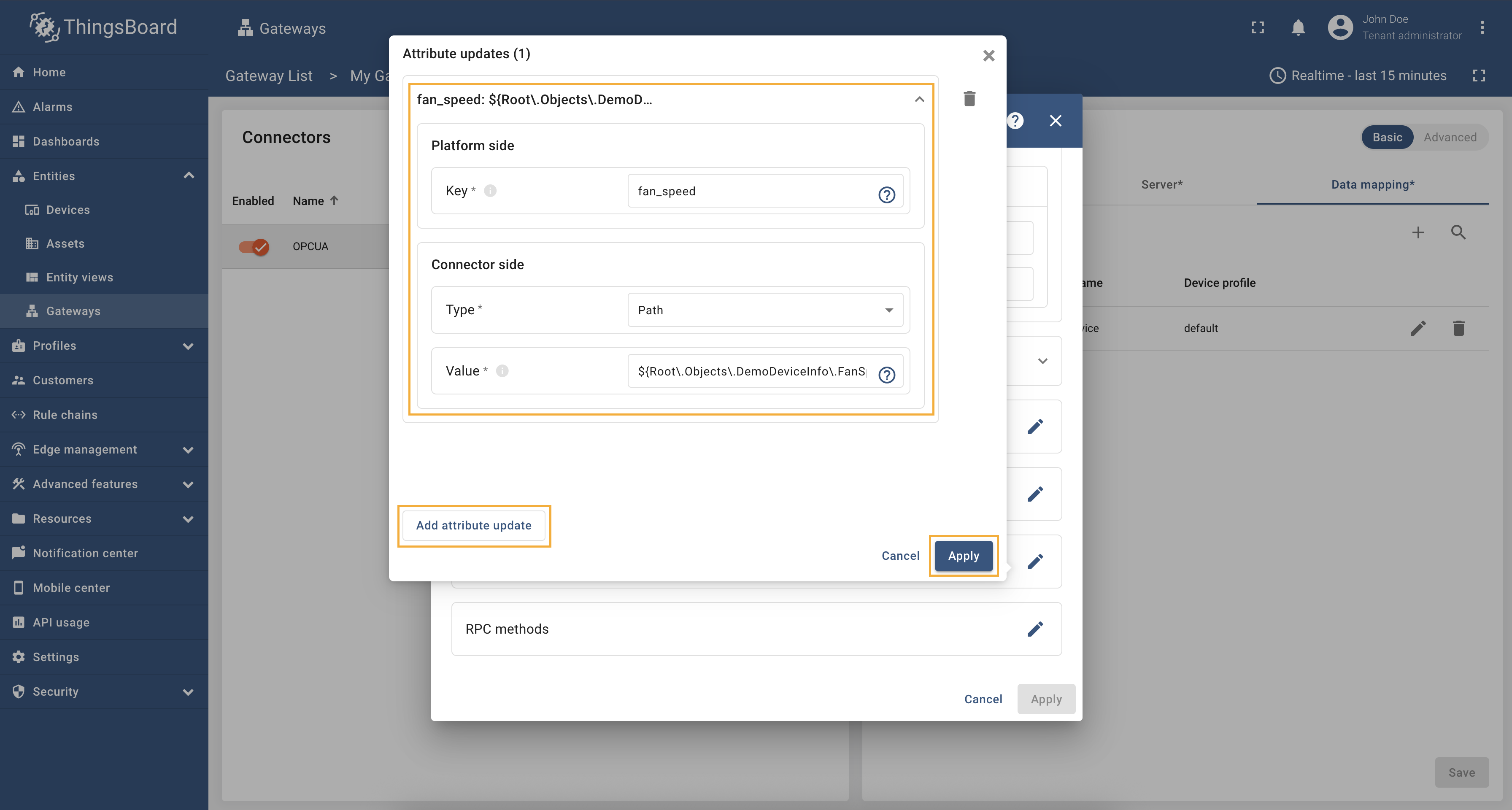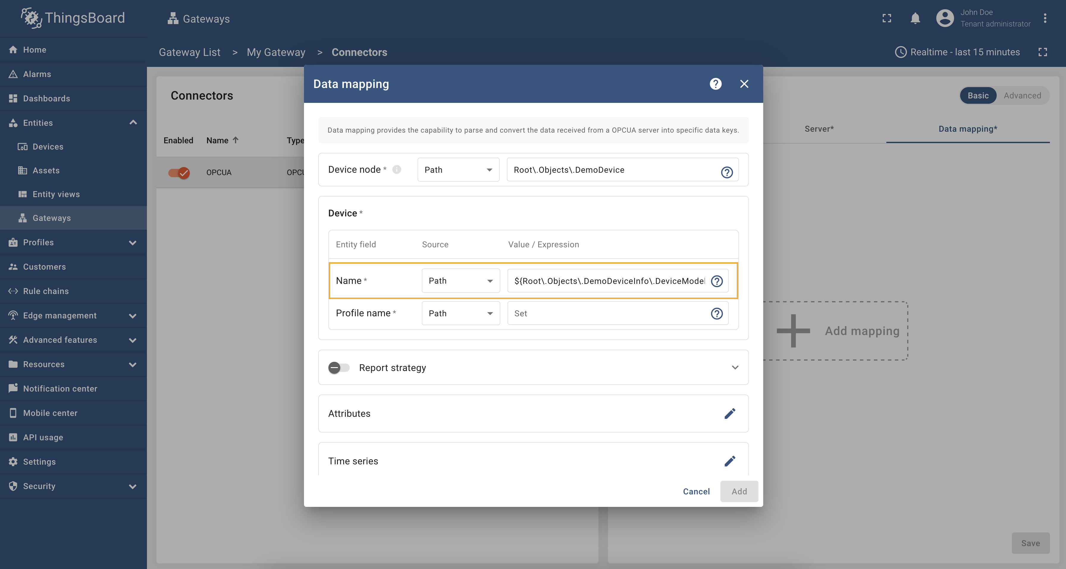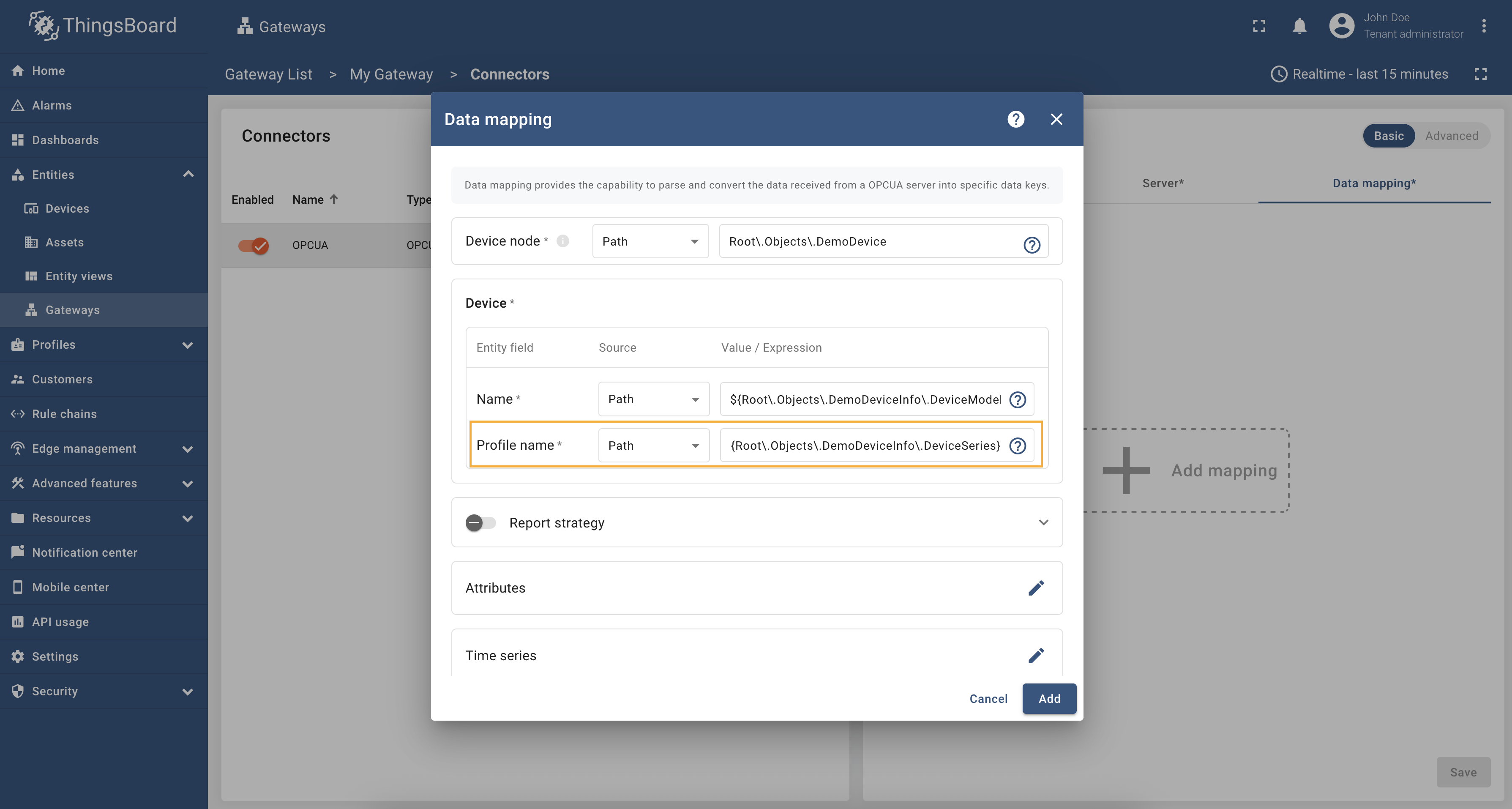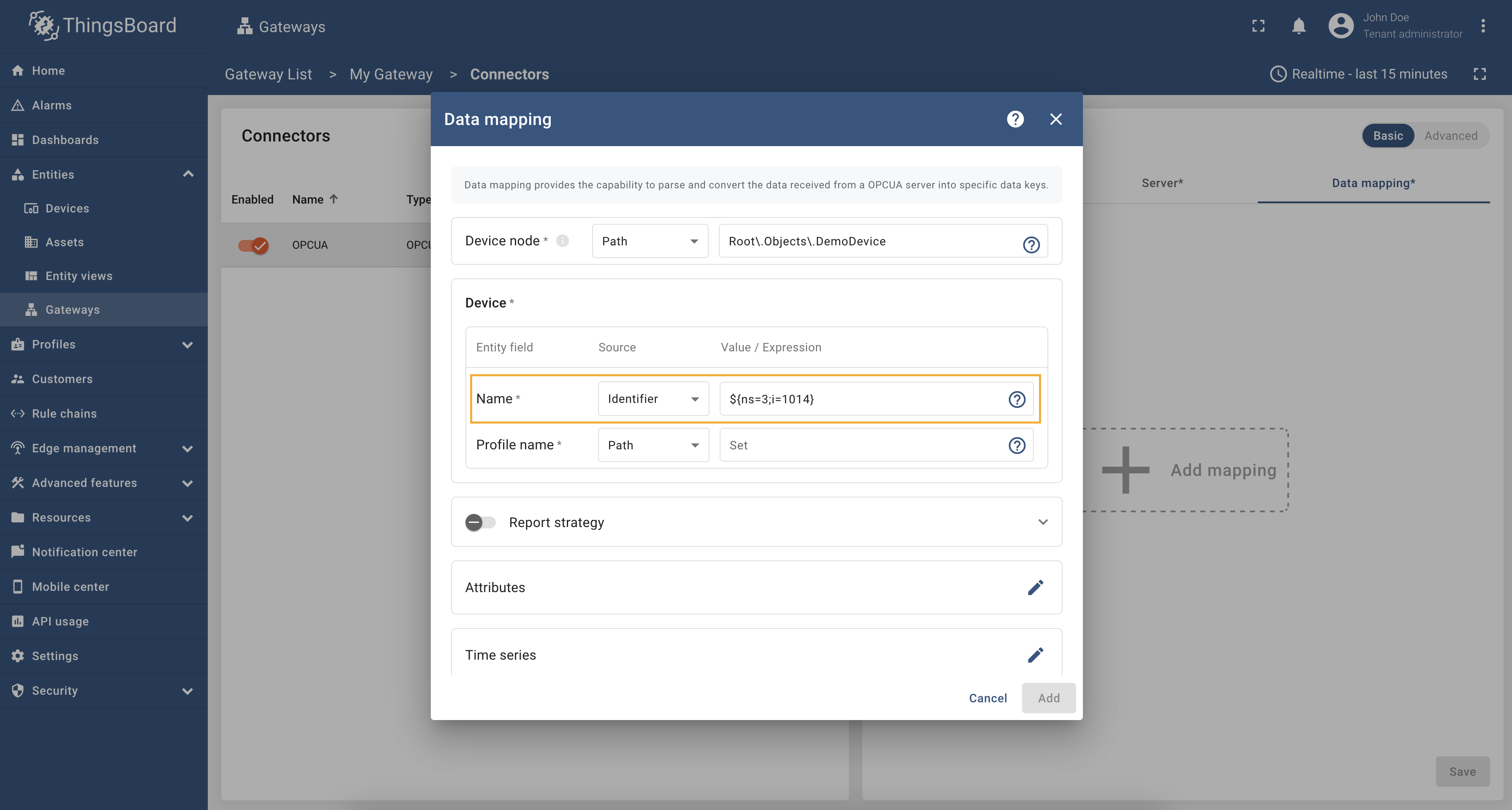 ThingsBoard devices. It allows you to specify which nodes from the OPC-UA server will be used as device names,