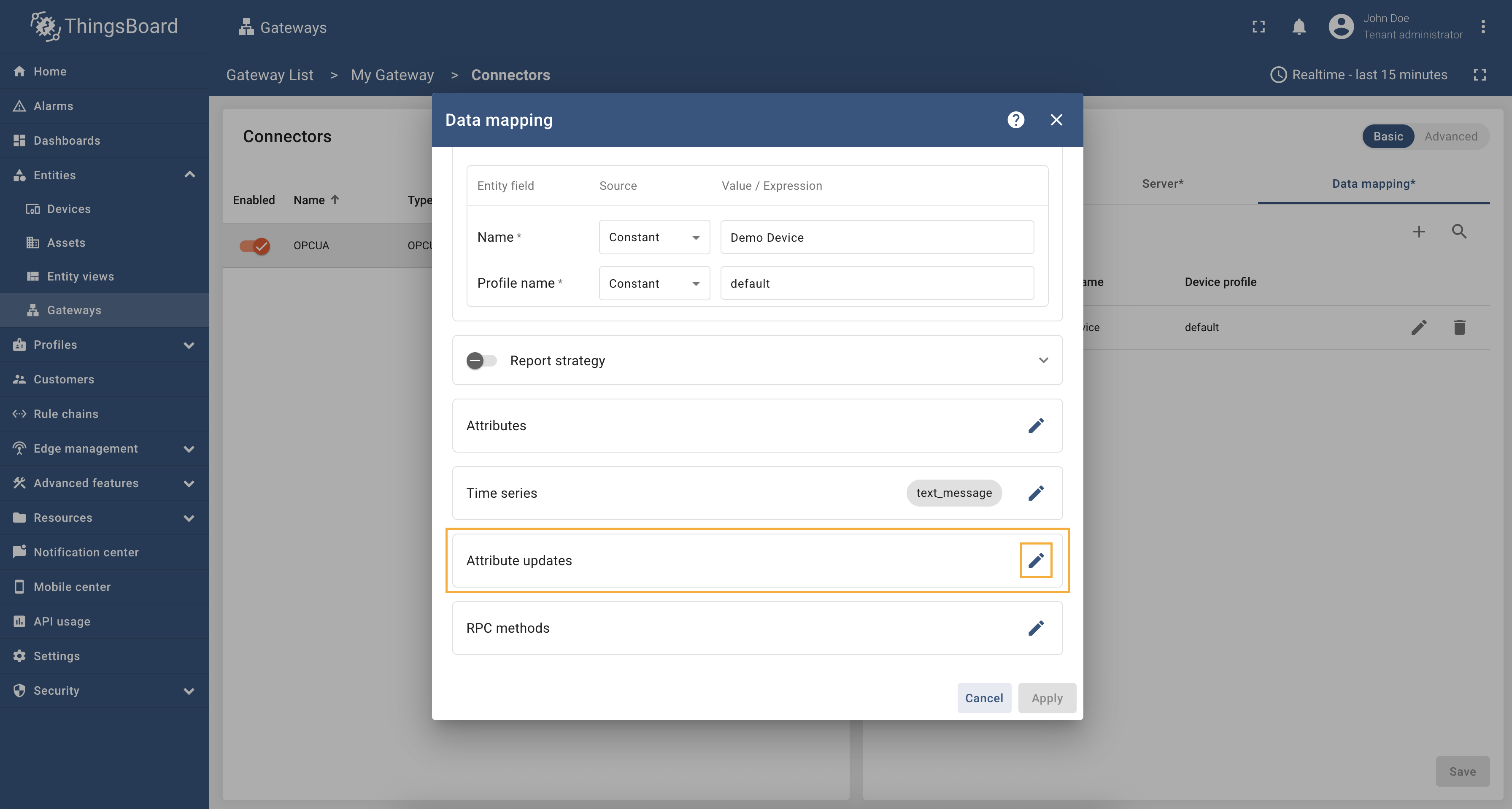 "mapping":[{"deviceNodeSource":"path","deviceNodePattern":"Root\\.Objects\\.MyObject","deviceInfo":{"deviceNameExpression":"OPCUA New Advanced Device","deviceNameExpressionSource":"path","deviceProfileExpression":"some other default 1","deviceProfileExpressionSource":"constant"},"attributes":[],"timeseries":[],"attributes_updates":[],"rpc_methods":[],},]