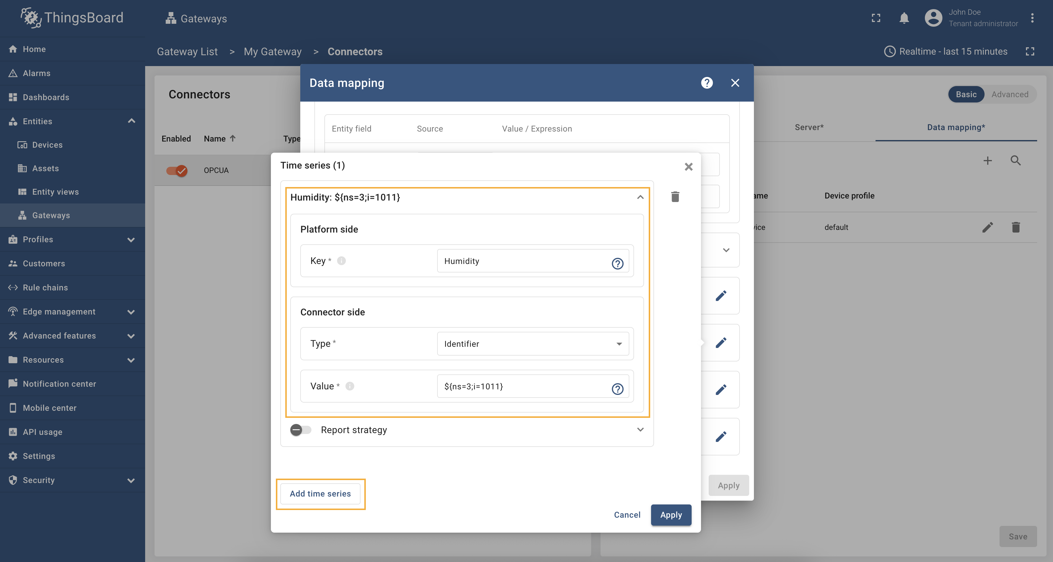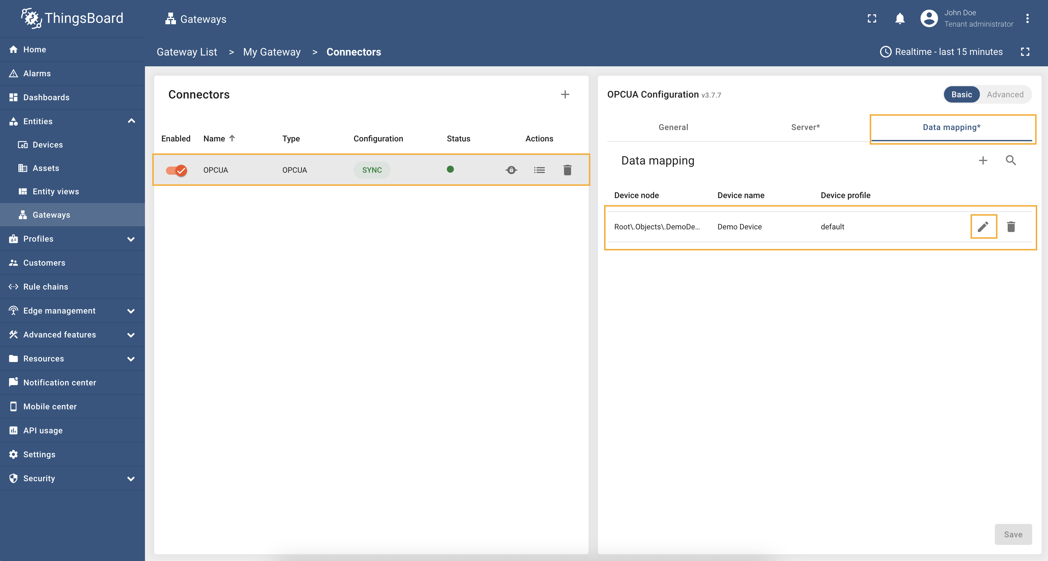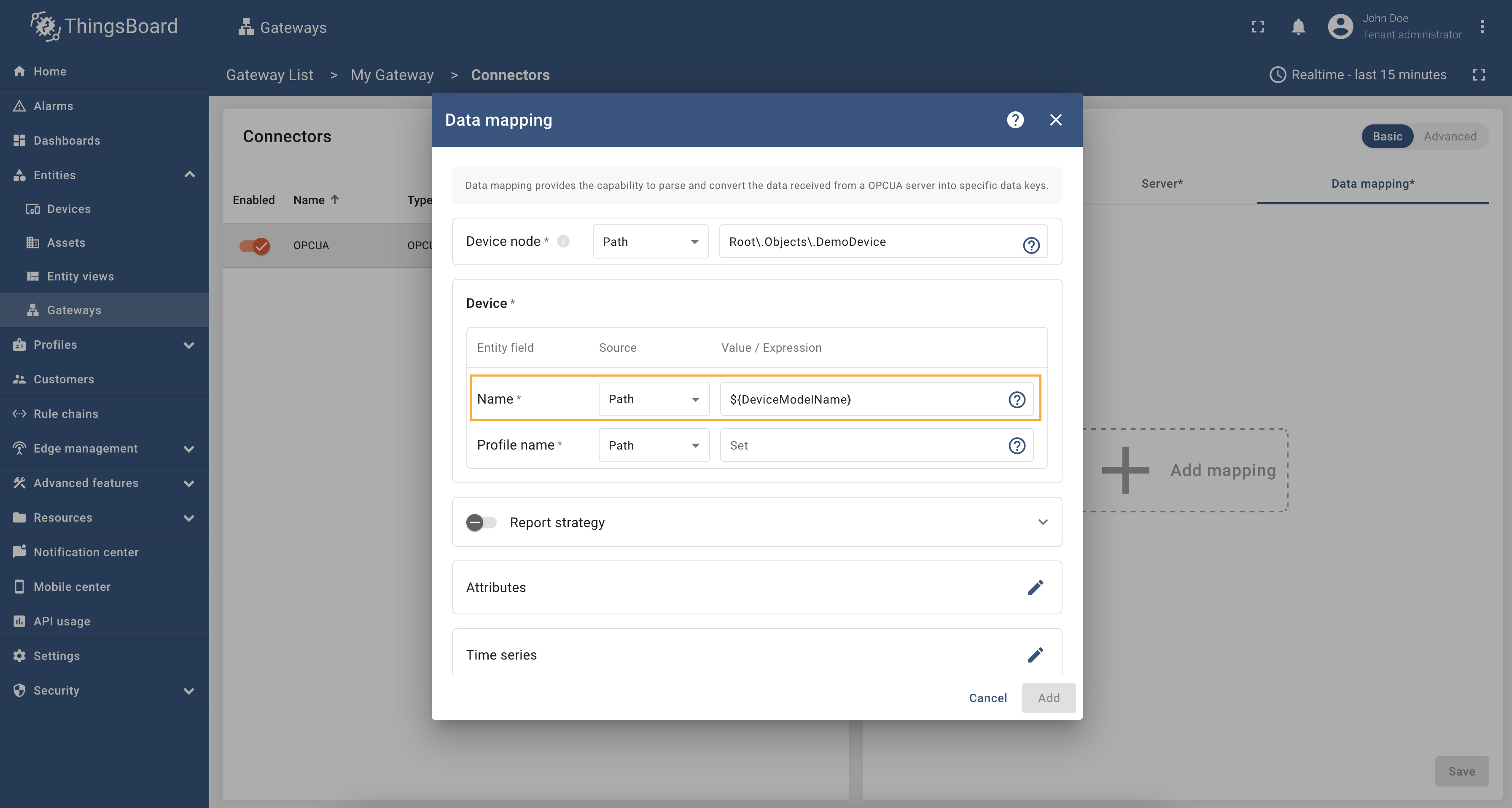 Let’s configure the device name and profile in the OPC-UA connector. For this purpose, follow these steps: