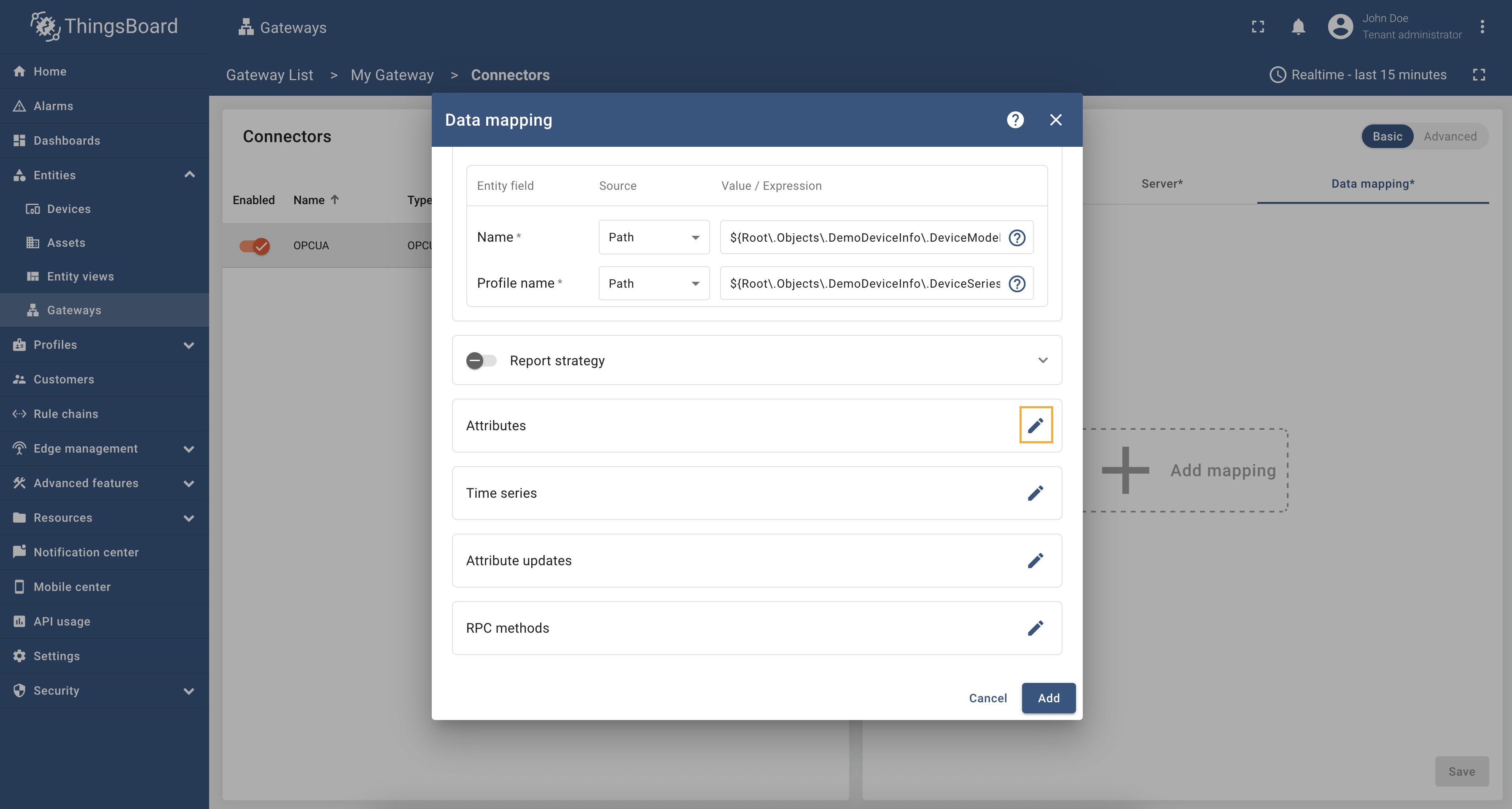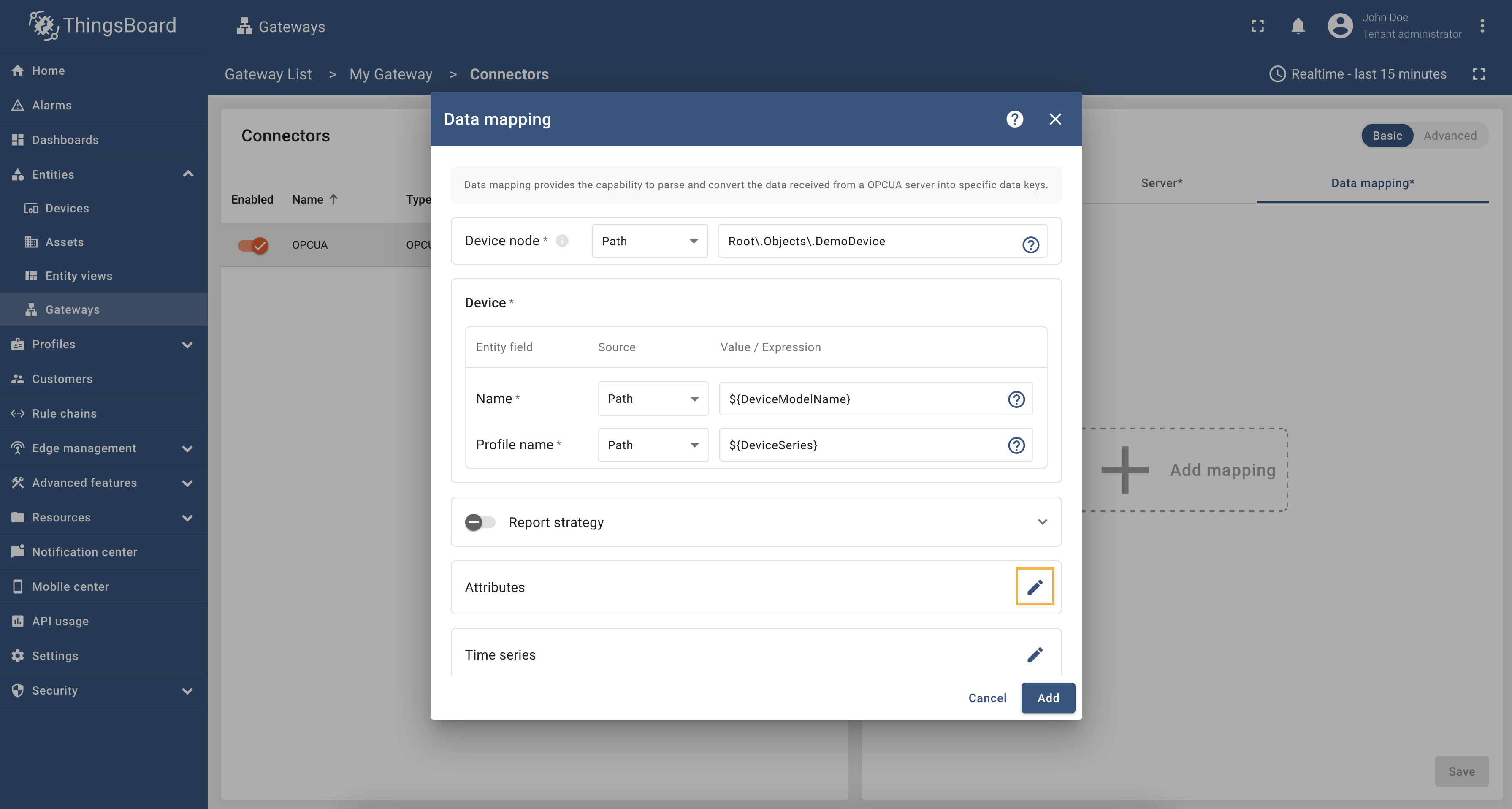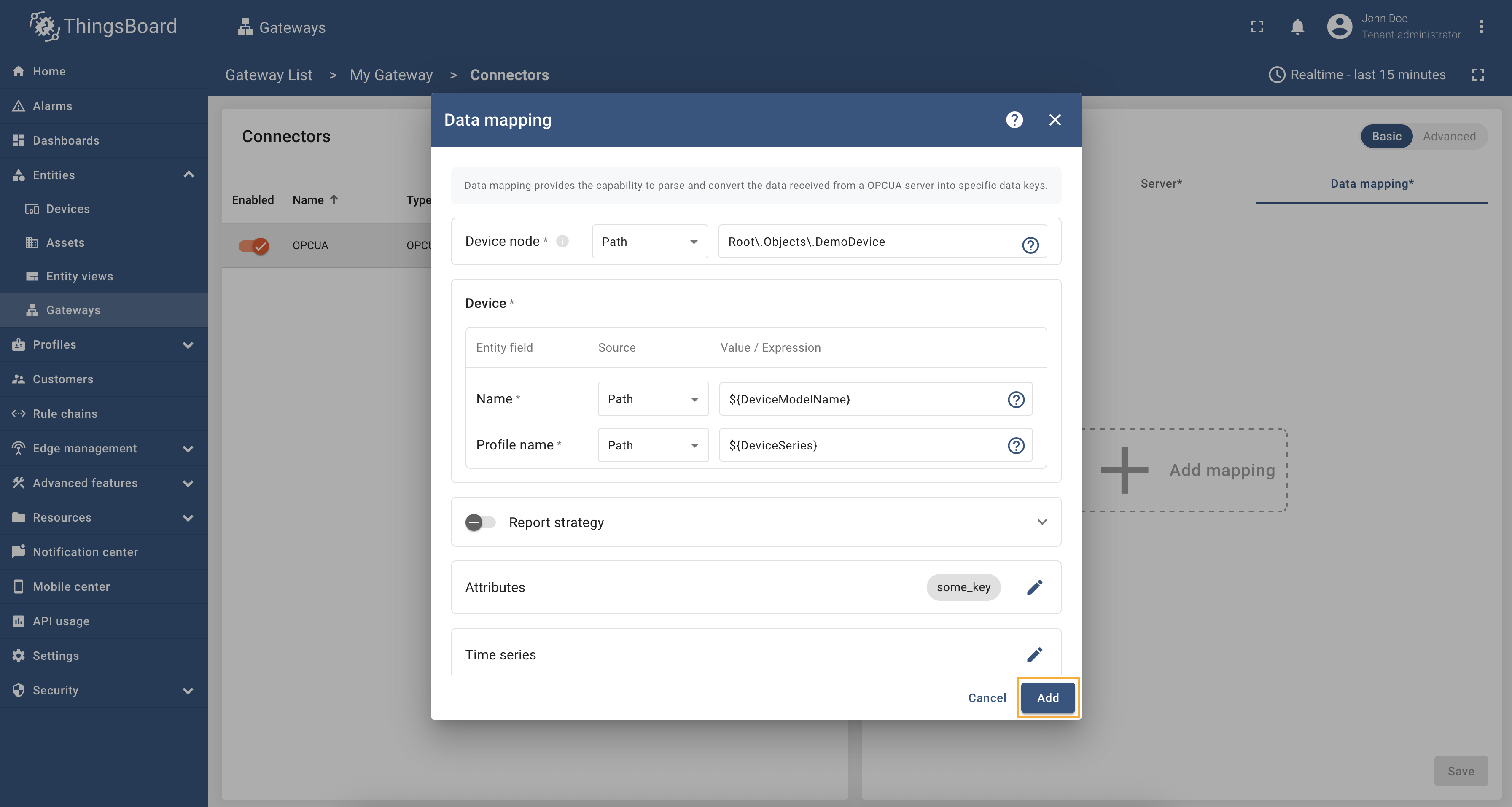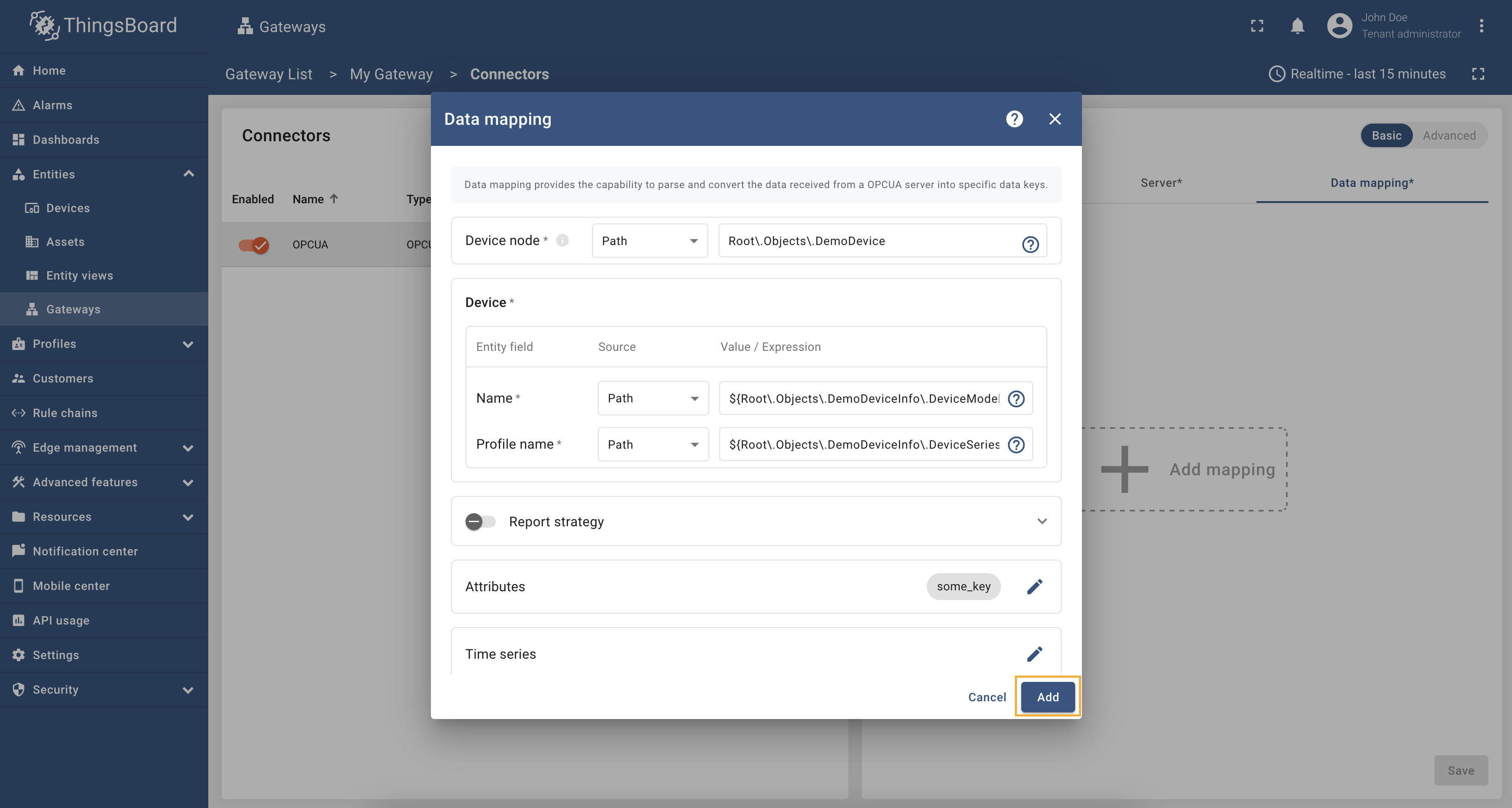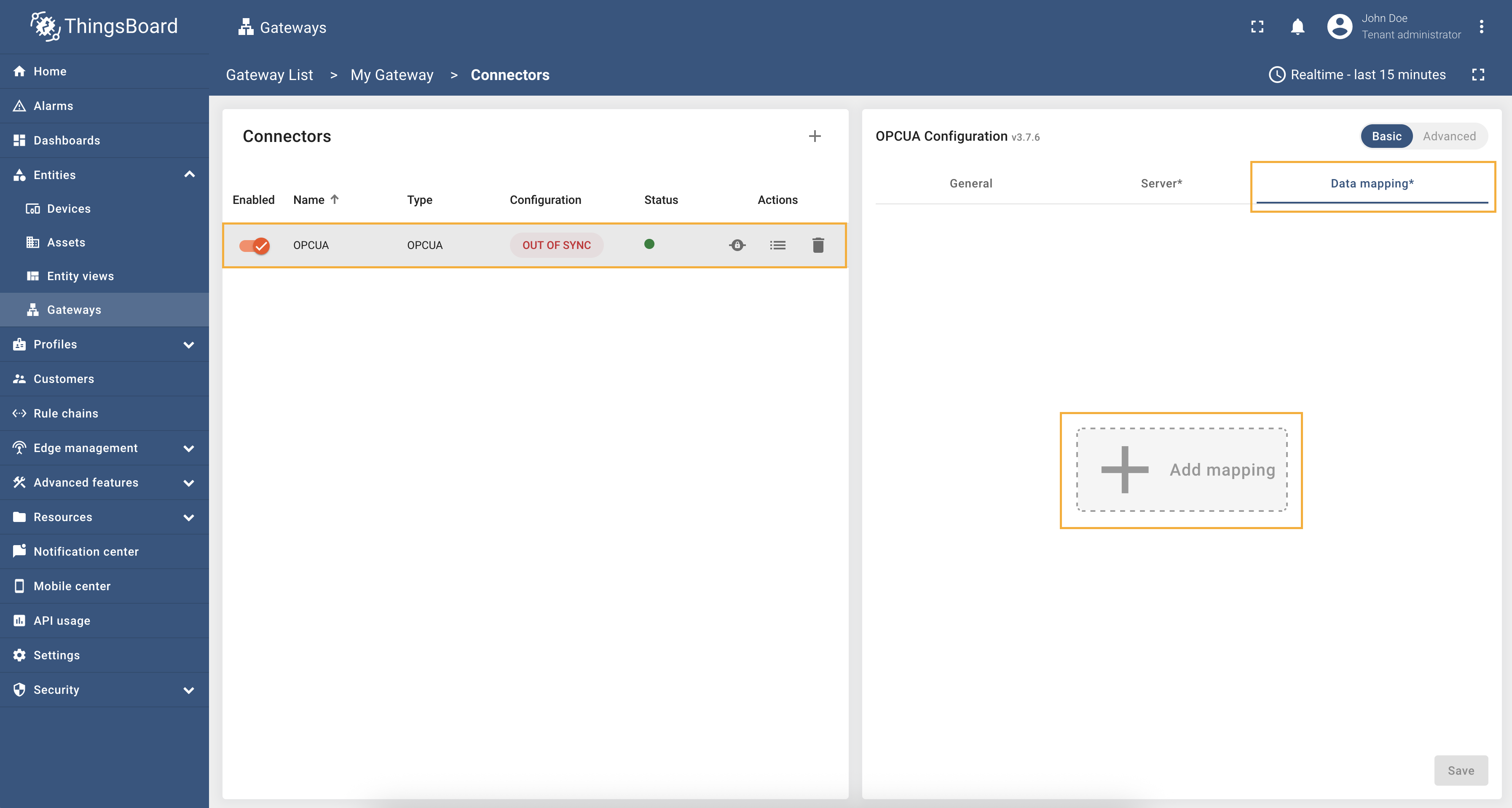Select the created OPC-UA connector, click on the “Data mapping” tab. Firstly, we need to configure parent (or device) node. Click on the “+ Add mapping” button.