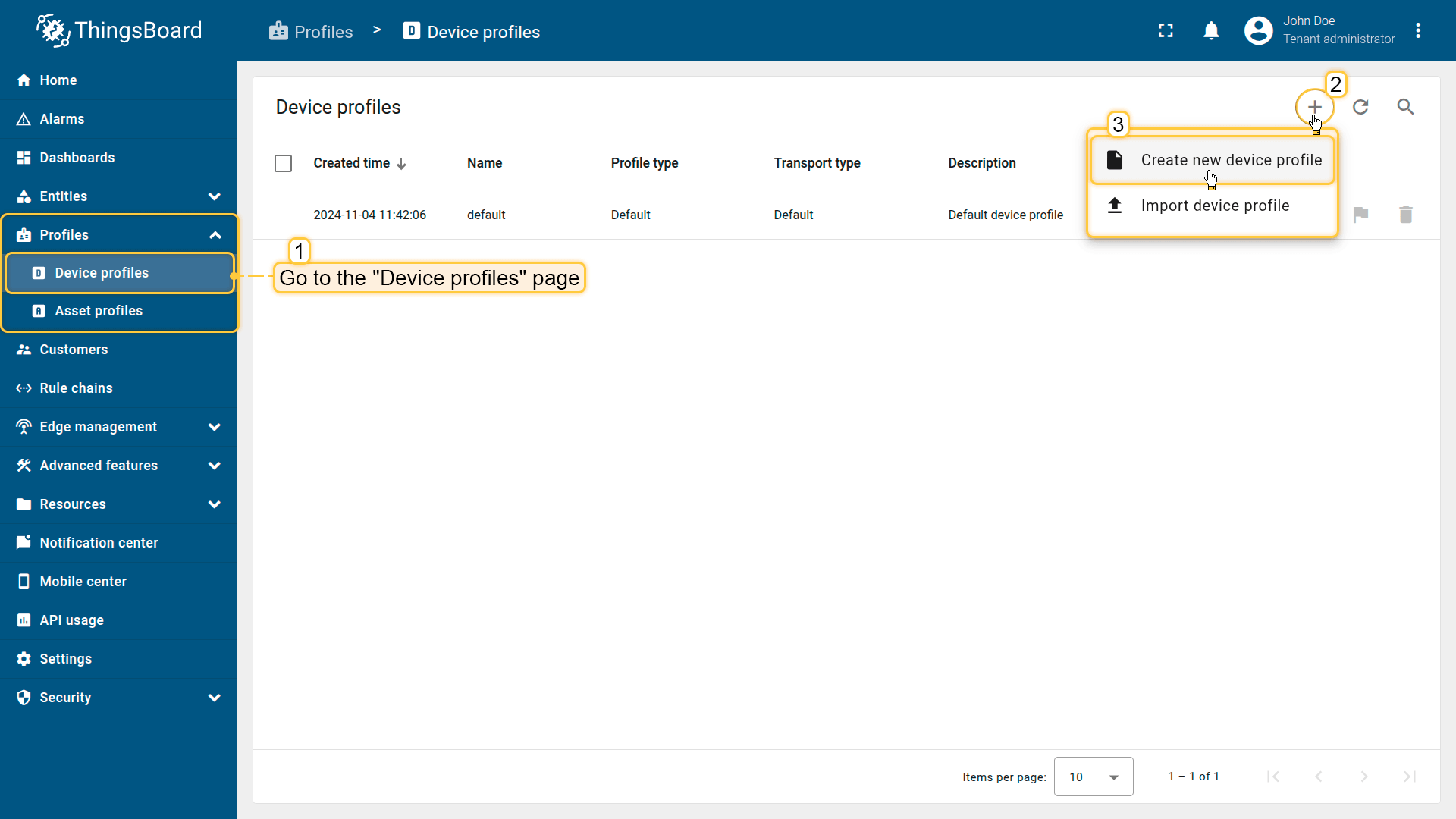 - Go to the “Devices profile” page, click the “plus” button and select “Create new device profile” from drop-down menu.