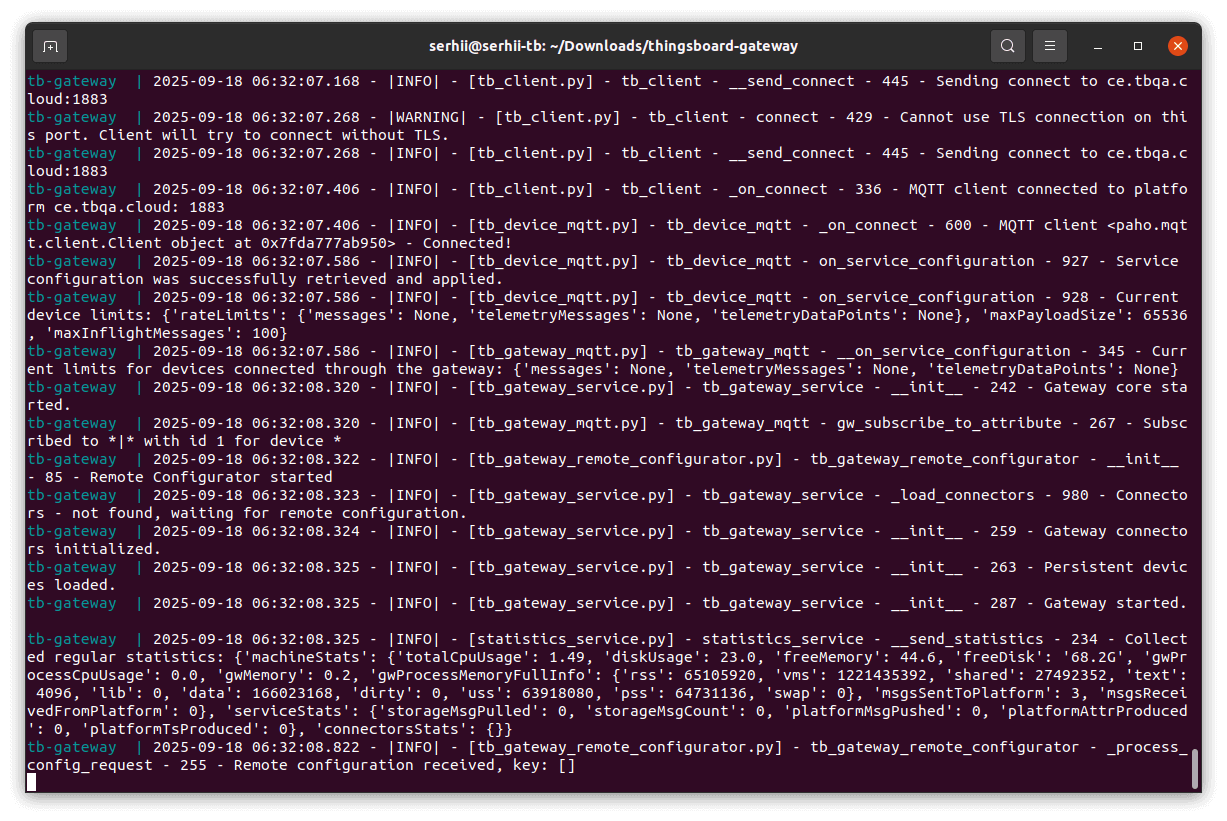 The ThingsBoard IoT Gateway supports the device provisioning feature, allowing it to automatically register itself on the ThingsBoard platform and obtain credentials without manual setup.