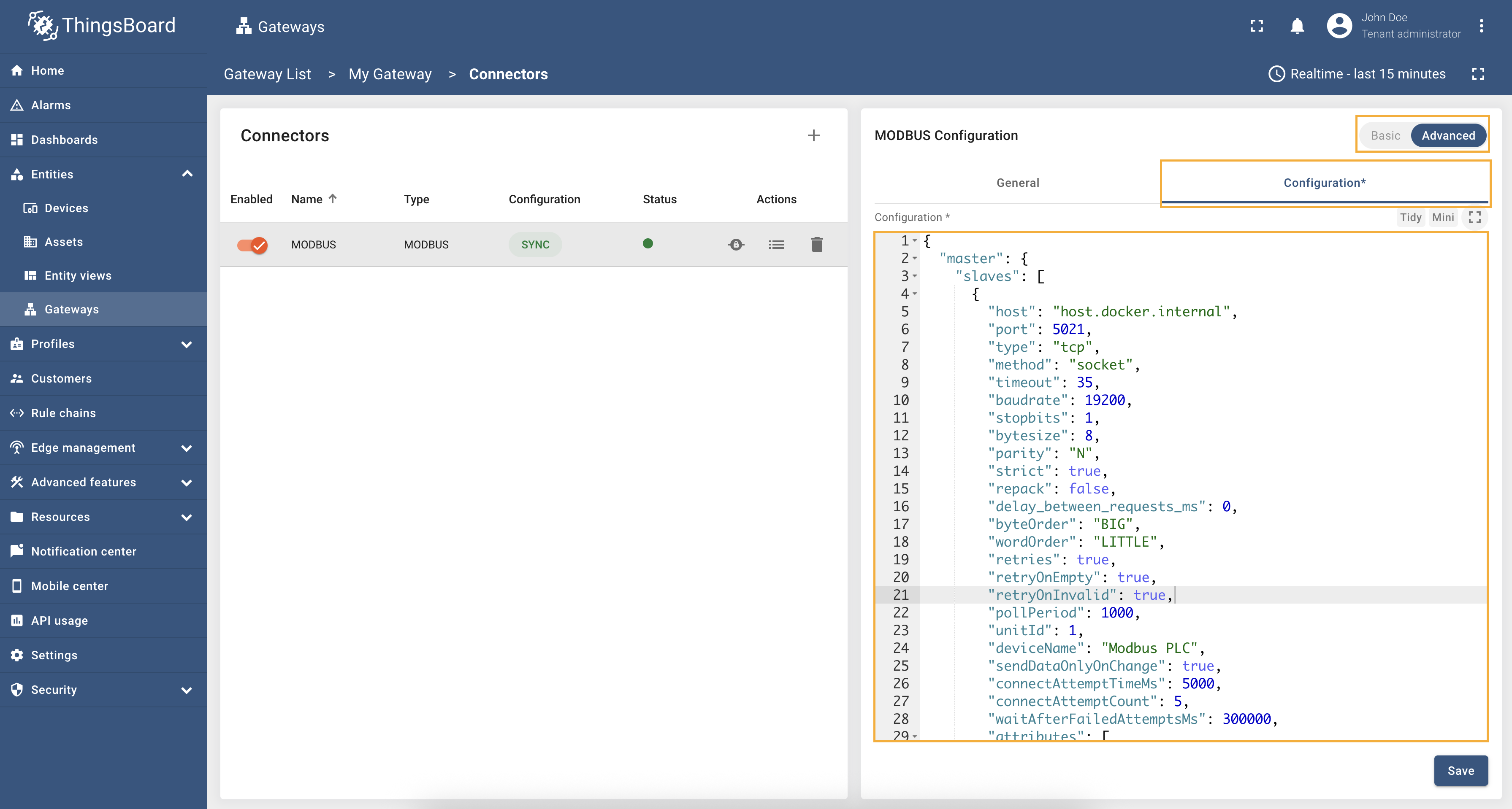 In this guide, we have walked you through the process of connecting a Modbus device to ThingsBoard CE using the ThingsBoard IoT Gateway. By following the steps outlined in this guide, you have successfully set up the gateway, configured the Modbus connector, and mapped data points to send telemetry and attributes to ThingsBoard. You have also learned how to monitor and visualize the data from your Modbus device in ThingsBoard CE. With the ThingsBoard IoT Gateway acting as a bridge between your Modbus device and ThingsBoard, you can now leverage the powerful features of ThingsBoard to analyze and manage your device data effectively. Whether you are monitoring environmental conditions, tracking energy consumption, or managing industrial processes, the integration of Modbus devices with ThingsBoard opens up new possibilities for data-driven decision-making and automation.