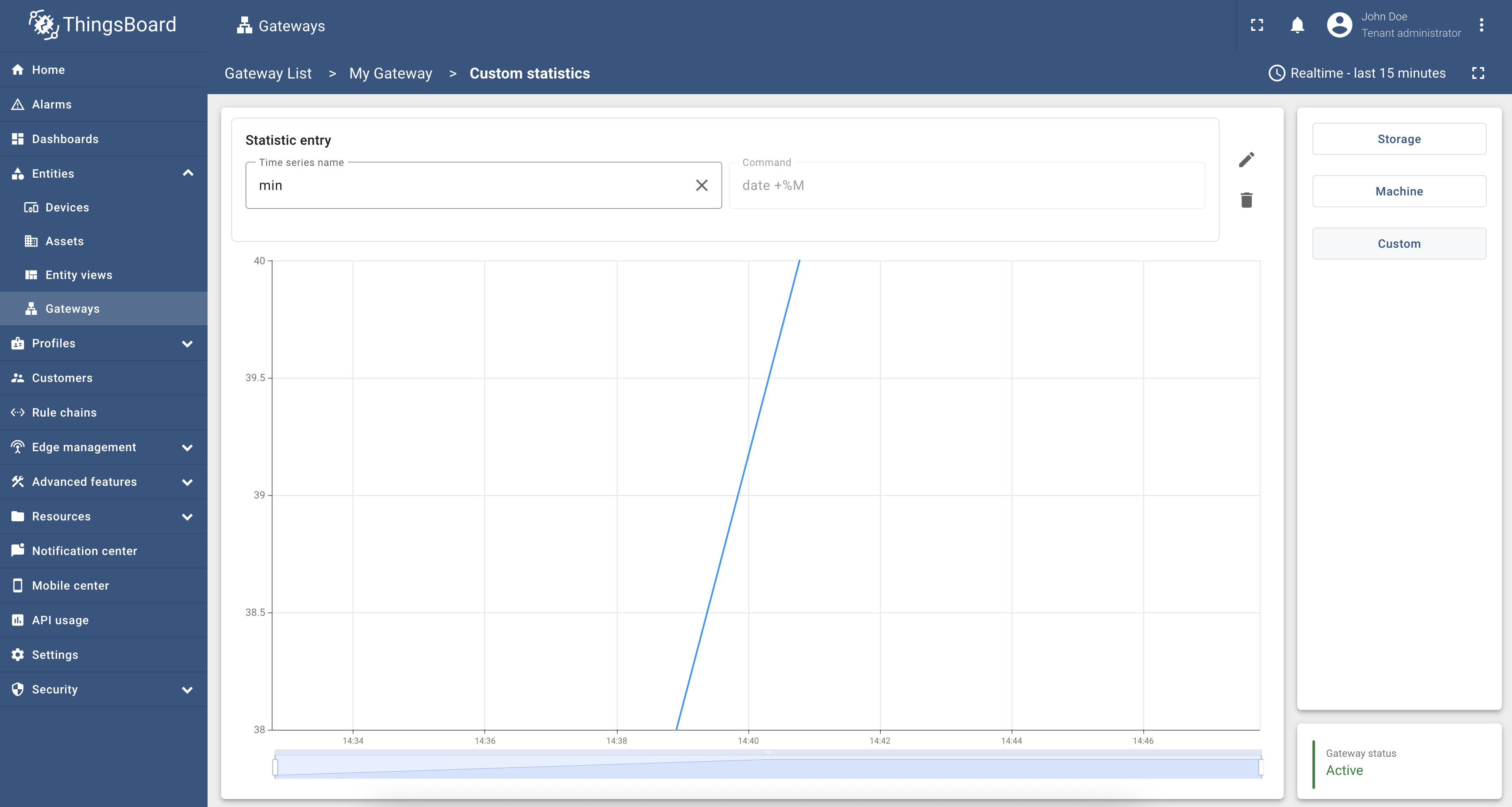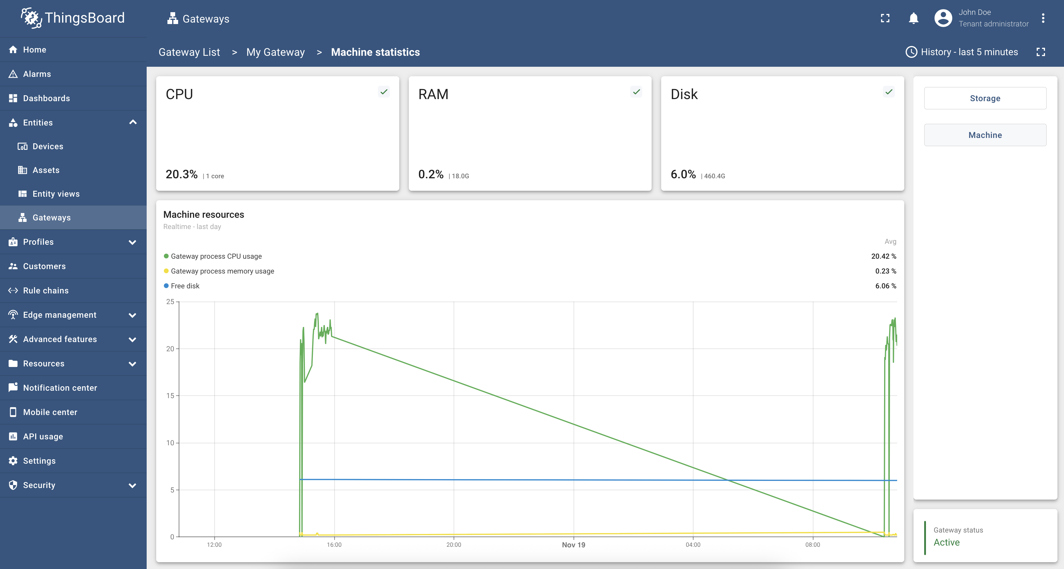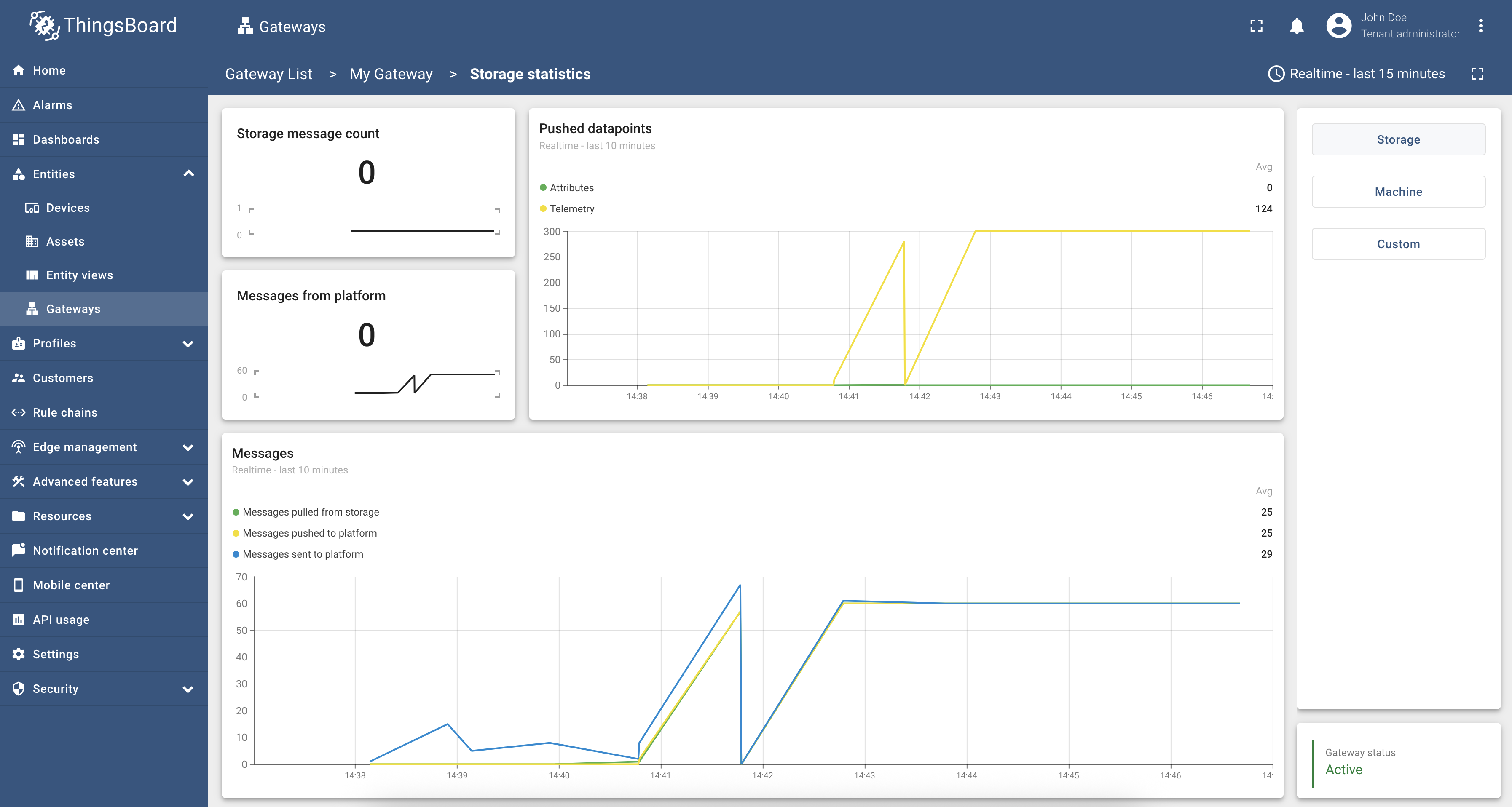 In the right sidebar you can switch between Storage, Machine and Custom statistics. Also, you can check gateway status in the real time in the bottom right corner of the page.