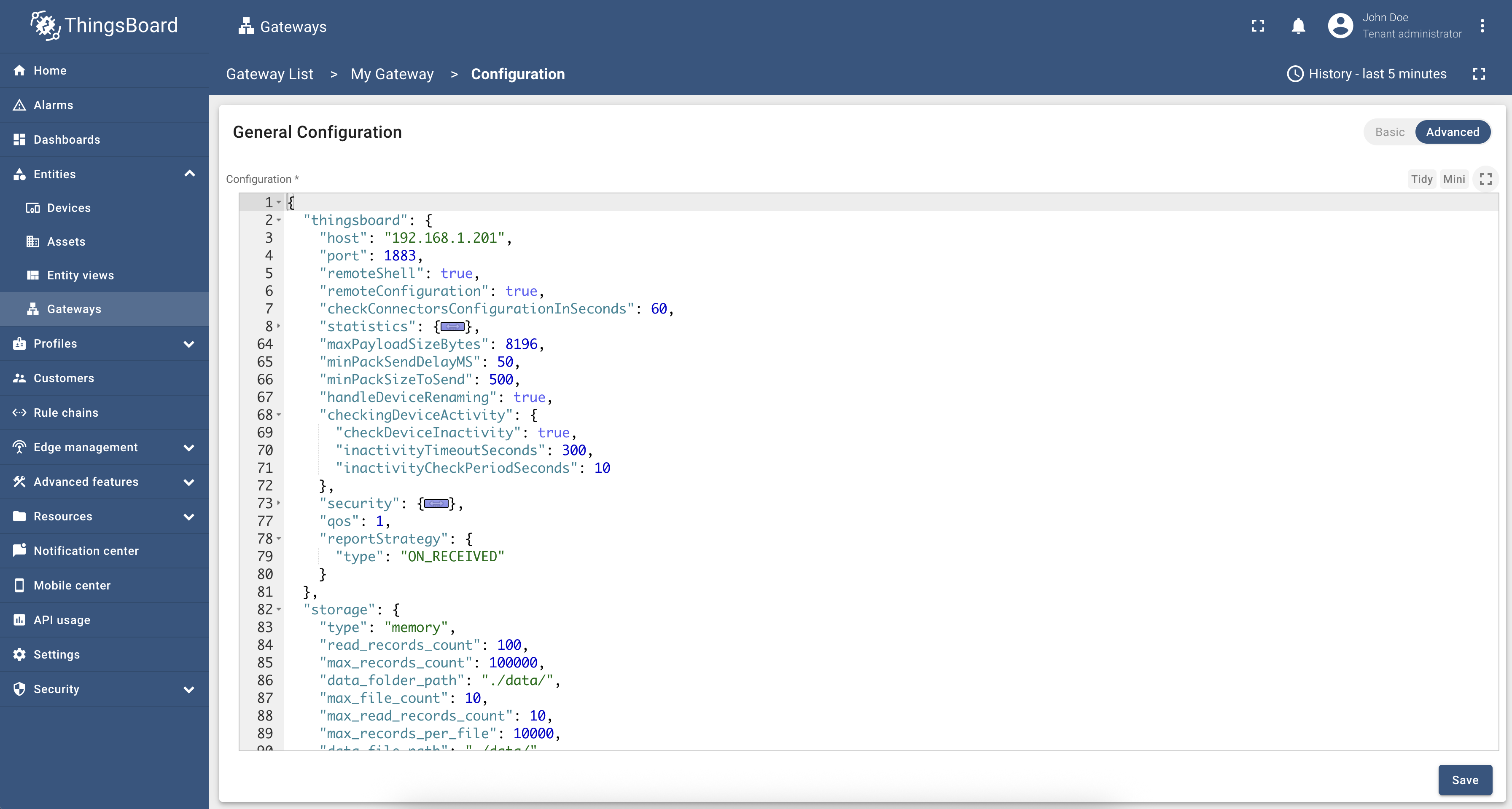 You can switch configuration modes between Basic and Advanced. Basic mode provides a user-friendly interface for configuring the gateway, while Advanced mode allows you to edit the configuration file in JSON format directly.
