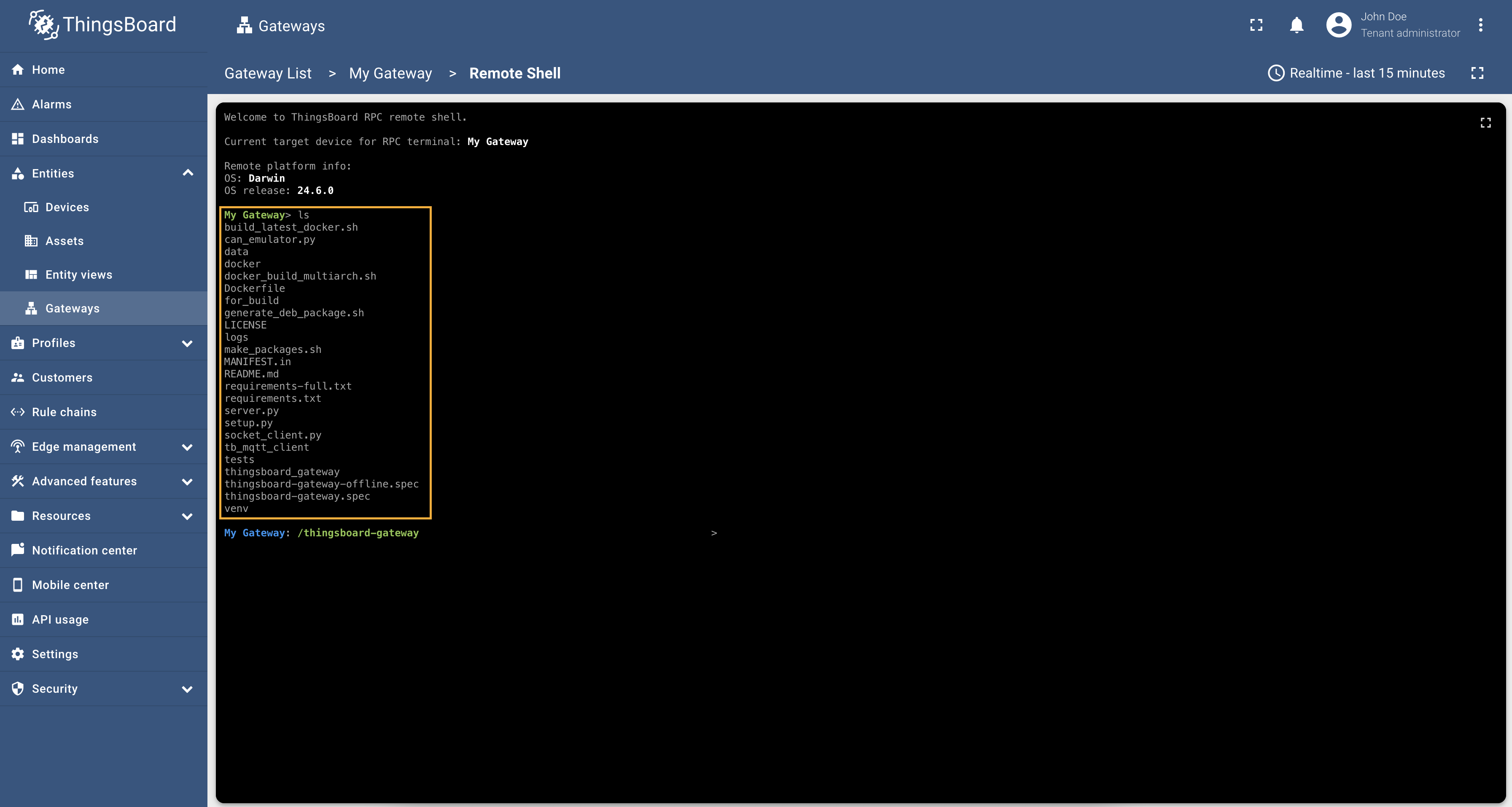 This guide will help you to enable a remote shell feature and control the operating system with ThingsBoard IoT Gateway from your ThingsBoard platform instance. With this functionality, you can access the underlying machine, execute commands, and perform maintenance tasks directly from the platform. It provides a convenient way to monitor system health, troubleshoot issues, and automate administrative operations without needing direct physical access. Before proceeding, ensure that you have the necessary permissions and have configured your gateway according to the prerequisites outlined in this documentation.