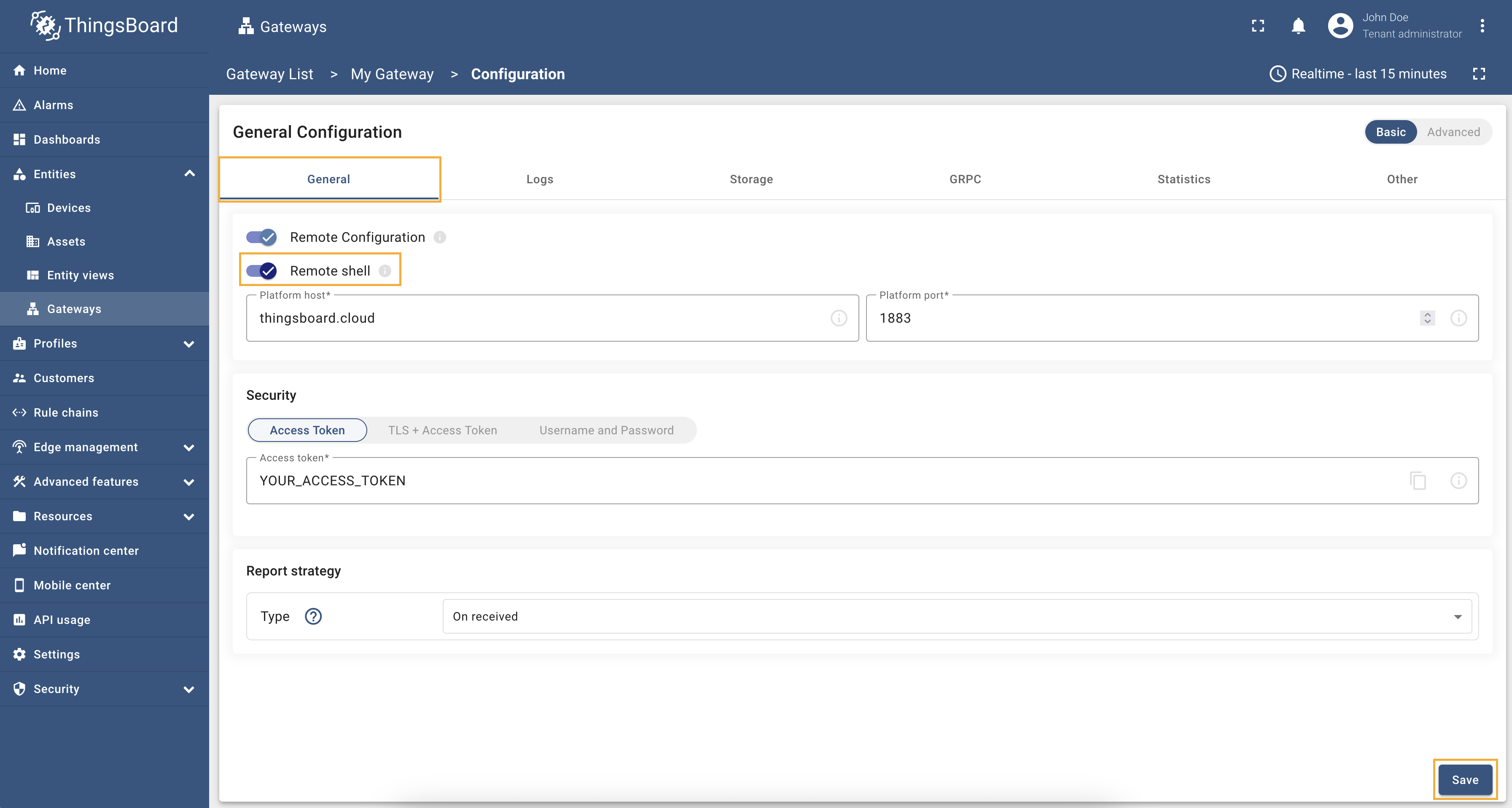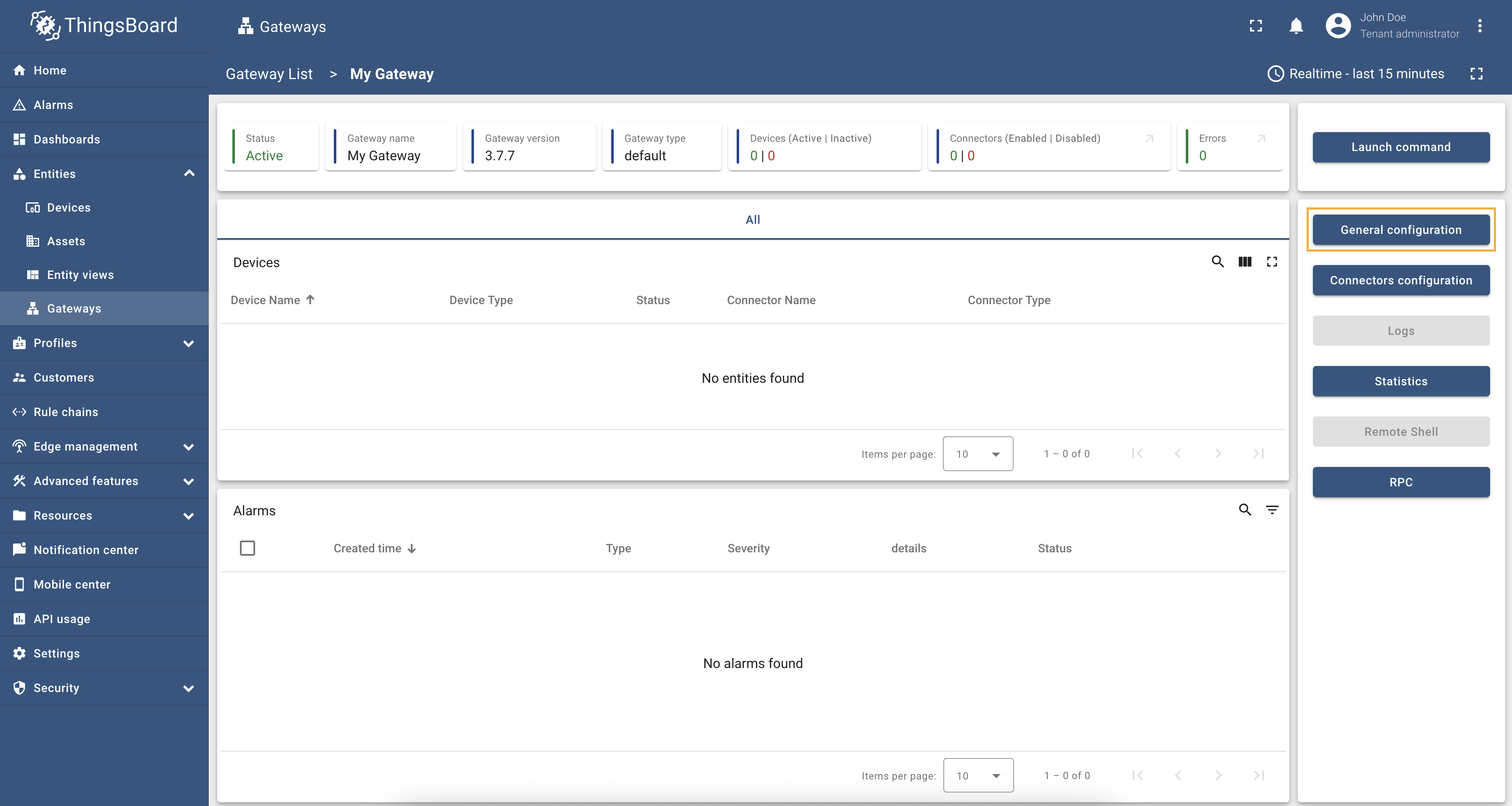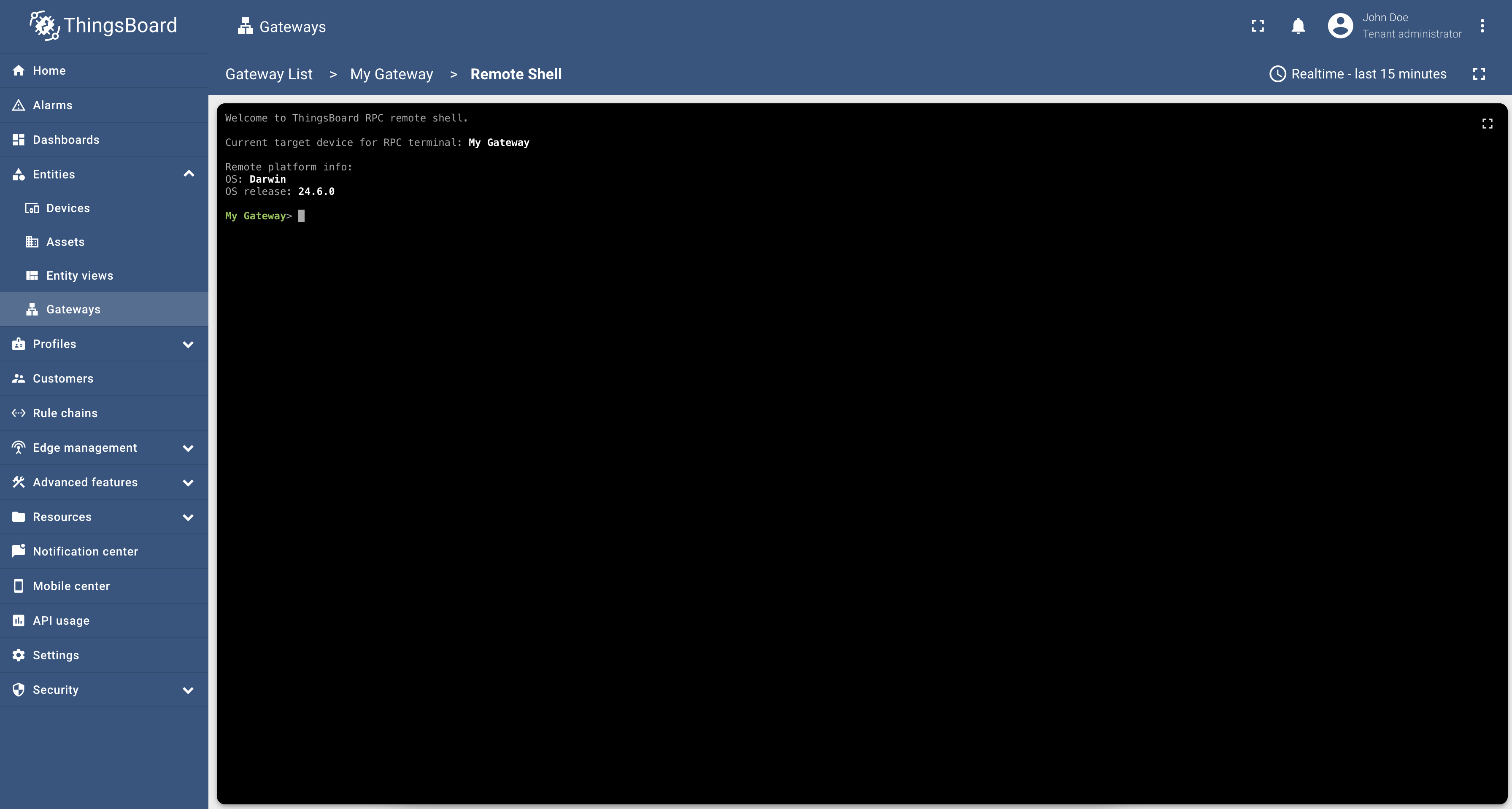 This guide will help you to enable a remote shell feature and control the operating system with ThingsBoard IoT Gateway from your ThingsBoard platform instance. With this functionality, you can access the underlying machine, execute commands, and perform maintenance tasks directly from the platform. It provides a convenient way to monitor system health, troubleshoot issues, and automate administrative operations without needing direct physical access. Before proceeding, ensure that you have the necessary permissions and have configured your gateway according to the prerequisites outlined in this documentation.