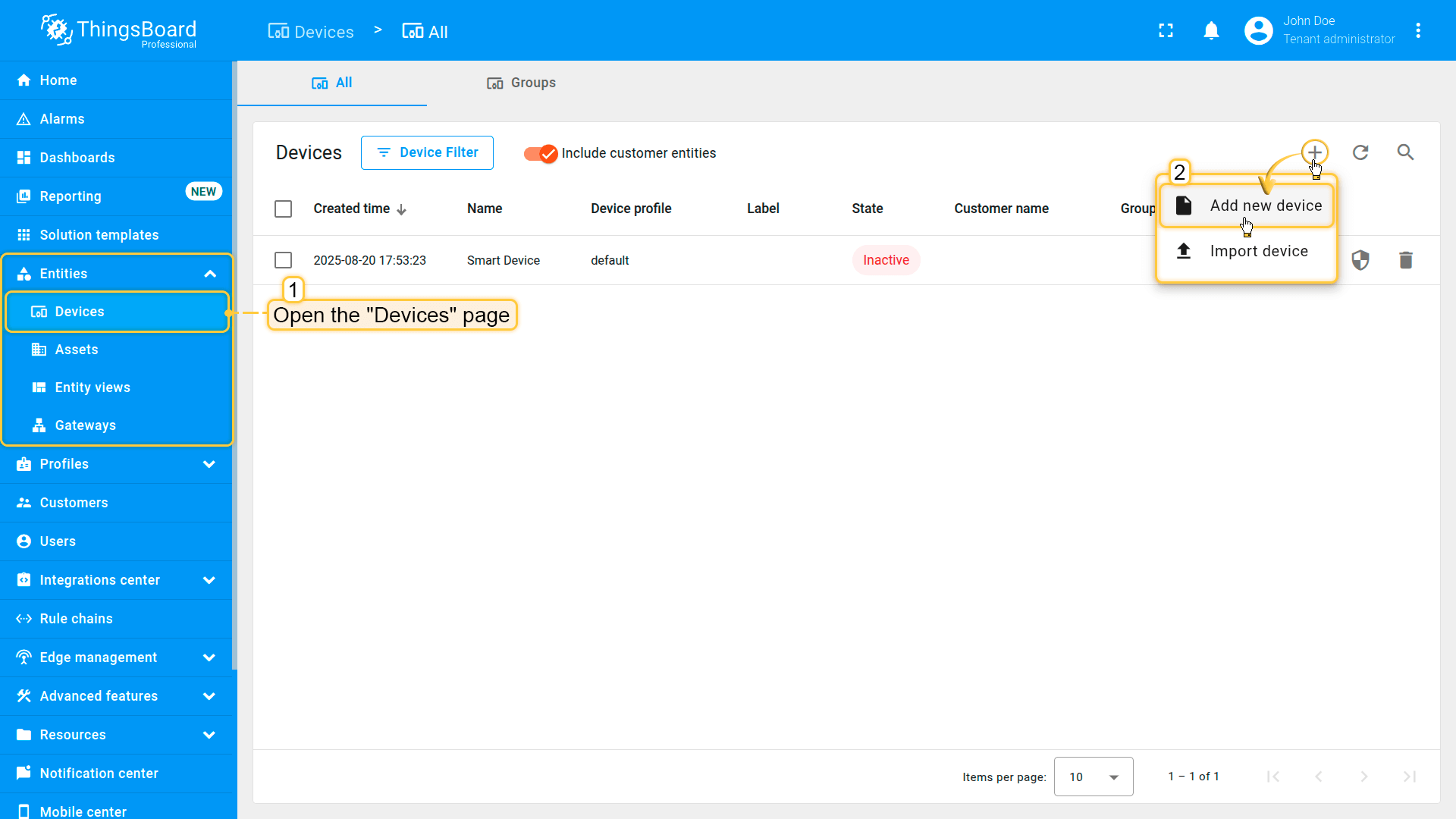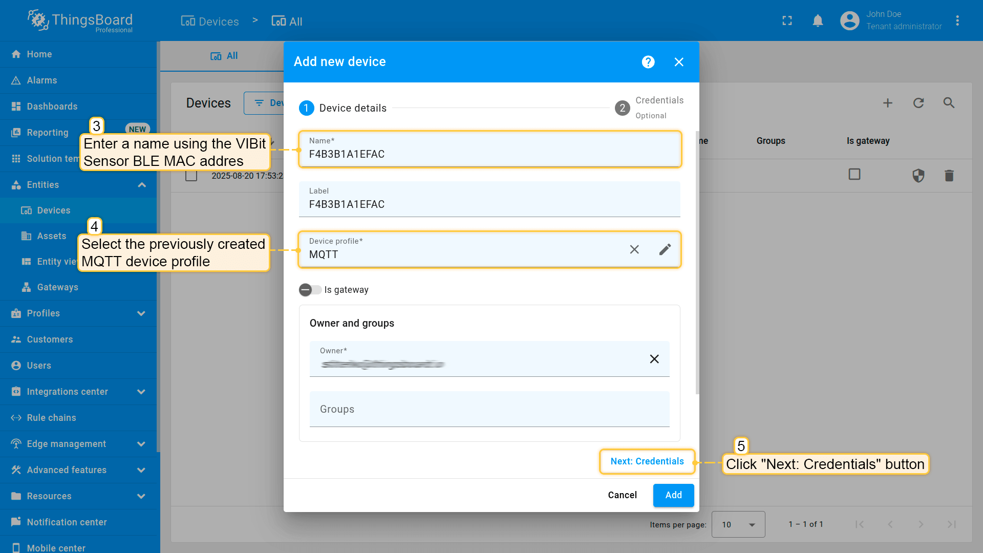 • In ThingsBoard, navigate to the “Devices” section and select your VIBit device.