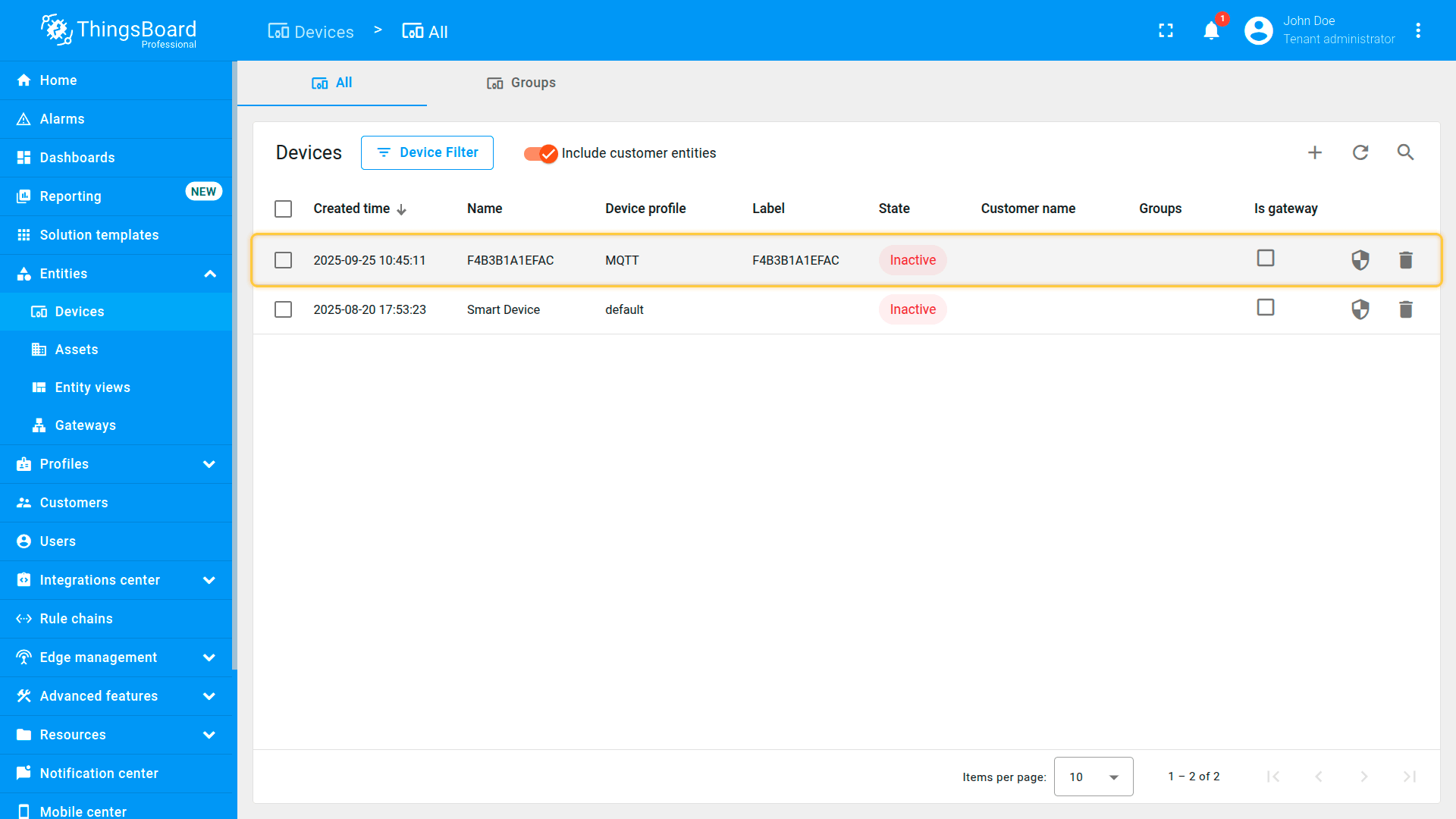 • Search the respective device and click on the Connect button. (Assuming that Device is already exists on the Thingsboard.)