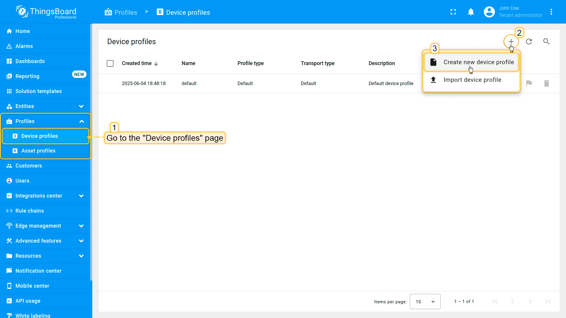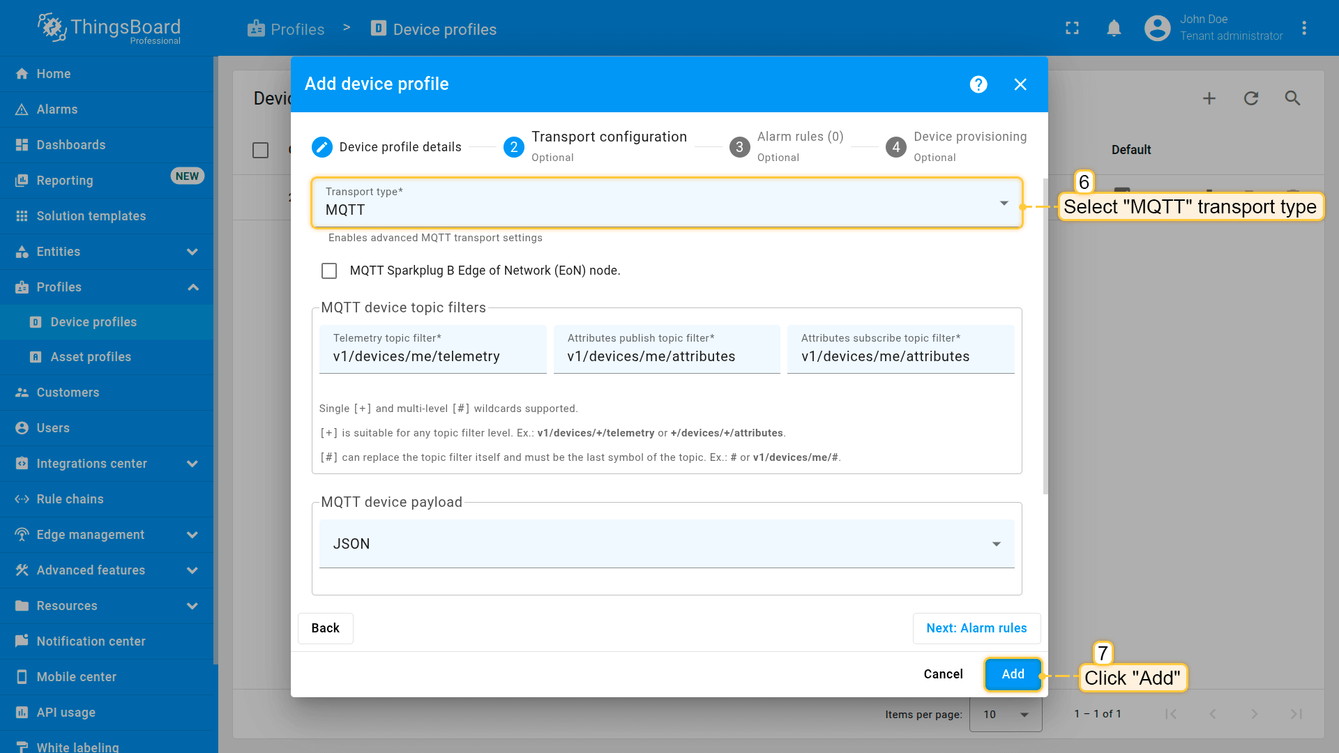 First, create a new device profile in ThingsBoard that uses the MQTT transport and the standard MQTT topics for telemetry and attributes.