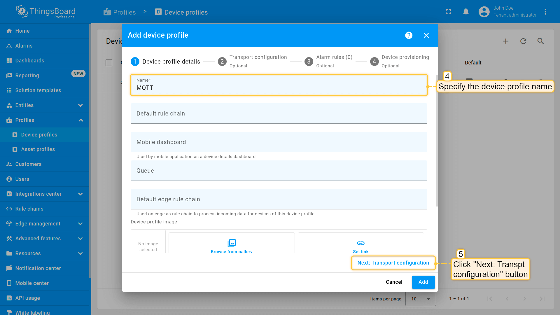 • Select the previously created MQTT device profile in the “Device profile” field.