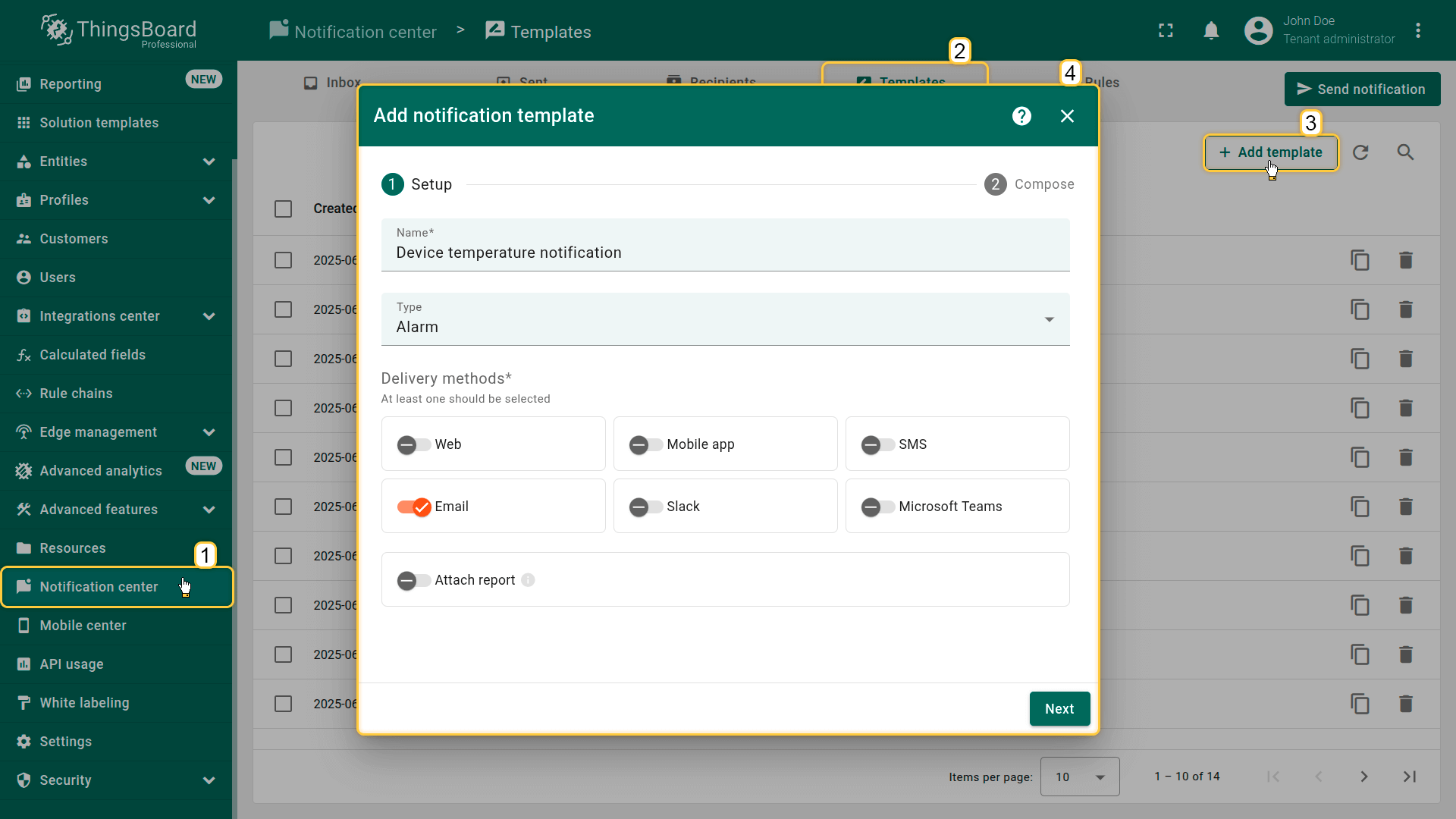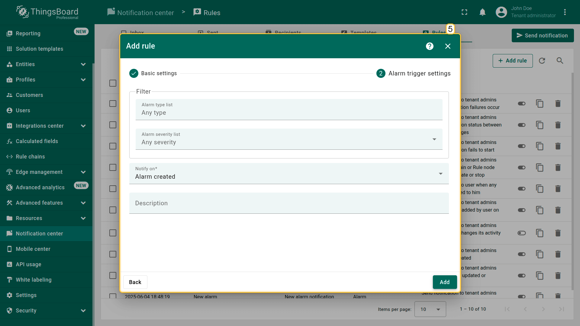 This guide explains how to configure ThingsBoard to automatically send email notifications to users when an alarm is created.