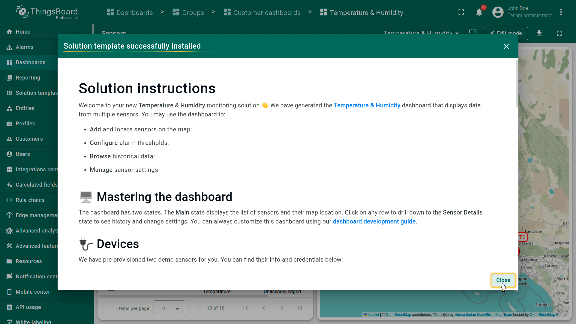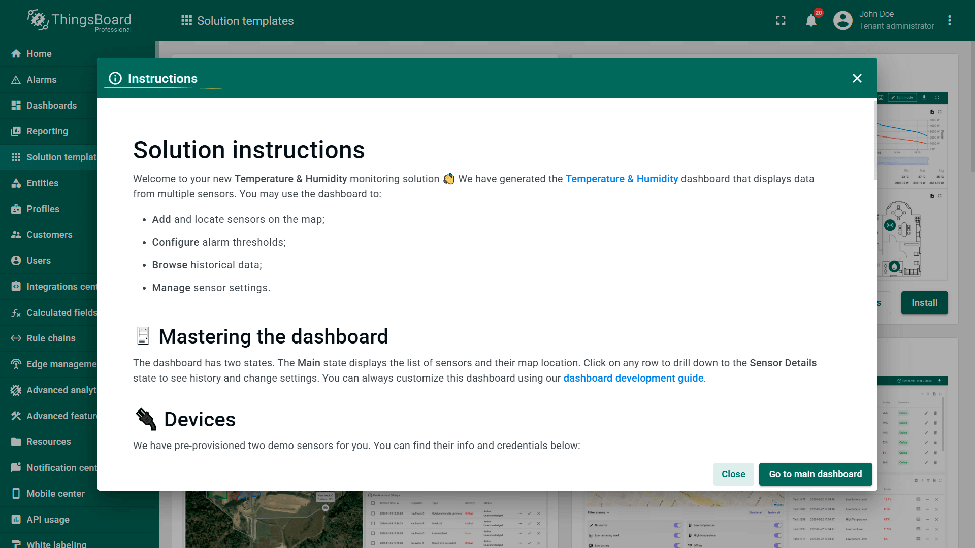 Once solution is installed, you will be automatically forwarded to the main dashboard of the corresponding template, and the instructions dialog will appear.