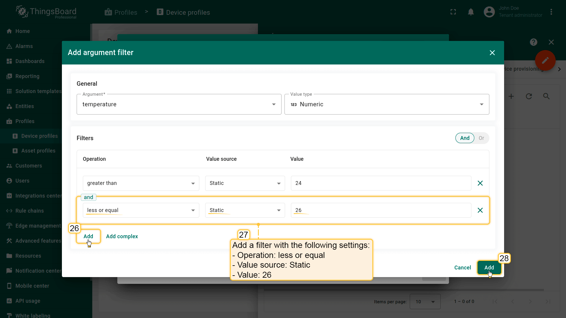 Filters: Click Add filter (24): Operation (25): greater than; Value source: Static; Value: 24.