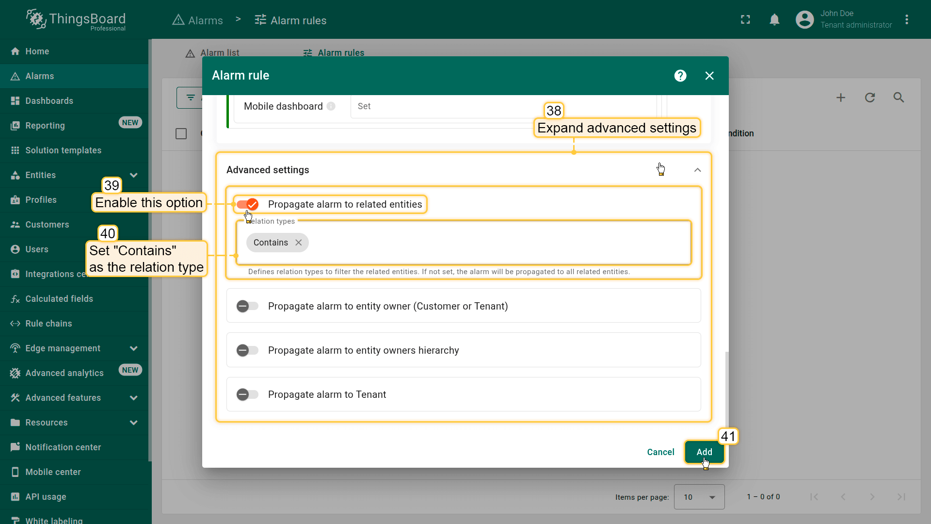 - Enable the Propagate alarm to related entities option (39), and specify the Relation type used in the device–asset relation: Contains (40).