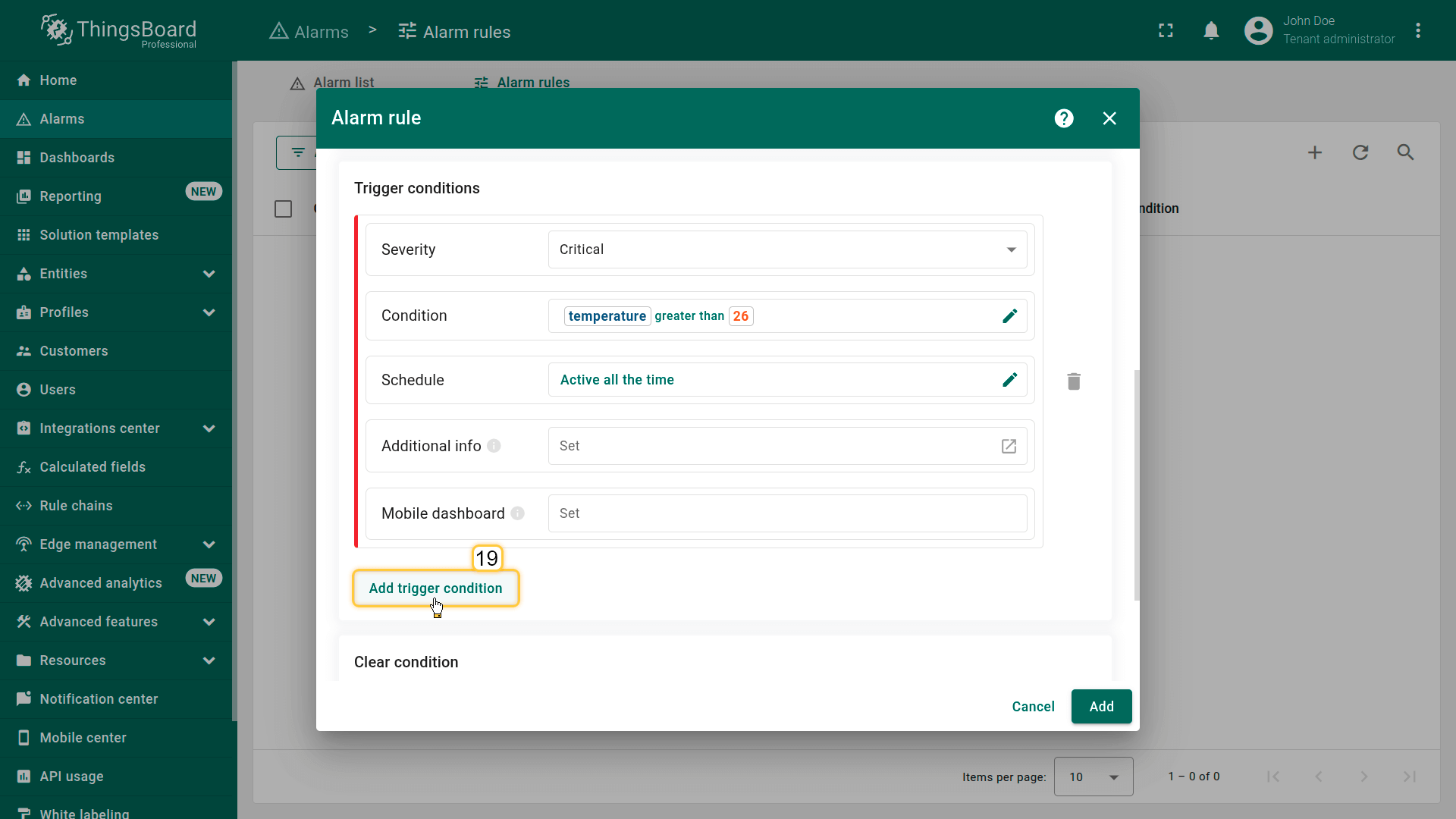 Add an alarm trigger condition with “Critical” severity that is activated when the temperature exceeds 26 °C.