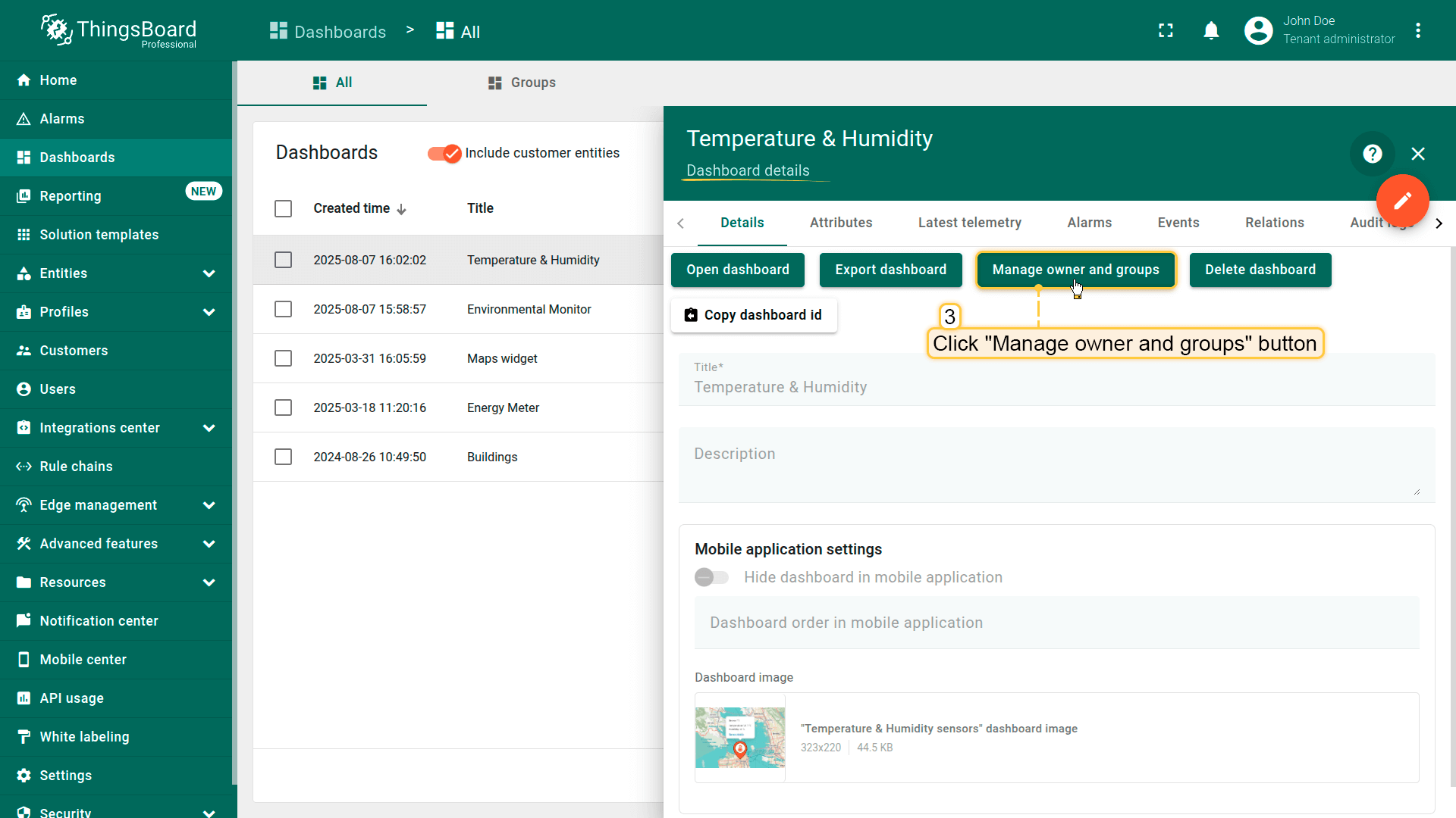 - Login to your ThingsBoard instance and navigate to the "Dashboards" page through the main menu on the left of the screen. By default, you navigate to the dashboard group "All";