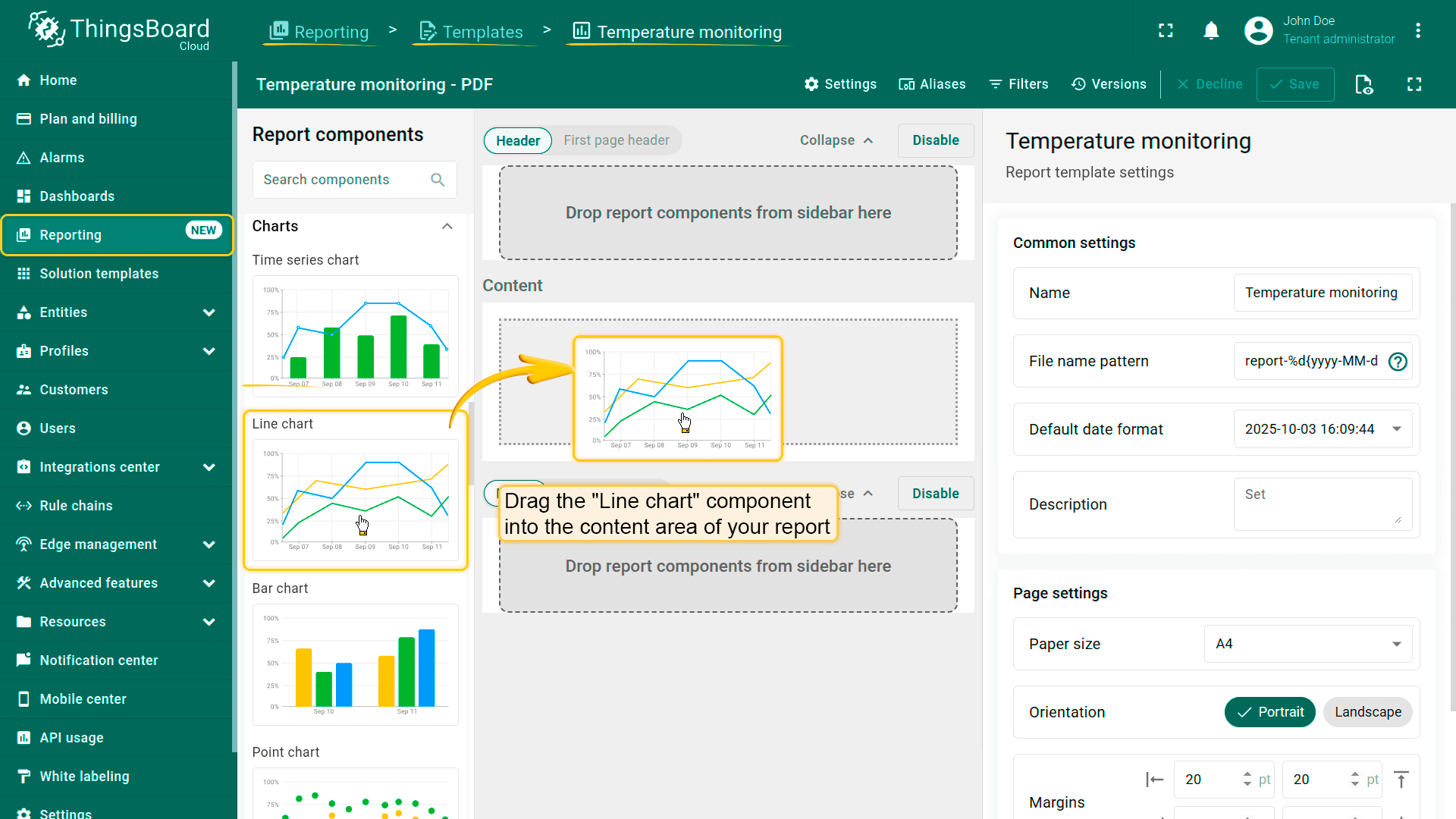 - In the Components library, go to Charts, select the chart type, and drag it into the content area of your report.