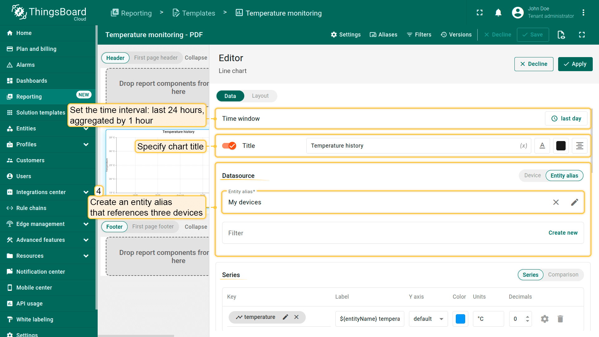 - Prepare three devices that will send temperature values to ThingsBoard as telemetry. Data from my devices is sent once per hour.