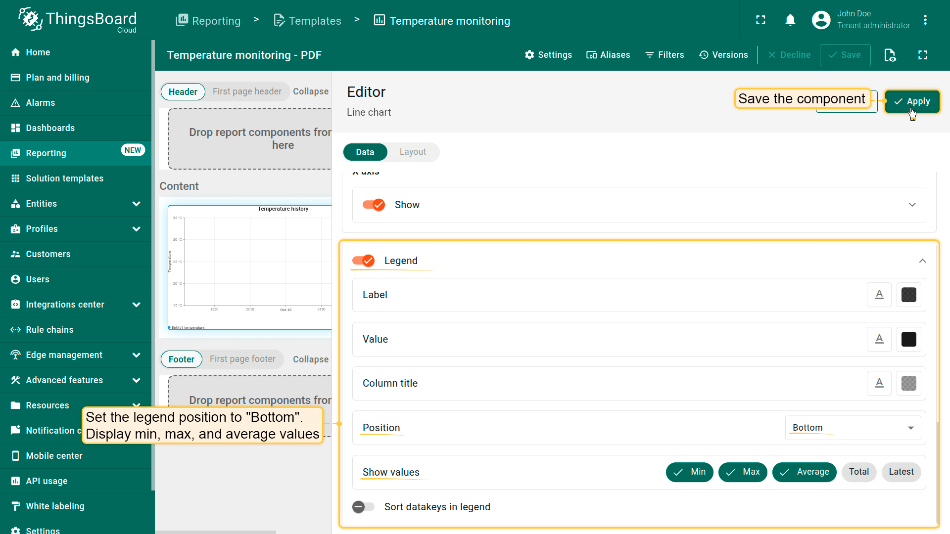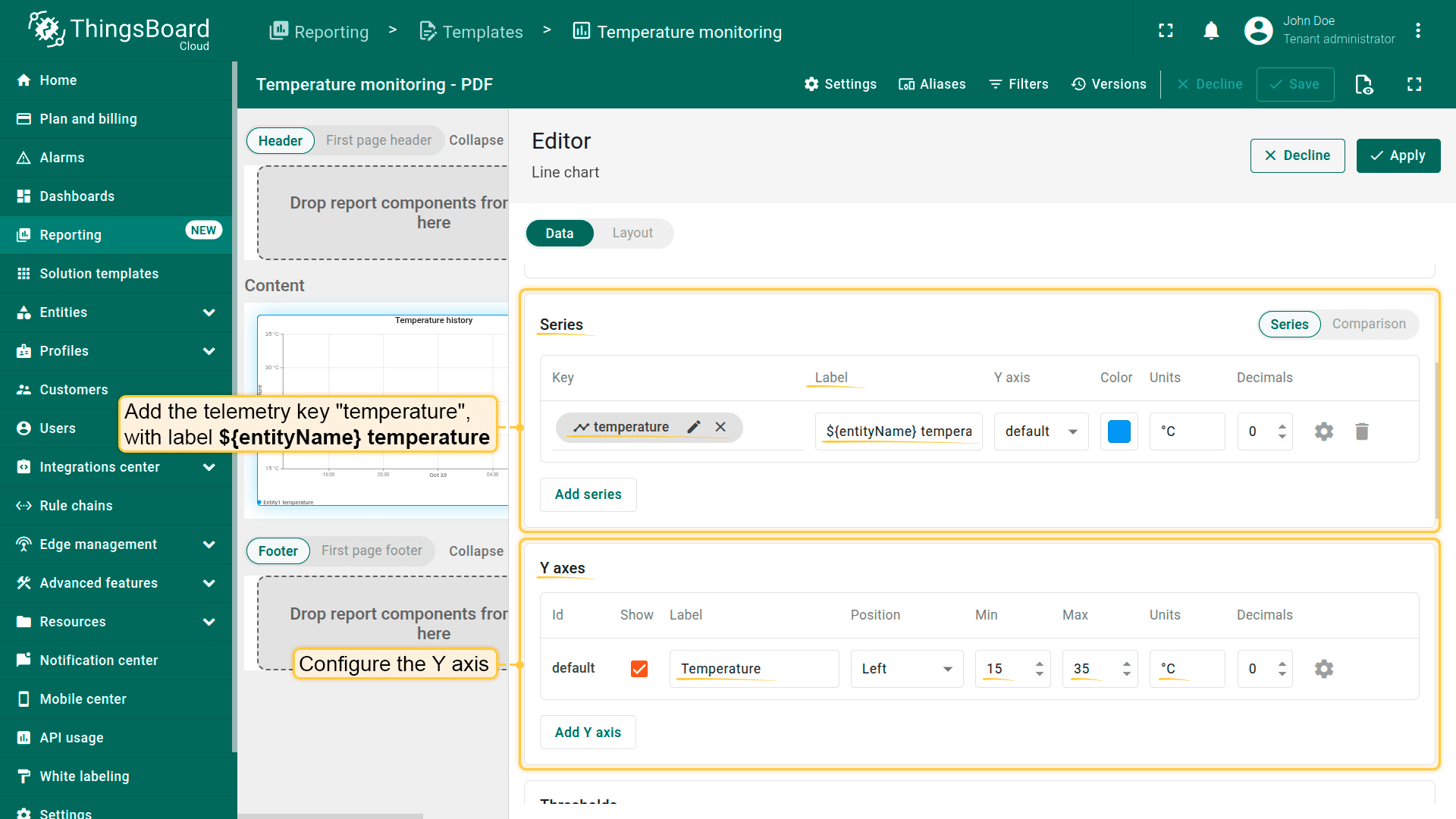 - Thresholds – add reference lines based on constant values, keys, or entities to highlight safe, warning, or critical limits.