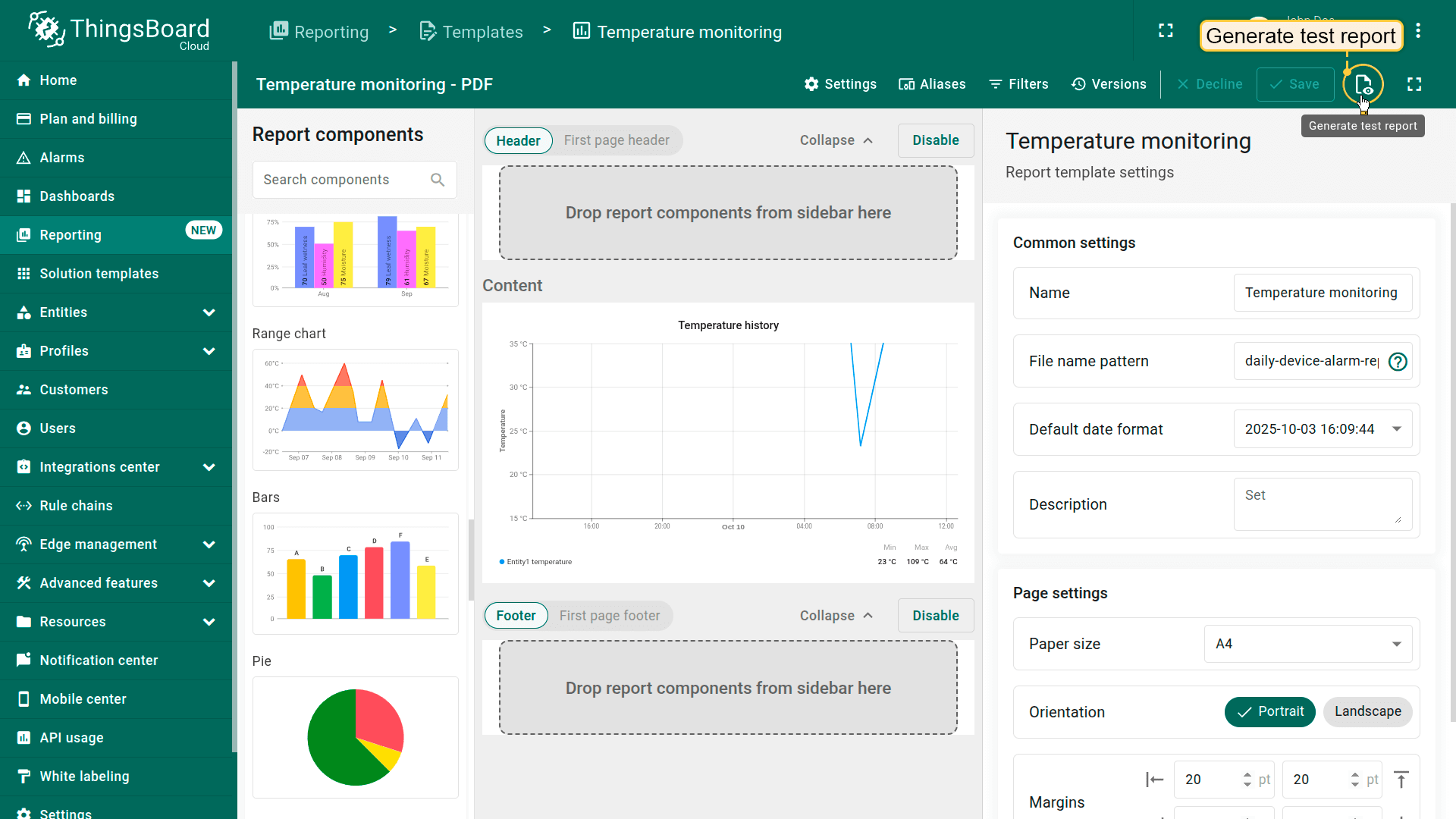 - To verify that your template is set up correctly and the data displays as expected, click Generate test report (next to the Save button). The system will generate a sample report using the available test data from the selected device or entity alias.