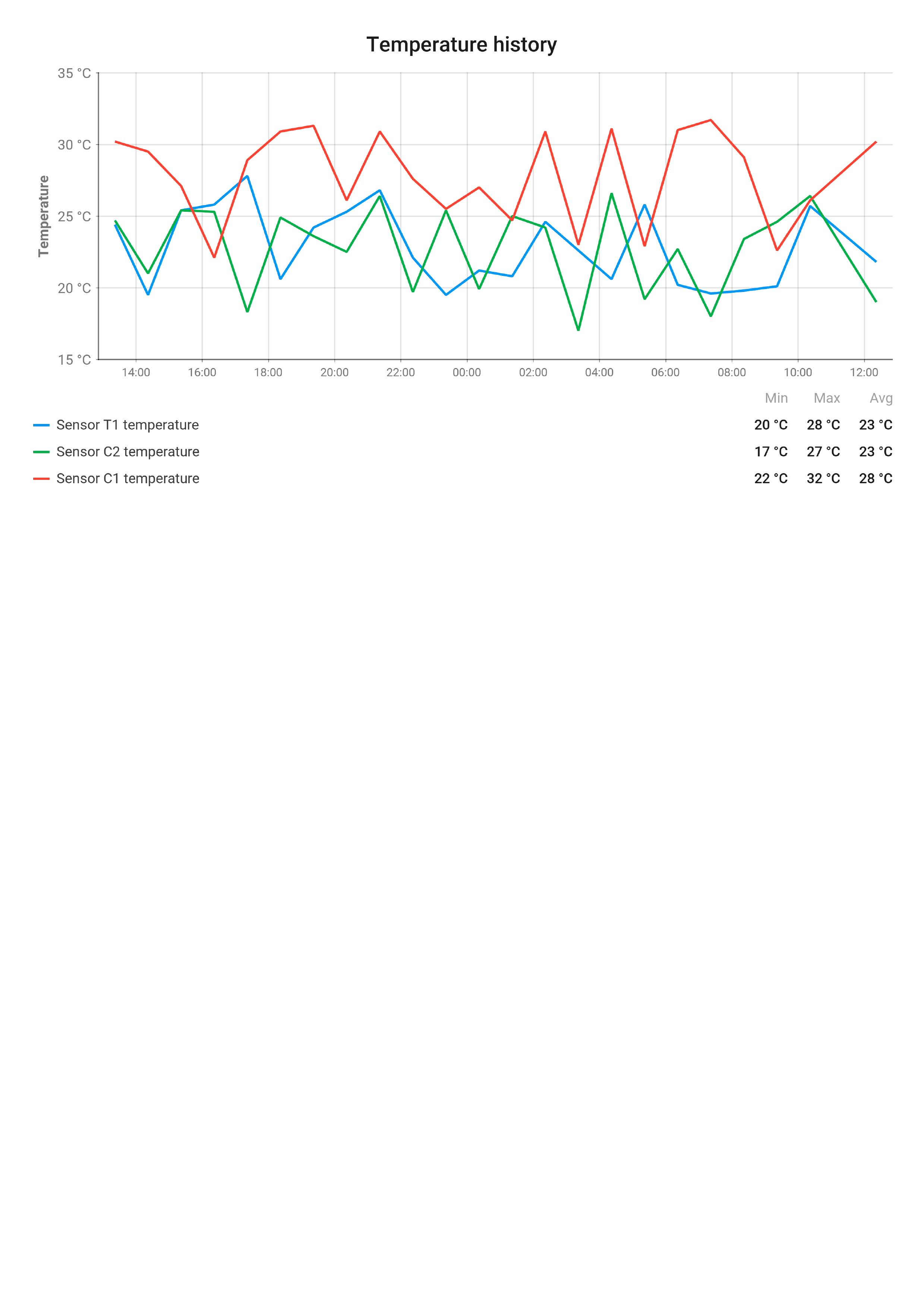 The generated report will include a line chart showing temperature trends from all three devices, allowing you to compare them over time.
