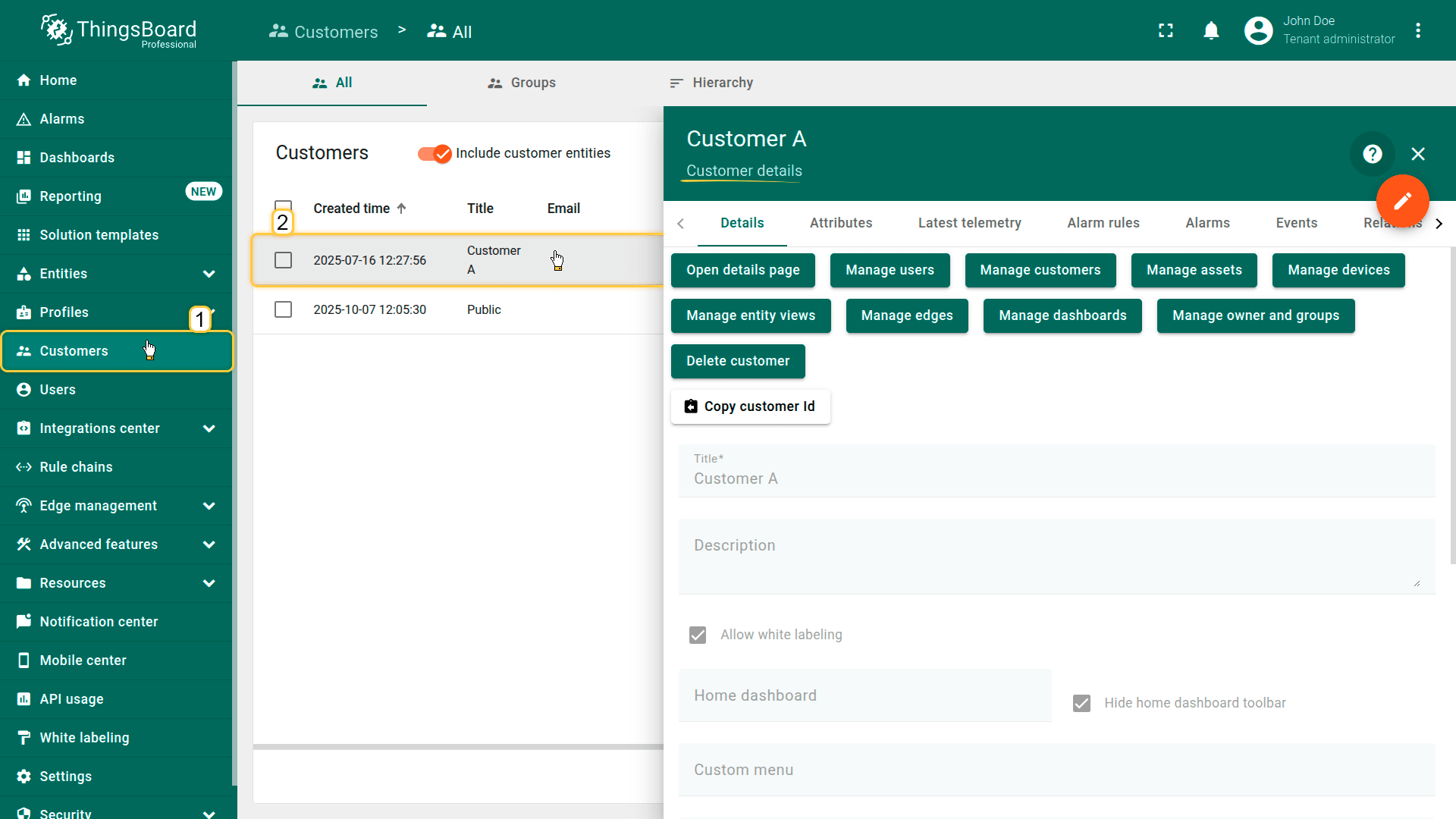 A Customer in ThingsBoard represents a distinct business entity — an individual or an organization — that purchases or uses a tenant's devices and/or assets. A customer may also represent a department or subdivision within the tenant's organization.
