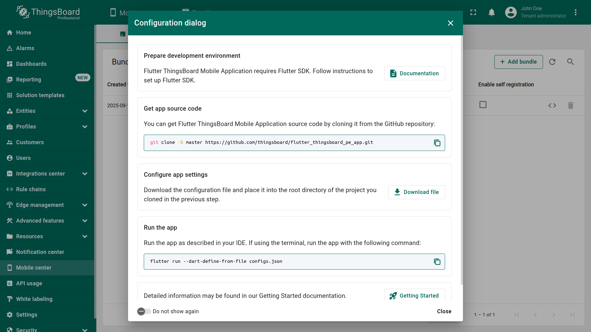 After adding the bundle, a step-by-step dialog appears to guide you through the remaining setup and deployment steps. Follow it carefully to complete ThingsBoard PE mobile application configuration.