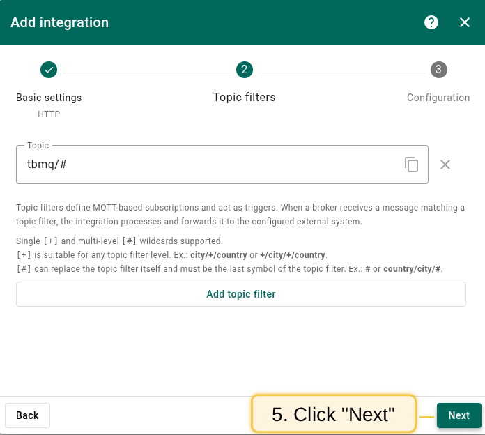 tbmq/#. - In the Configuration step, paste the Endpoint URL from the ThingsBoard Integration.