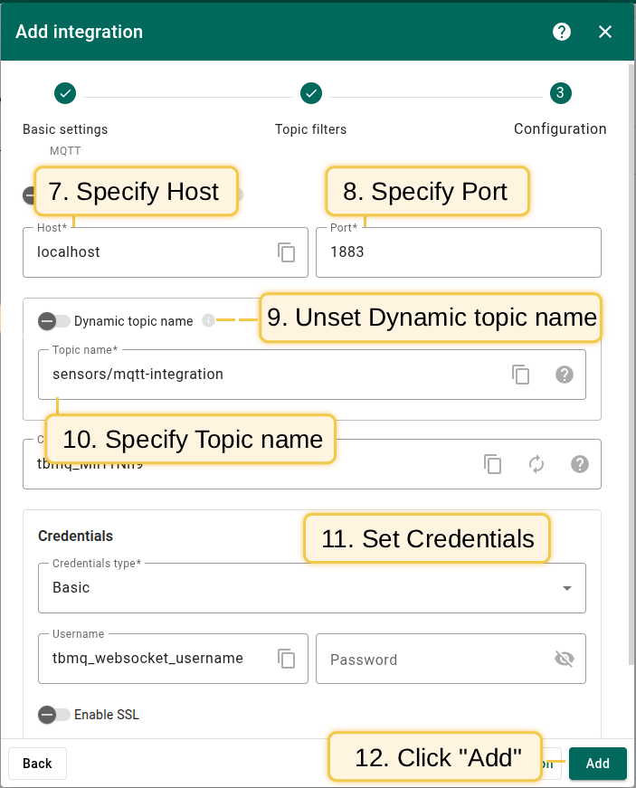 falseand ‘Topic name’ tosensors/mqtt-integration; - Set ‘Credentials’ type to