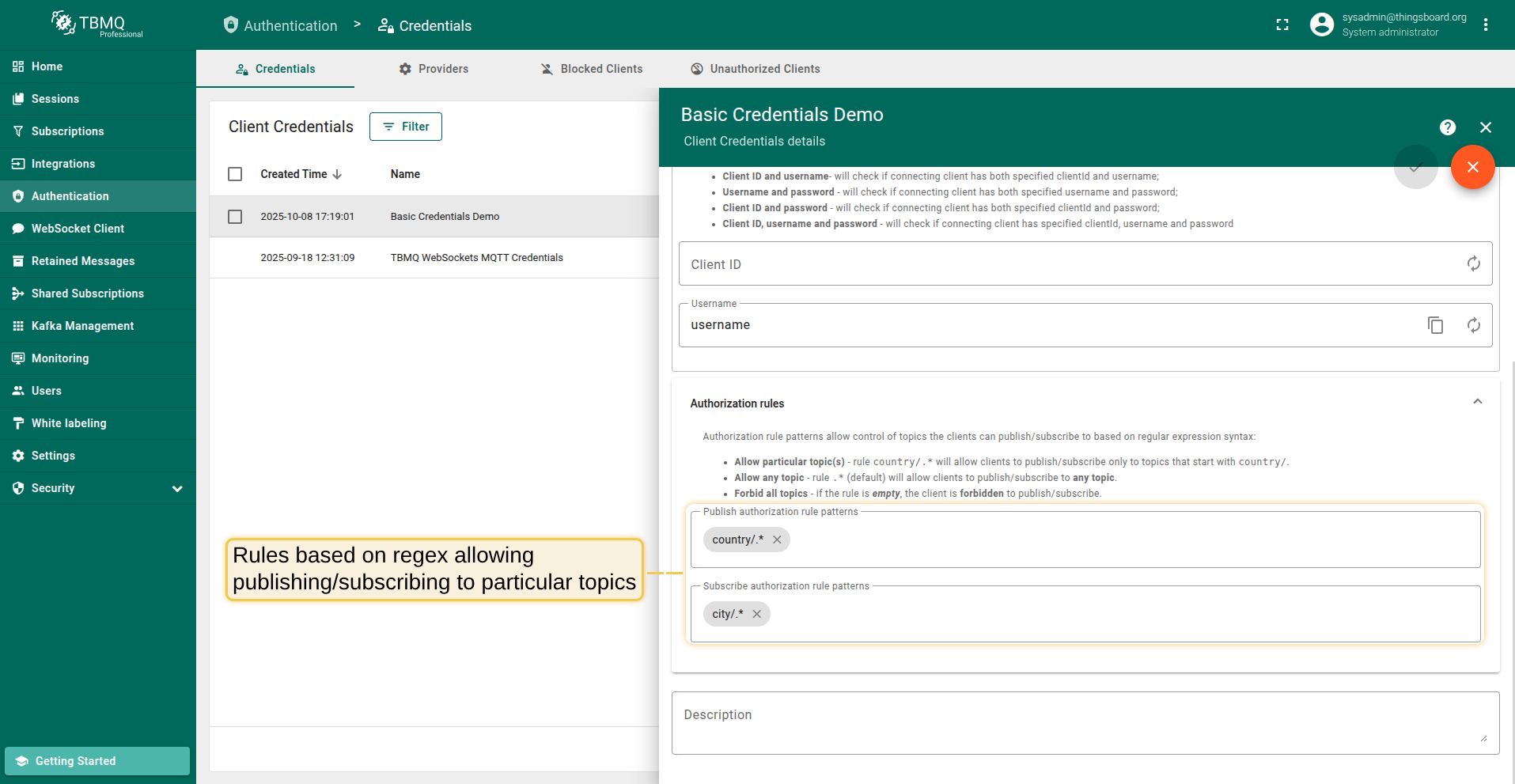 For example, to allow clients to publish or subscribe to all topics that begin with city/, an authorization rule should be created with the value city/.*.