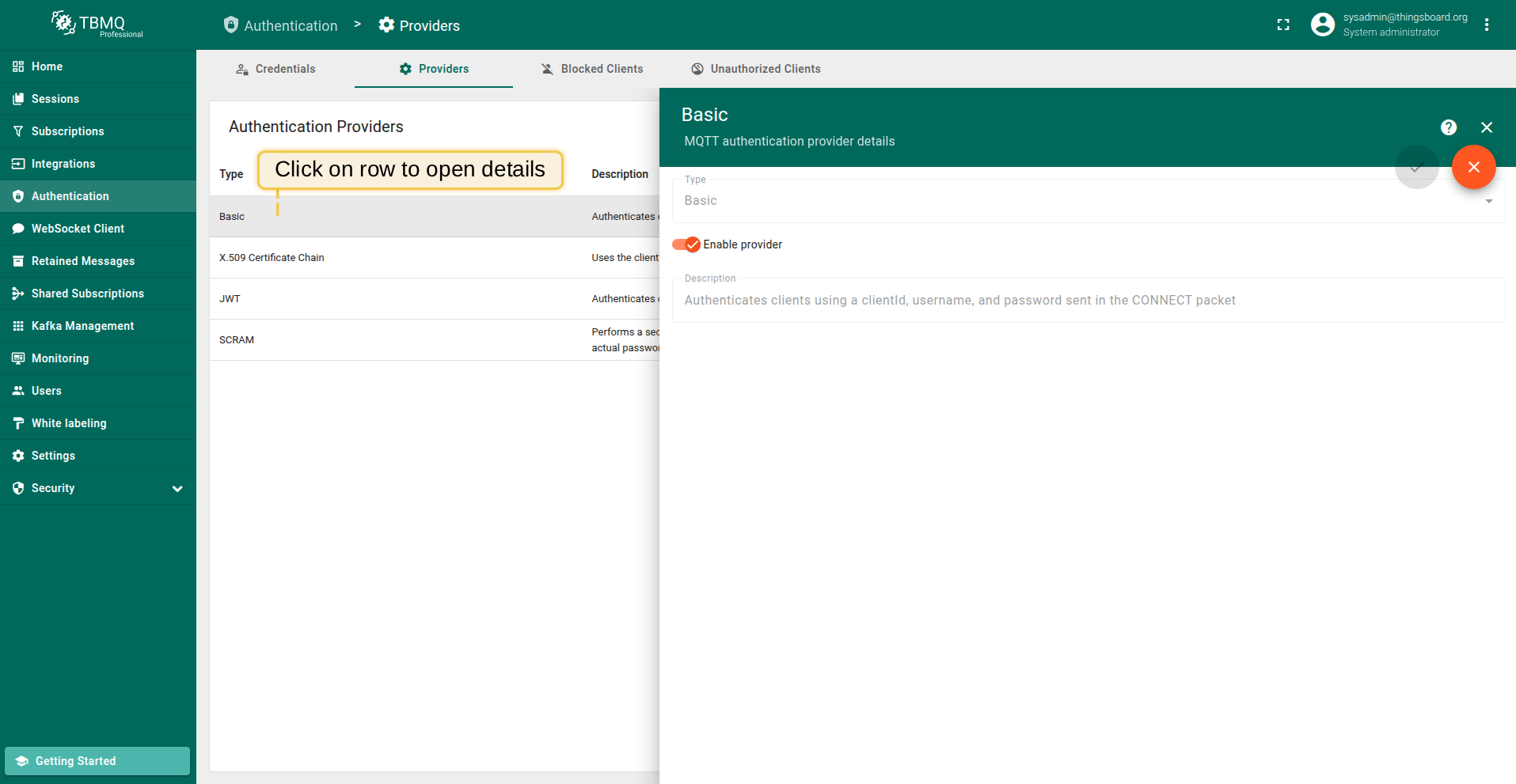 You can check the authentication provider status, enable or disable it directly from the TBMQ user interface, making it easy to manage authentication behavior without modifying configuration files or restarting the broker.