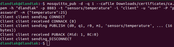 mosquitto_pub -d -q 1 --cafile YOUR_PEM_FILE -h "YOUR_TBMQ_HOST" -p 8883 -t "sensors/temperature" -i "YOUR_CLIENT_ID" -u "YOUR_CLIENT_USERNAME" -P "YOUR_CLIENT_PASSWORD" -m {"temperature":25}
