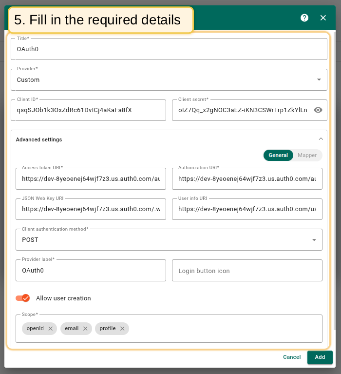 - Provide the Client ID and Client Secret obtained from your authentication provider;