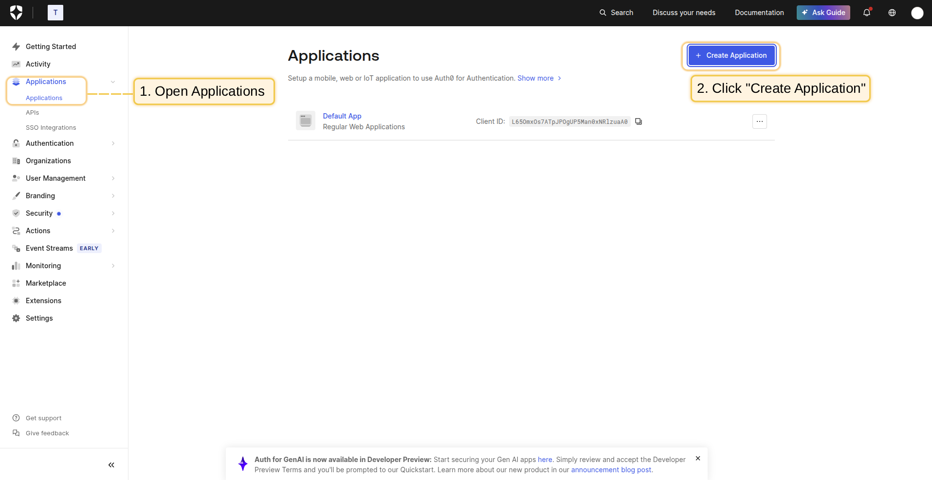 - Go to the Auth0 management console. Open the “Applications” page, and click the “+ Create Application” button;