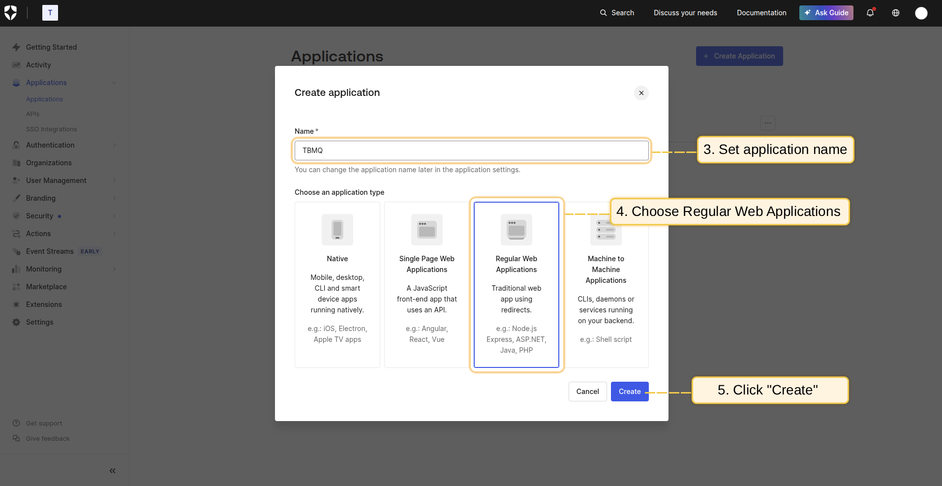 - Name your application “TBMQ” and choose the application type Regular Web Applications;