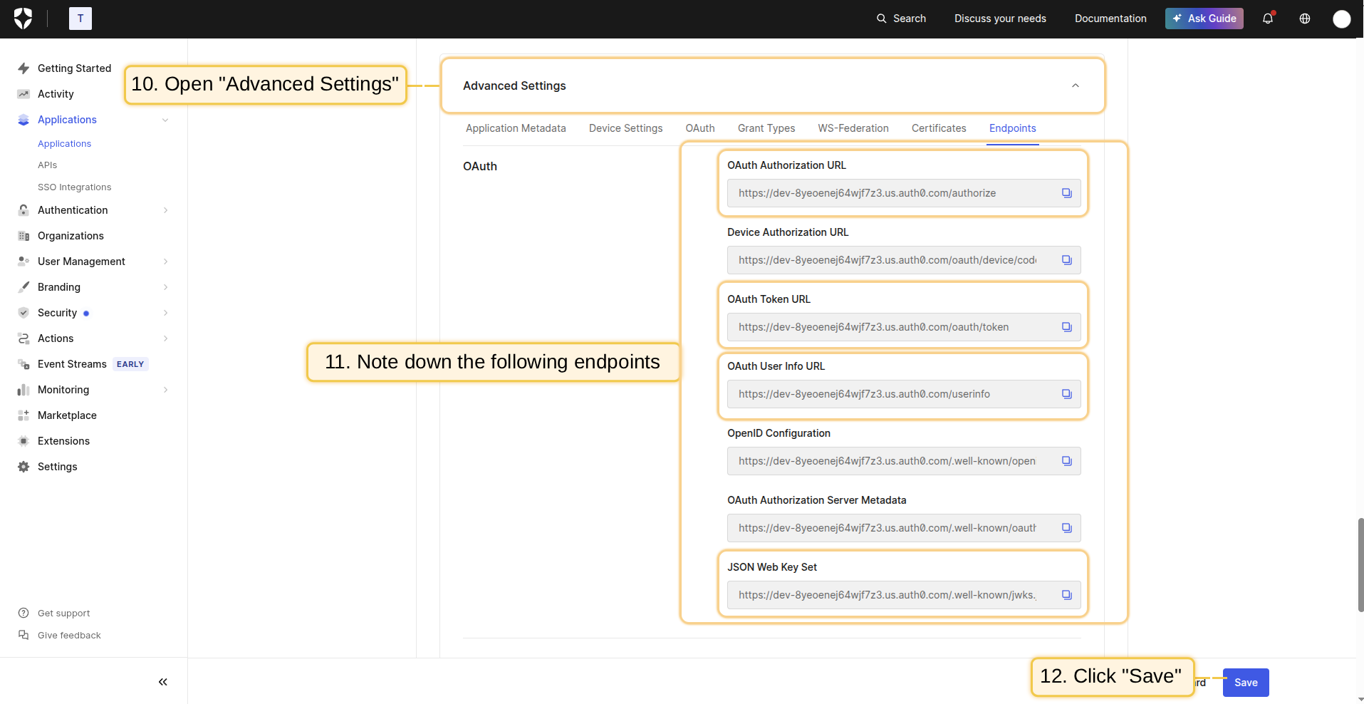 - In the Advanced Settings section, you will find all the necessary URLs (endpoints) required for configuring OAuth 2.0;