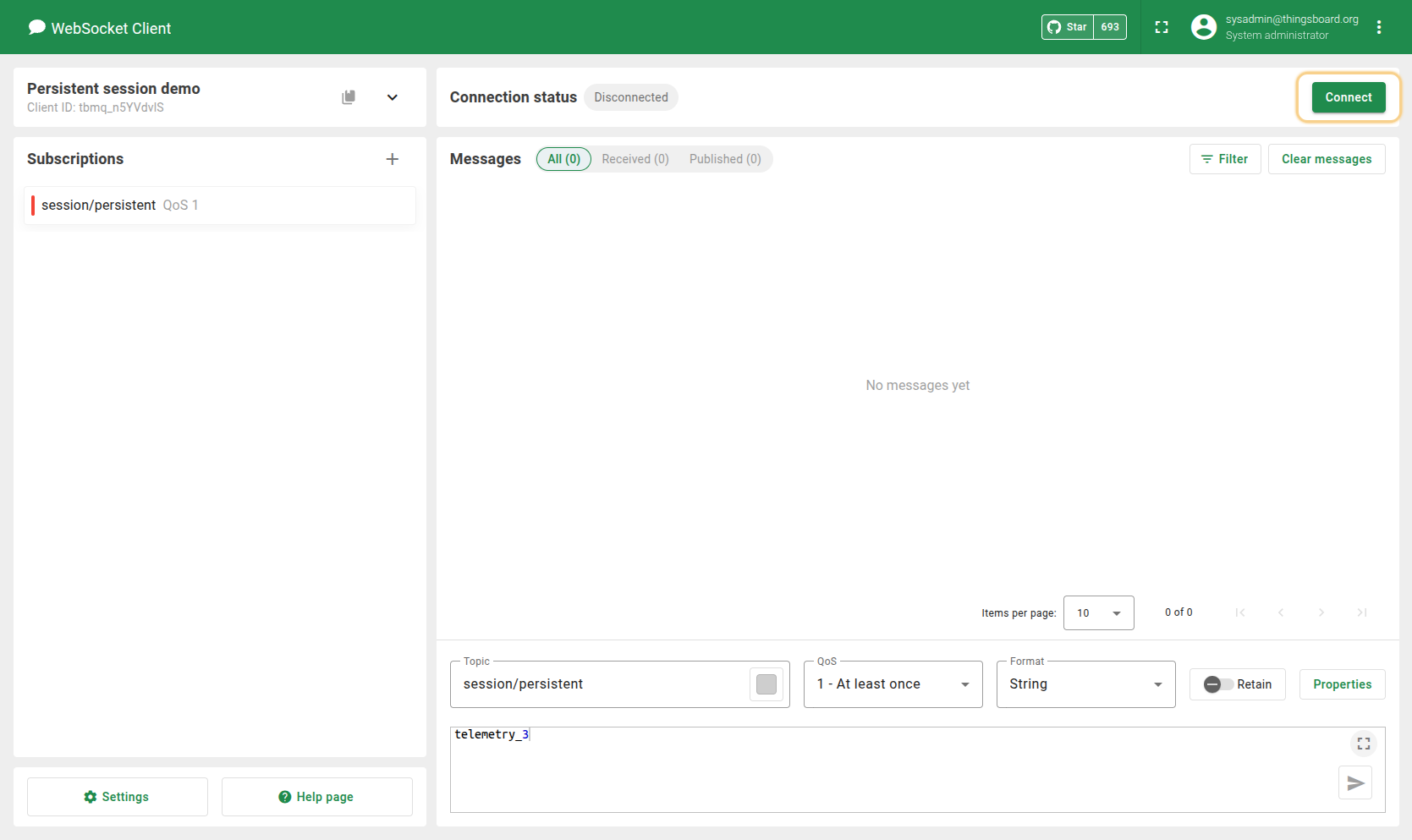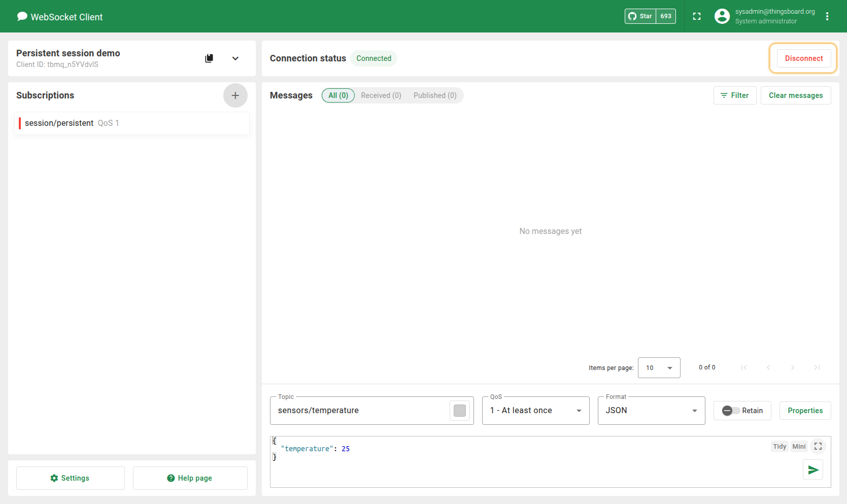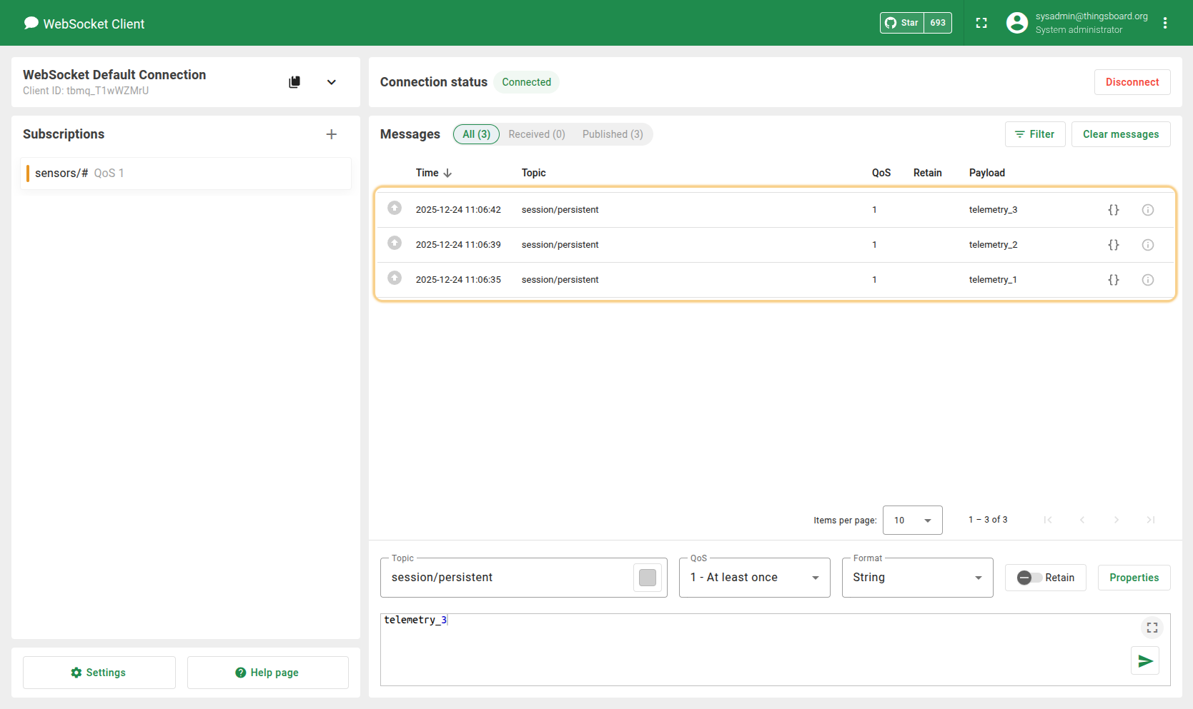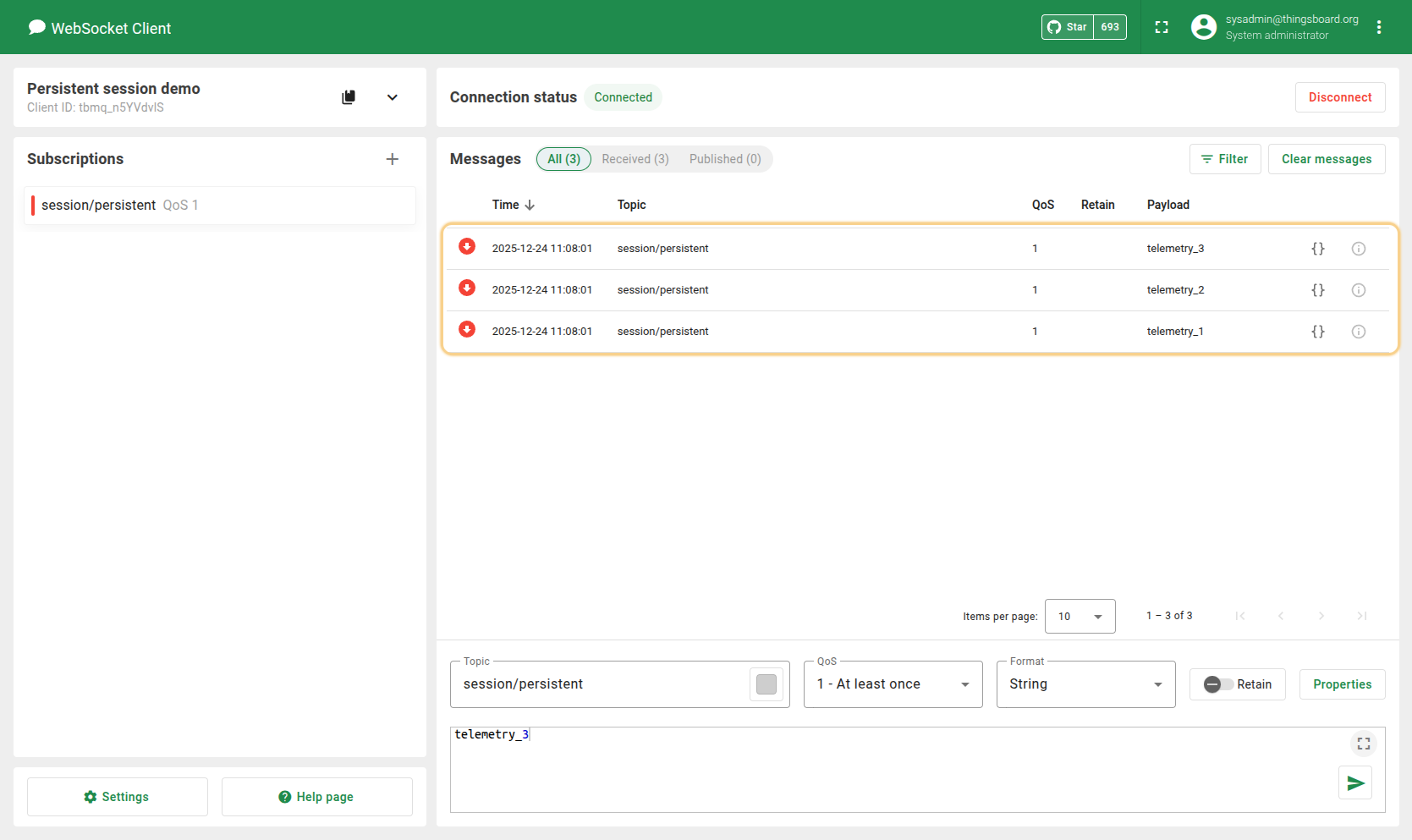 This example shows how a persistent session works in practice using the TBMQ WebSocket Client. You will see that messages published while a Client is offline are not lost and are delivered when the Client reconnects.