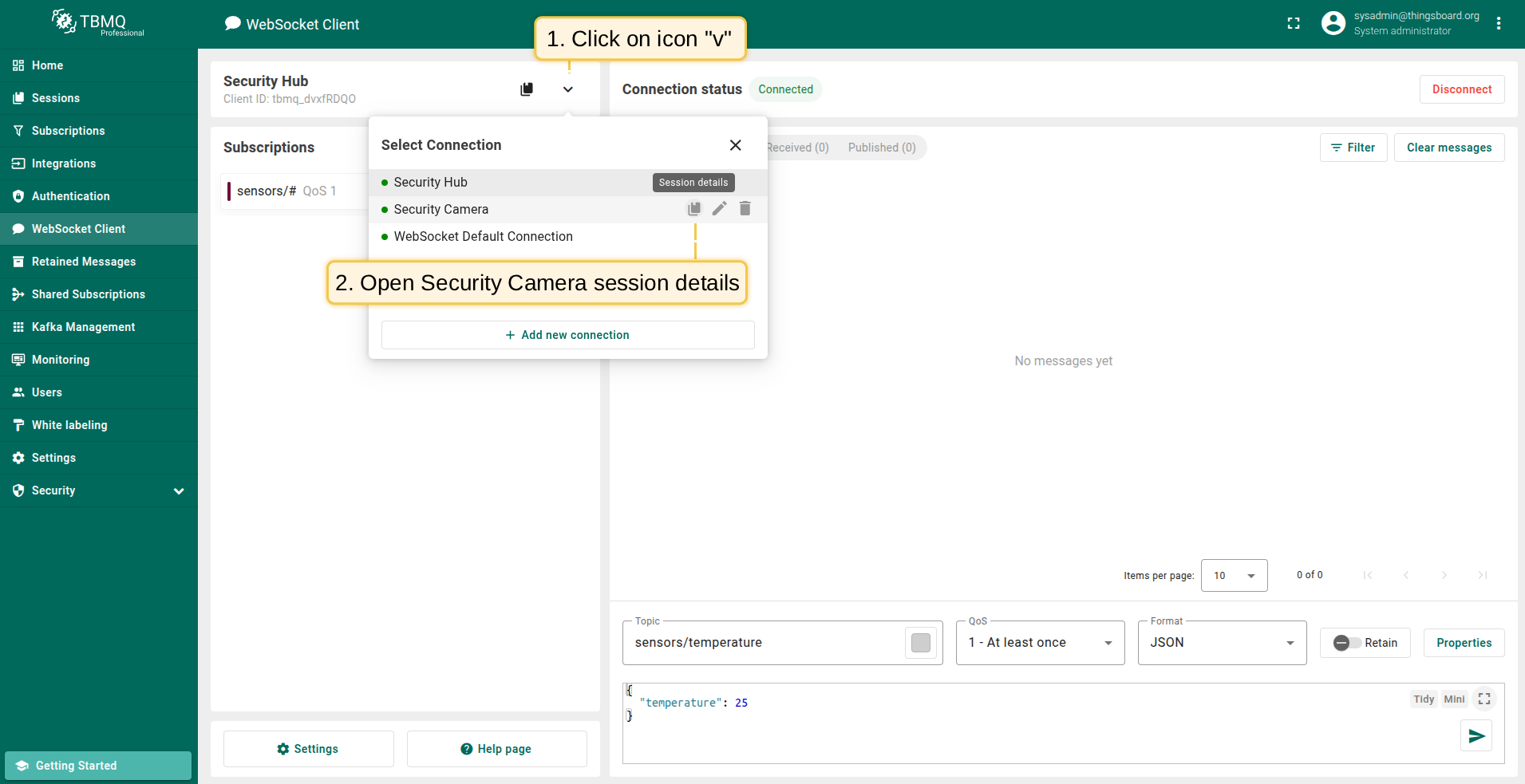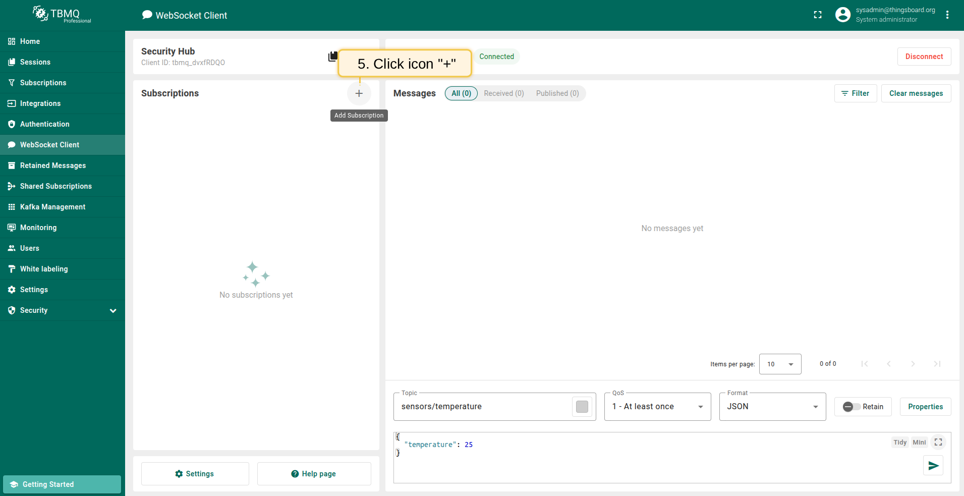 - In the Messages table of the WebSocket client Security Hub you should see the received Last Will message.