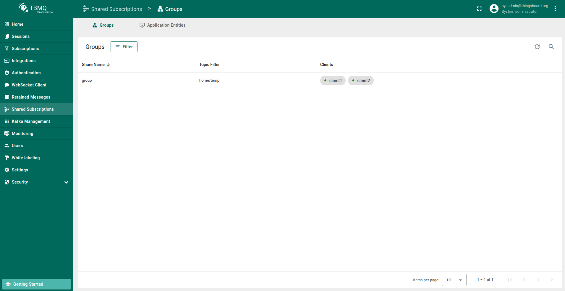 As a result, a new shared subscription is initiated (with ShareName equal to group) with two clients (client1 and client2) subscribing to the home/temp topic. Both clients will receive messages published on the mentioned topic evenly.