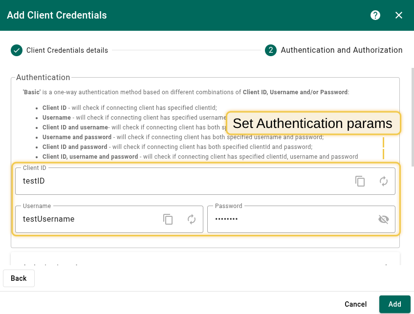 - Client ID, username and password - verifies if the connecting client has specified clientId, username, and password.