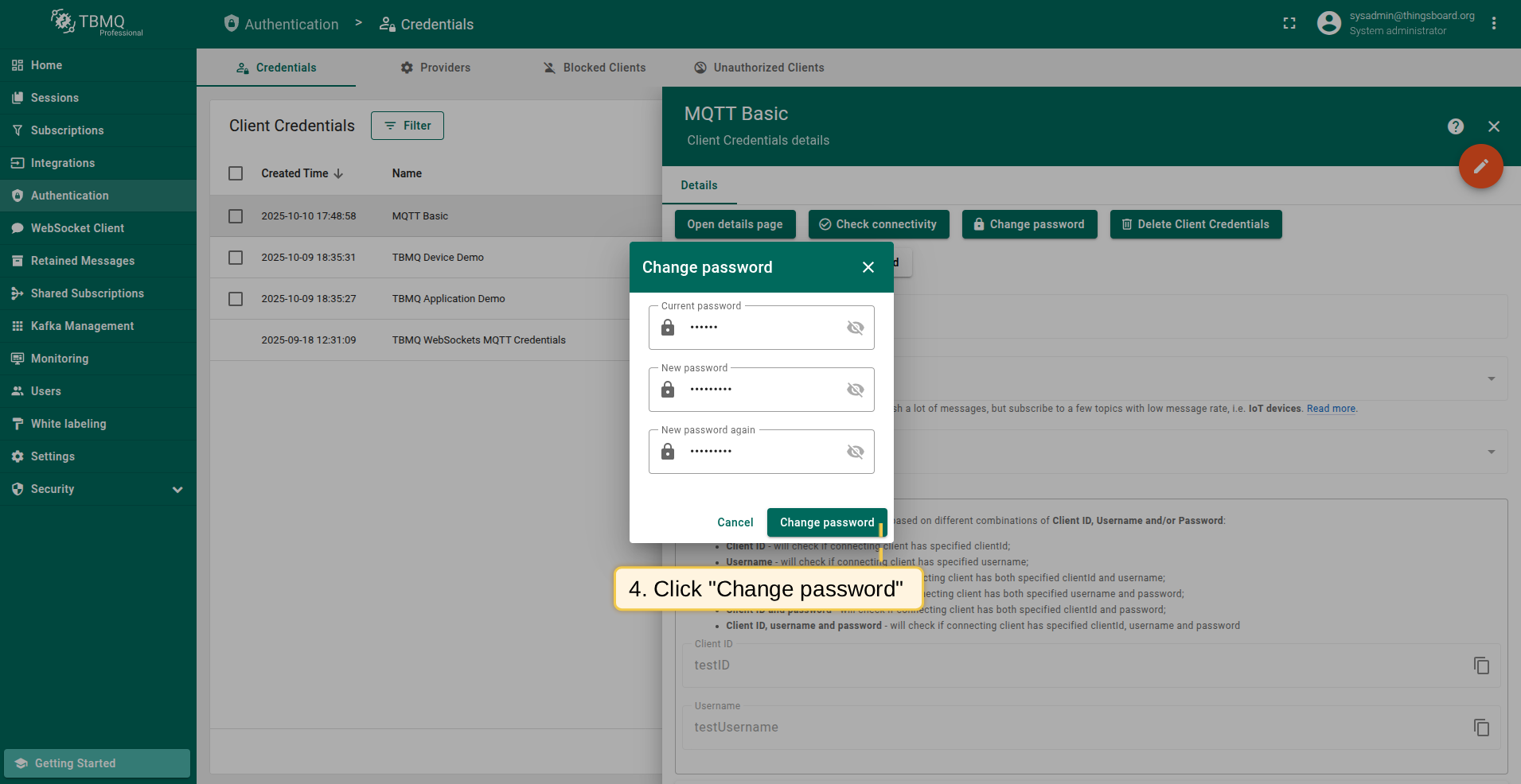 Broker administrators can modify the password for MQTT Basic client credentials. To do this, follow these instructions: