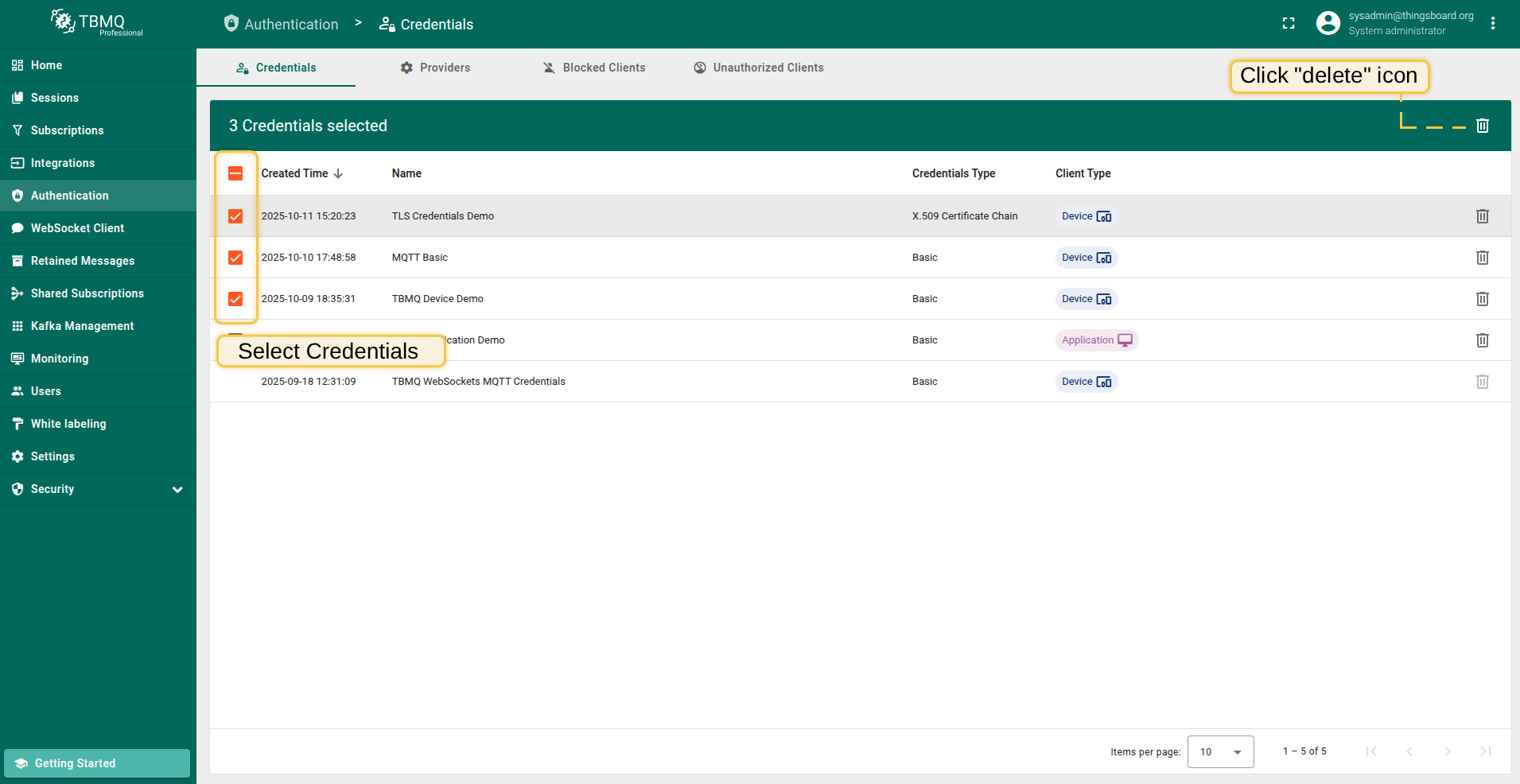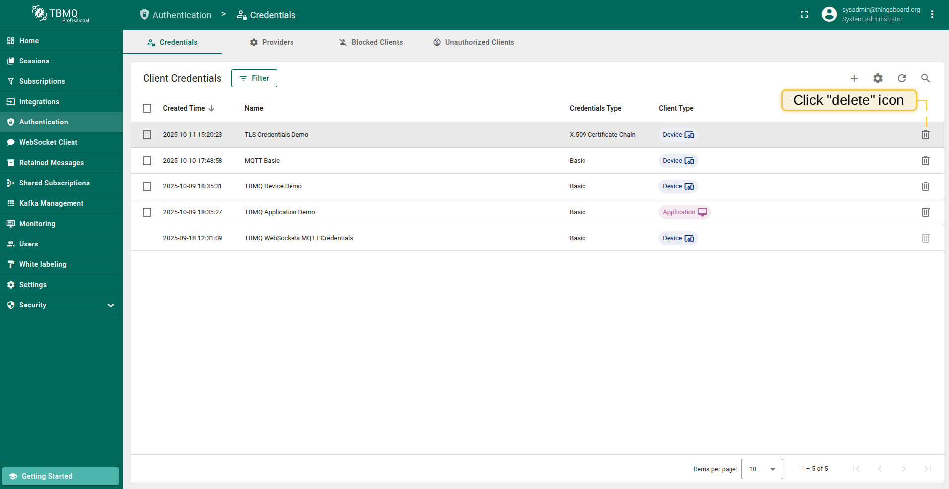 Broker administrators can remove client credentials from TBMQ system using the Web UI or REST API.
