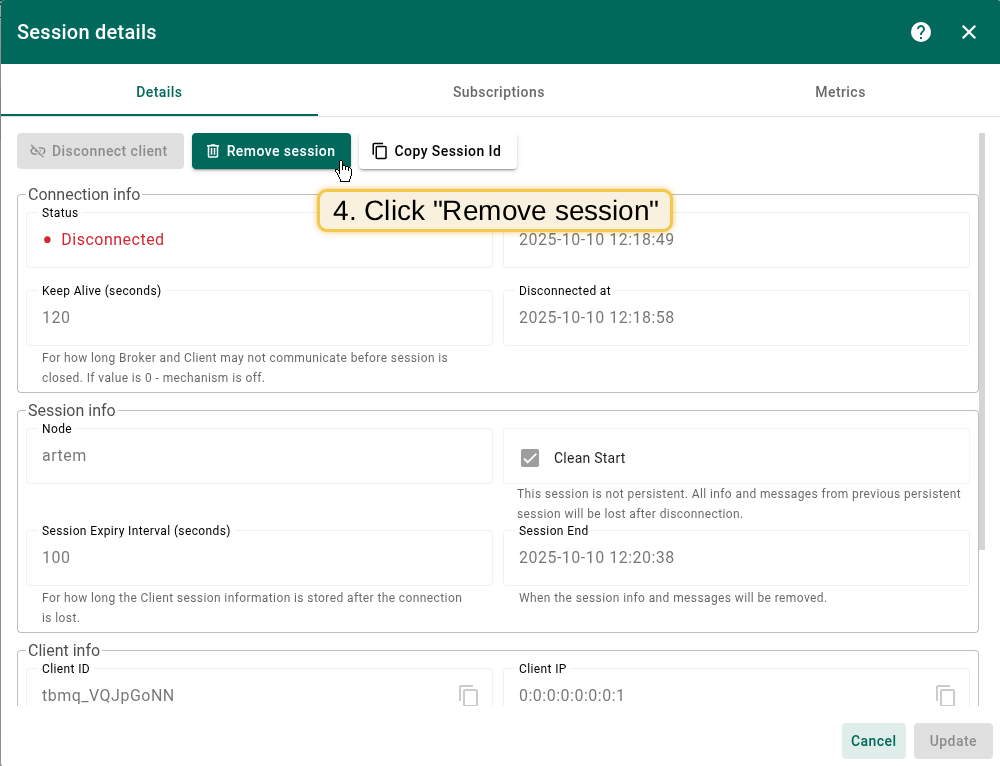 - Session end - for persistent disconnected clients, when the session info and messages will be removed.