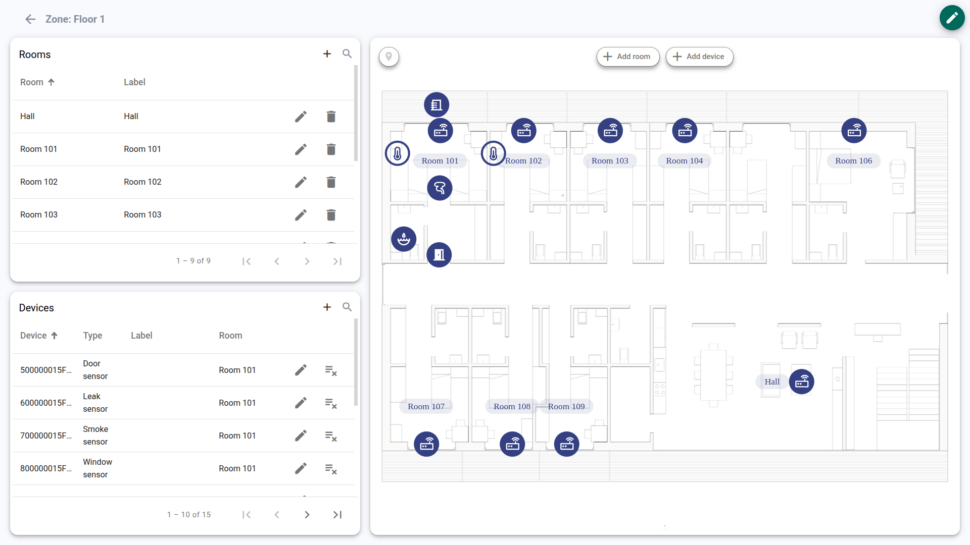 • Dashboard visualization – A facility administration dashboard for monitoring residents, rooms, alarms, and for managing zones/rooms/device assignments.