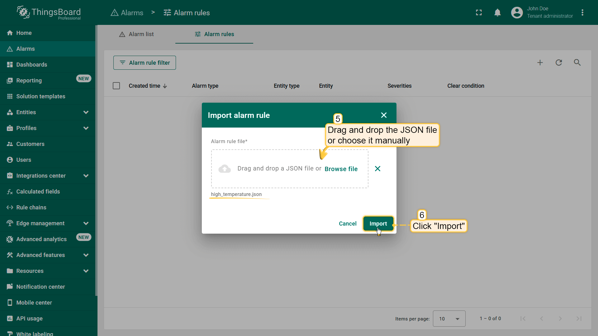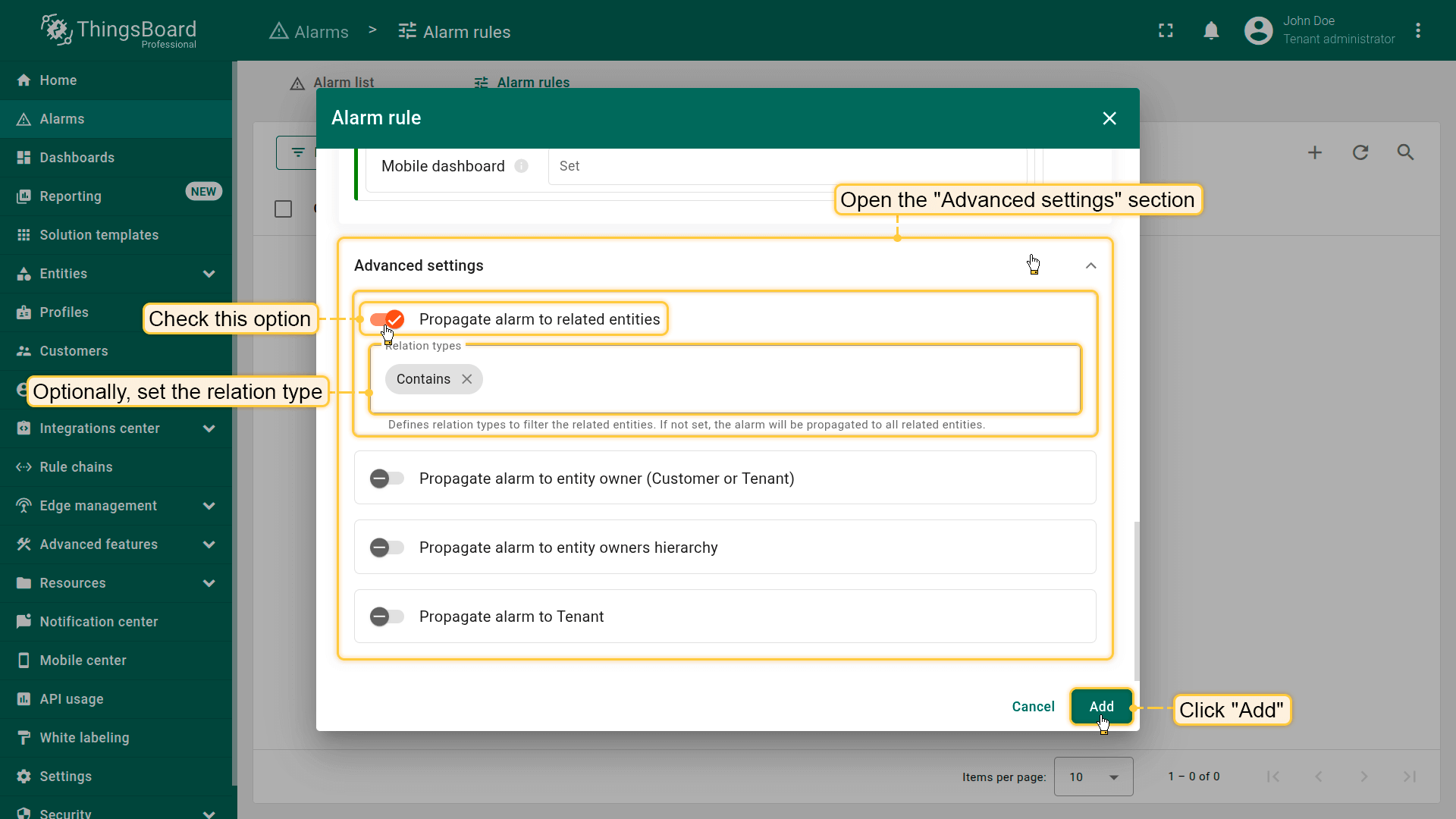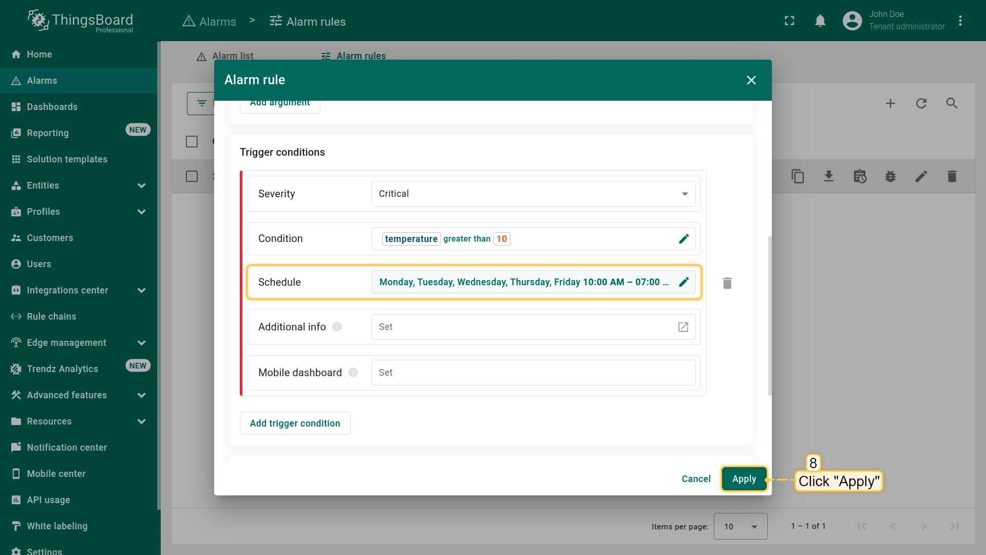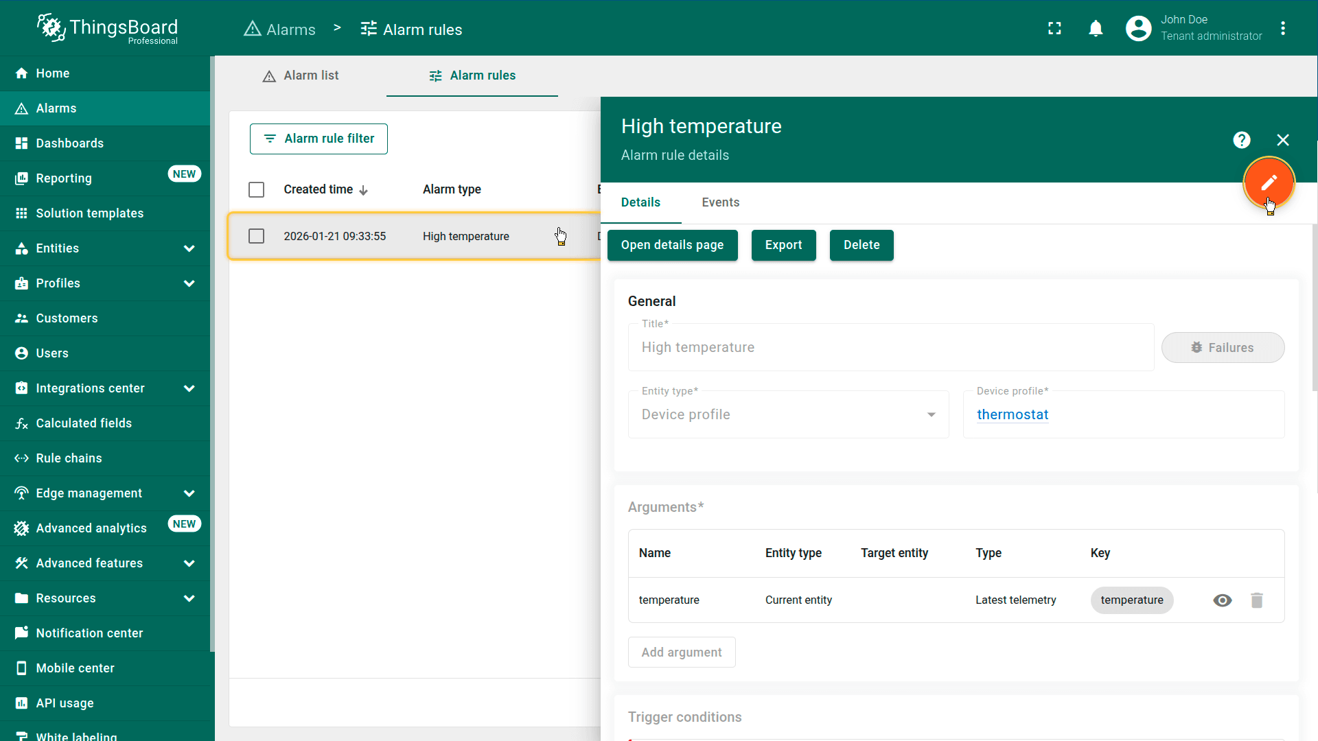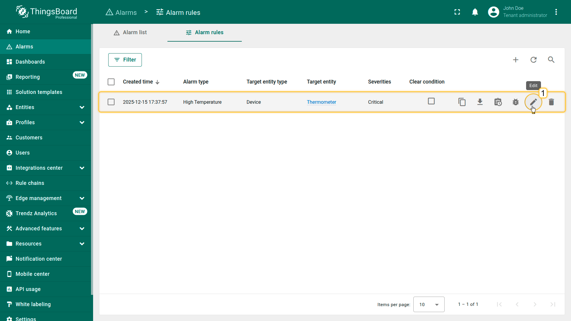 Recommendation: Create alarm rules in Device profiles or Asset profiles to avoid duplicating configurations across multiple entities.