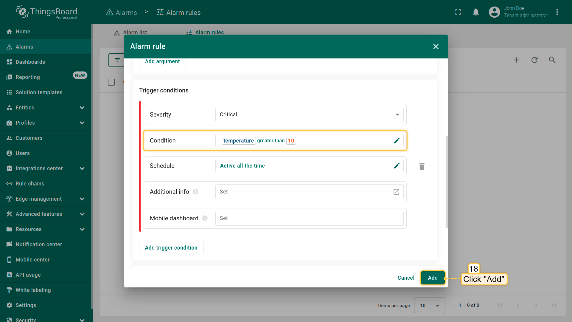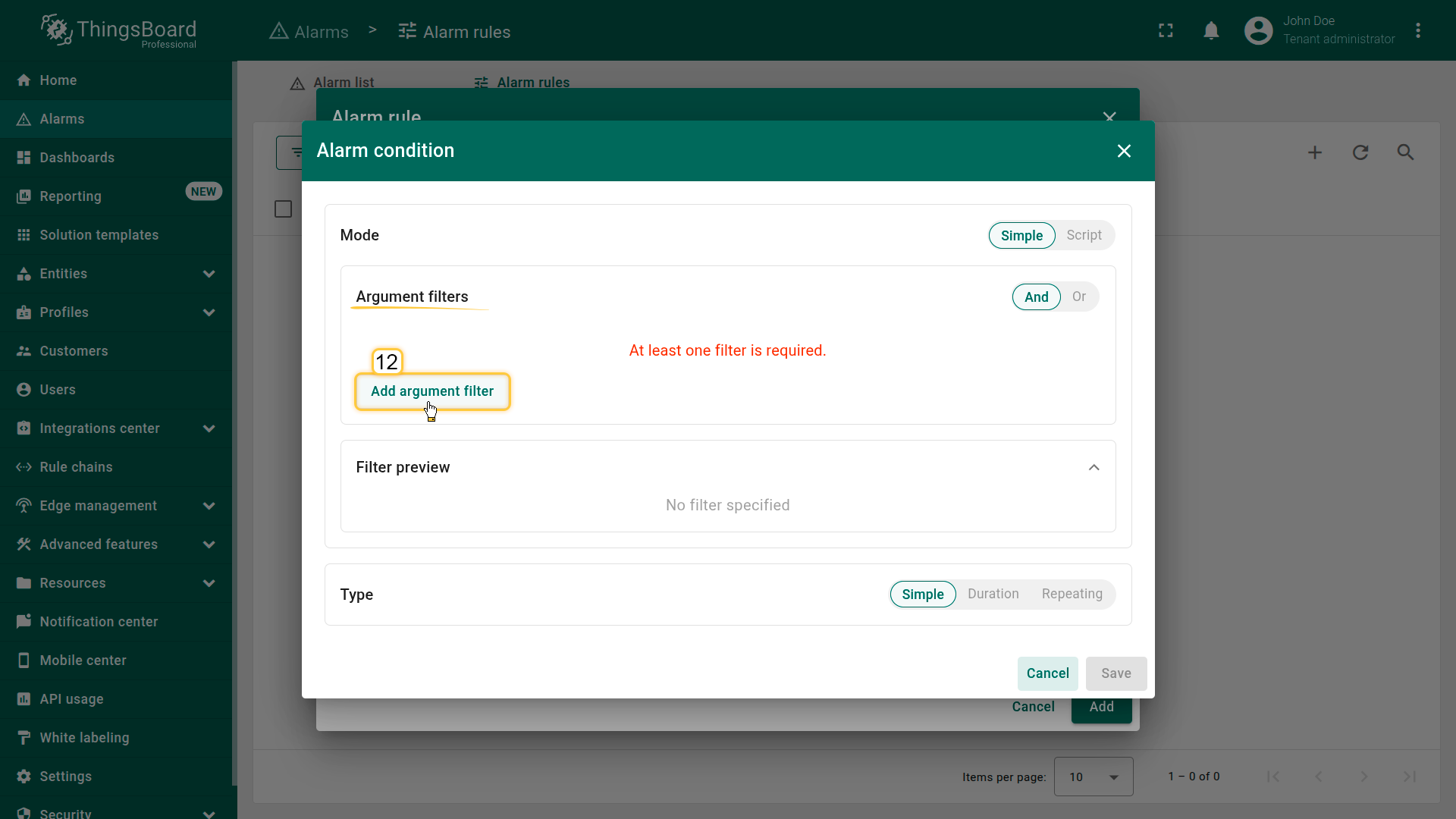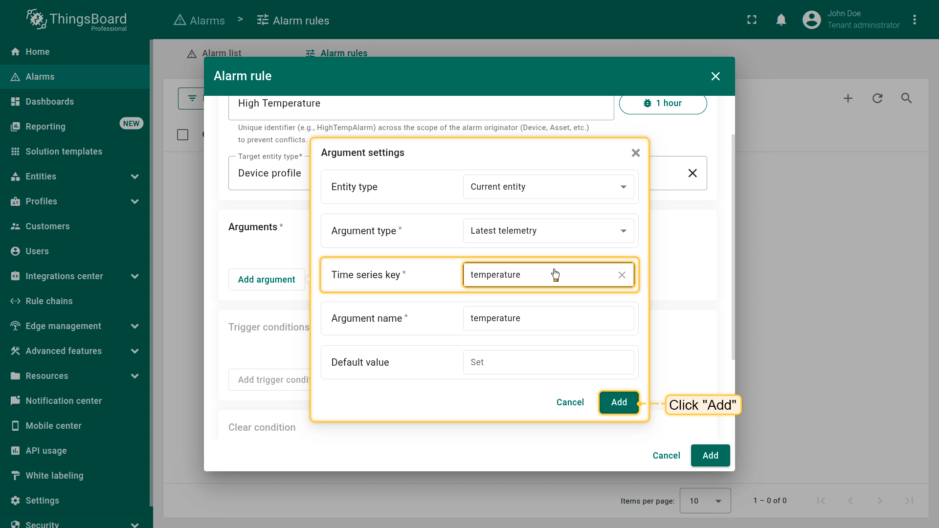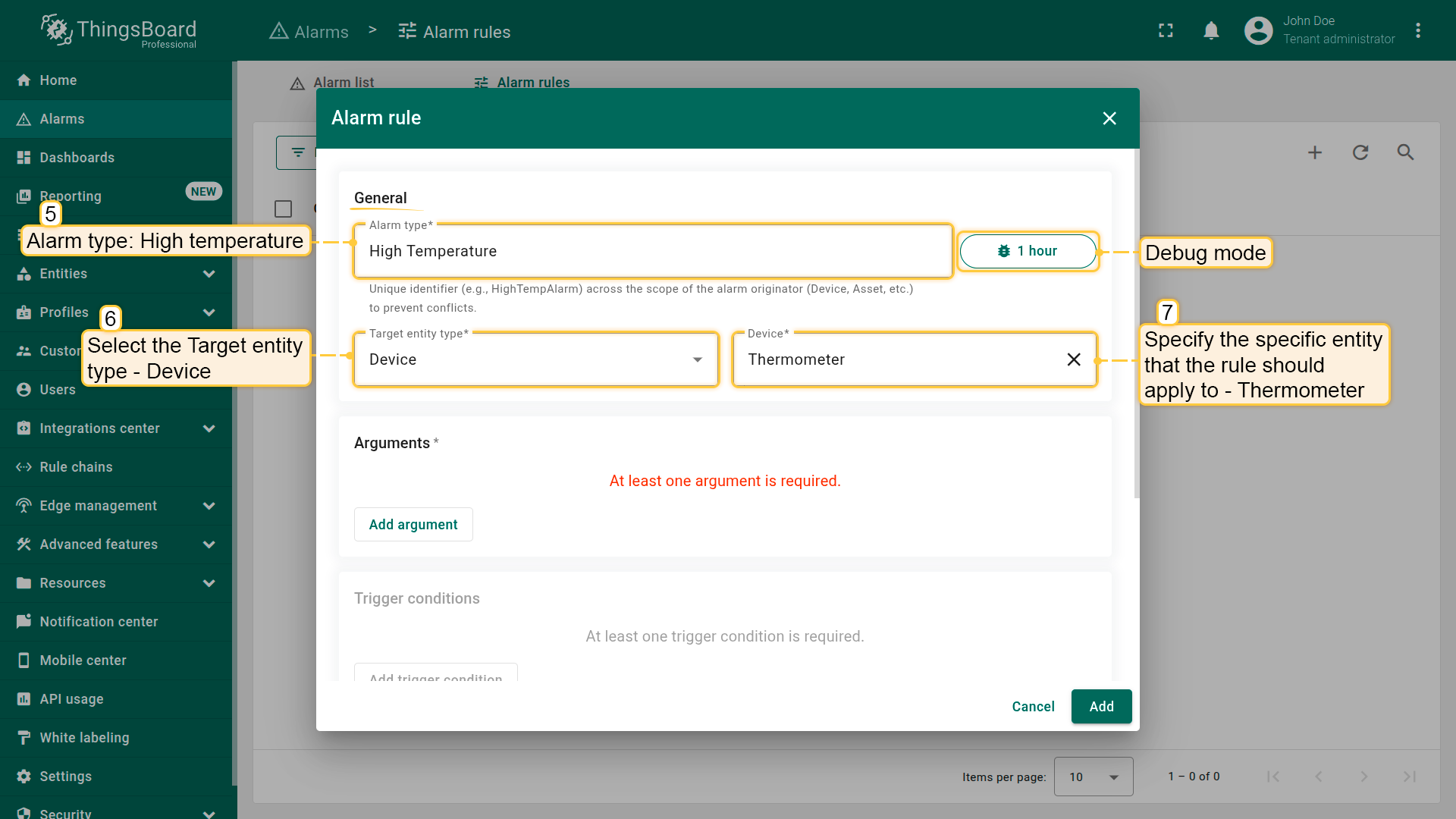 Note: The process of creating an alarm rule is the same for Devices, Assets, Device profiles, Asset profiles, and Customers.