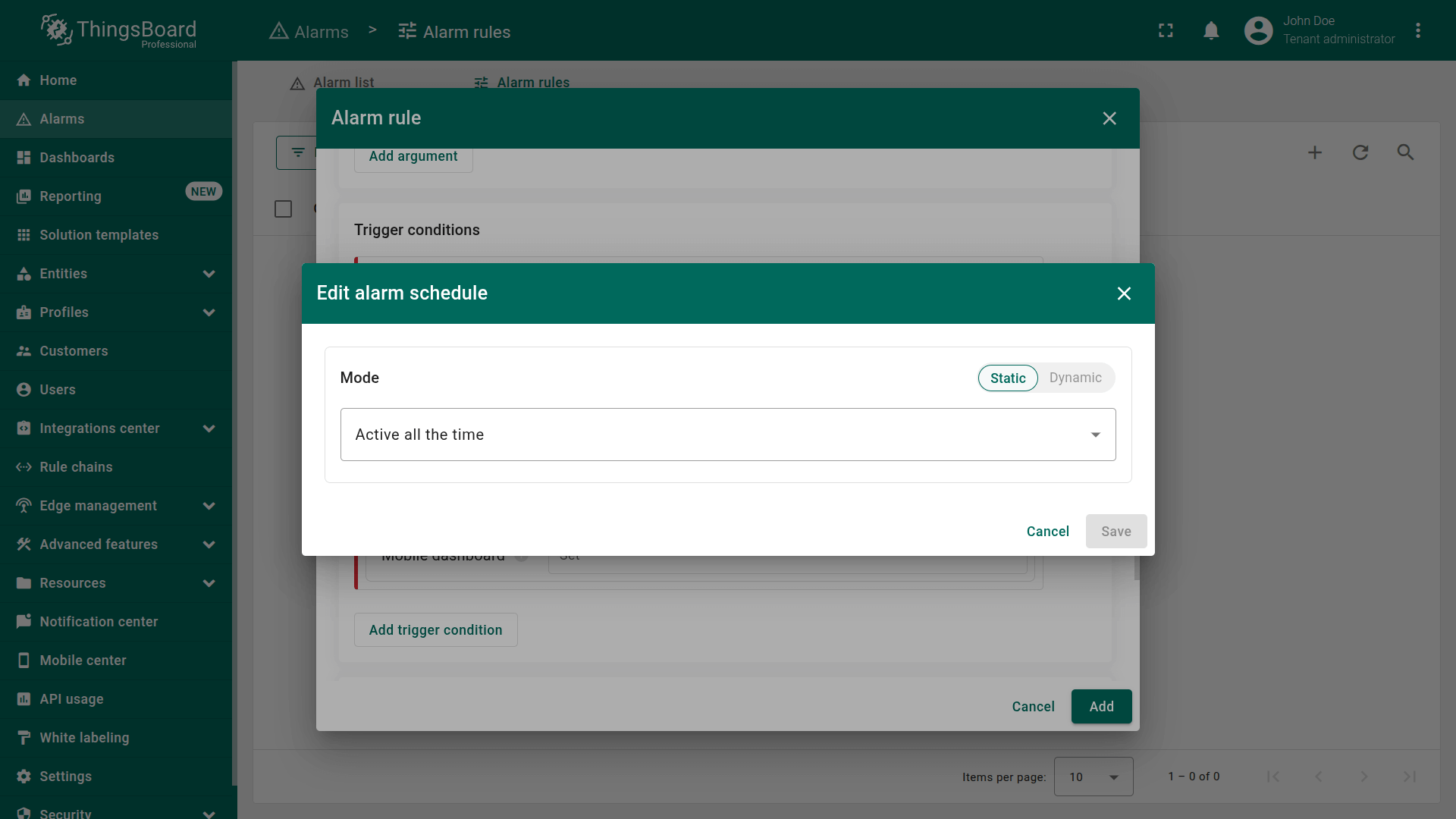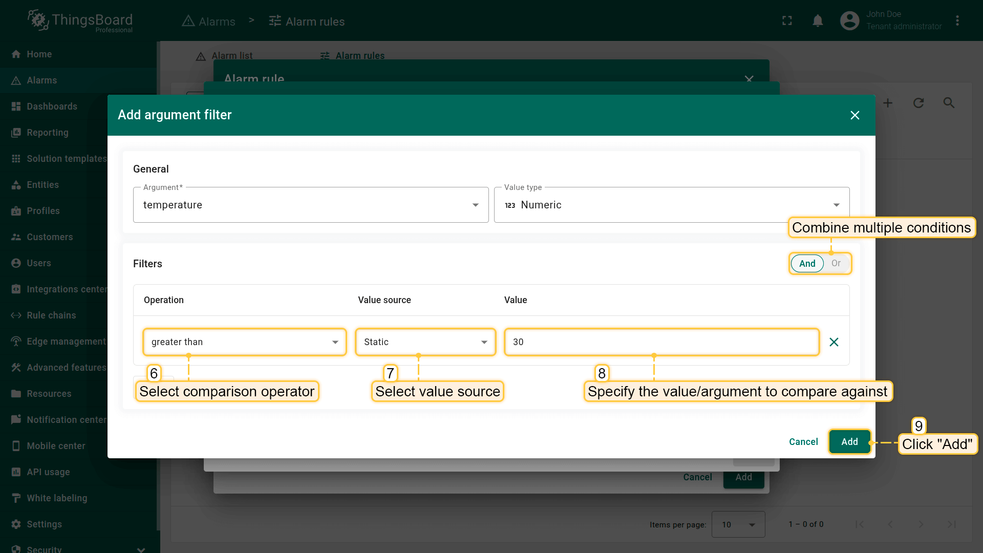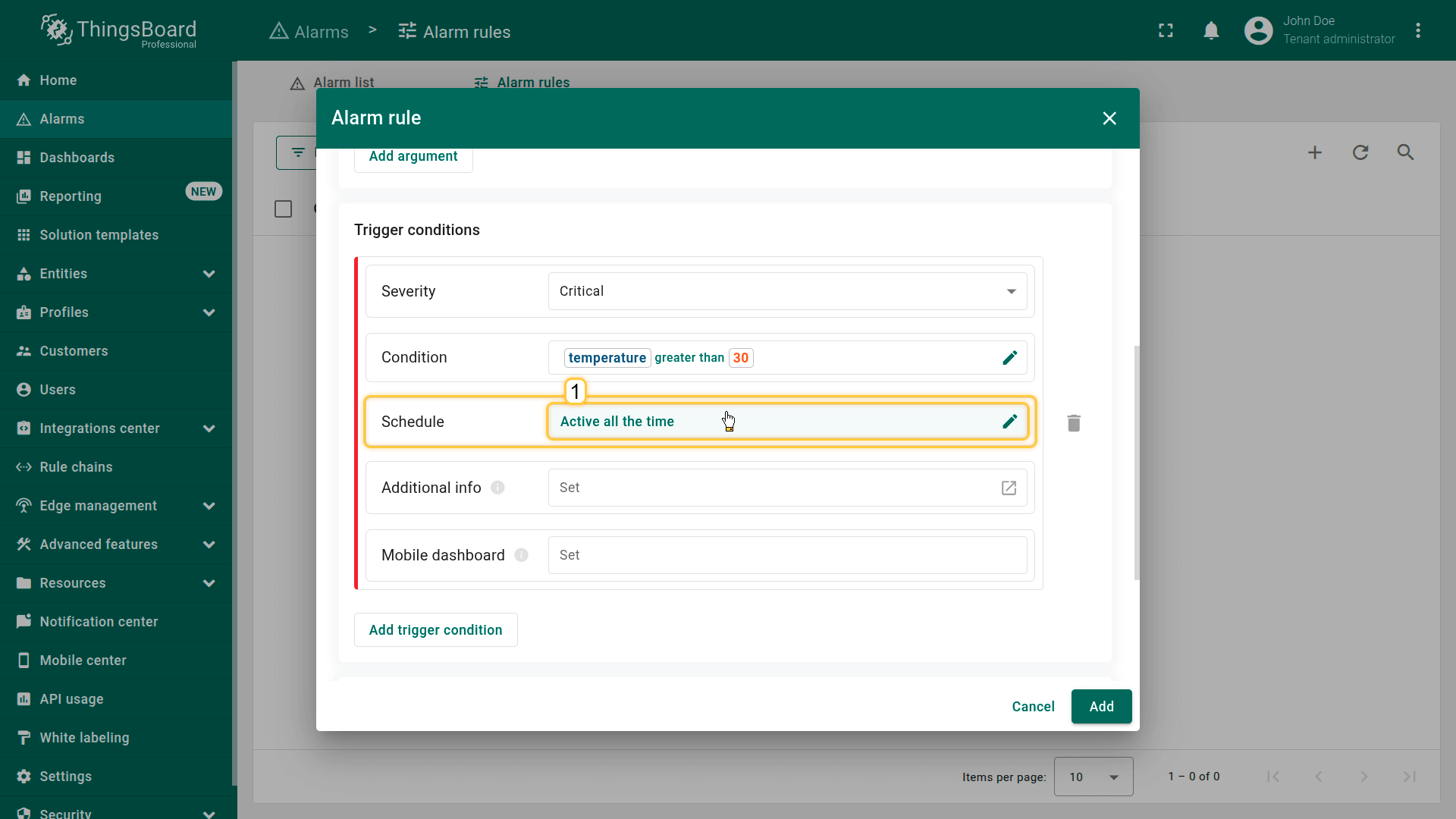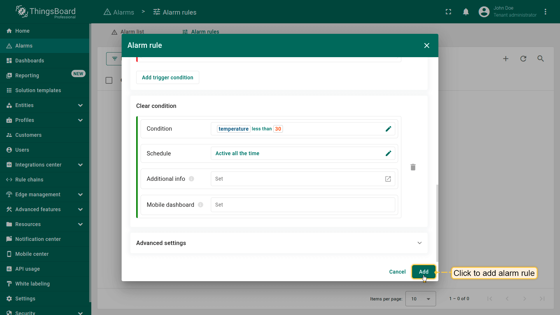 Note: The process of creating an alarm rule is the same for Devices, Assets, Device profiles, Asset profiles, and Customers.
